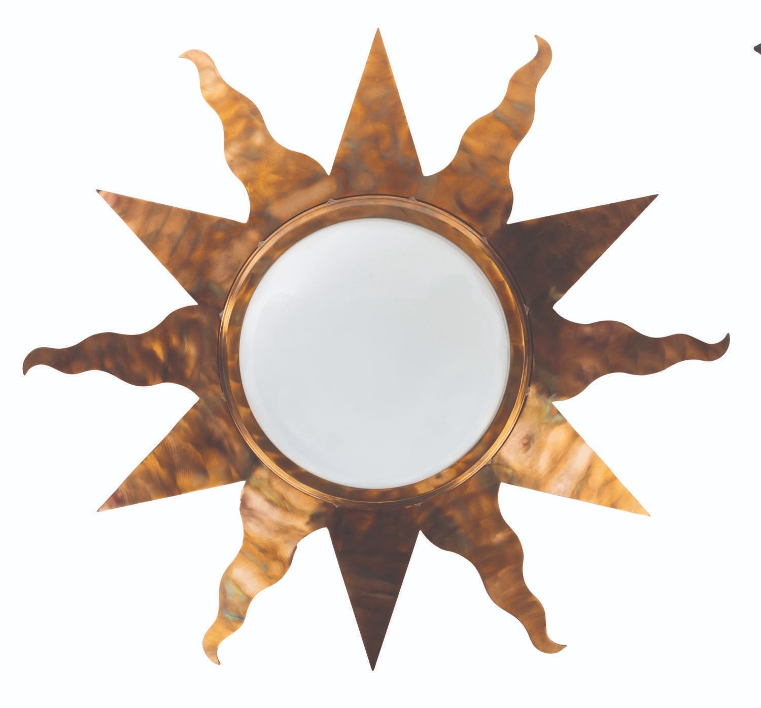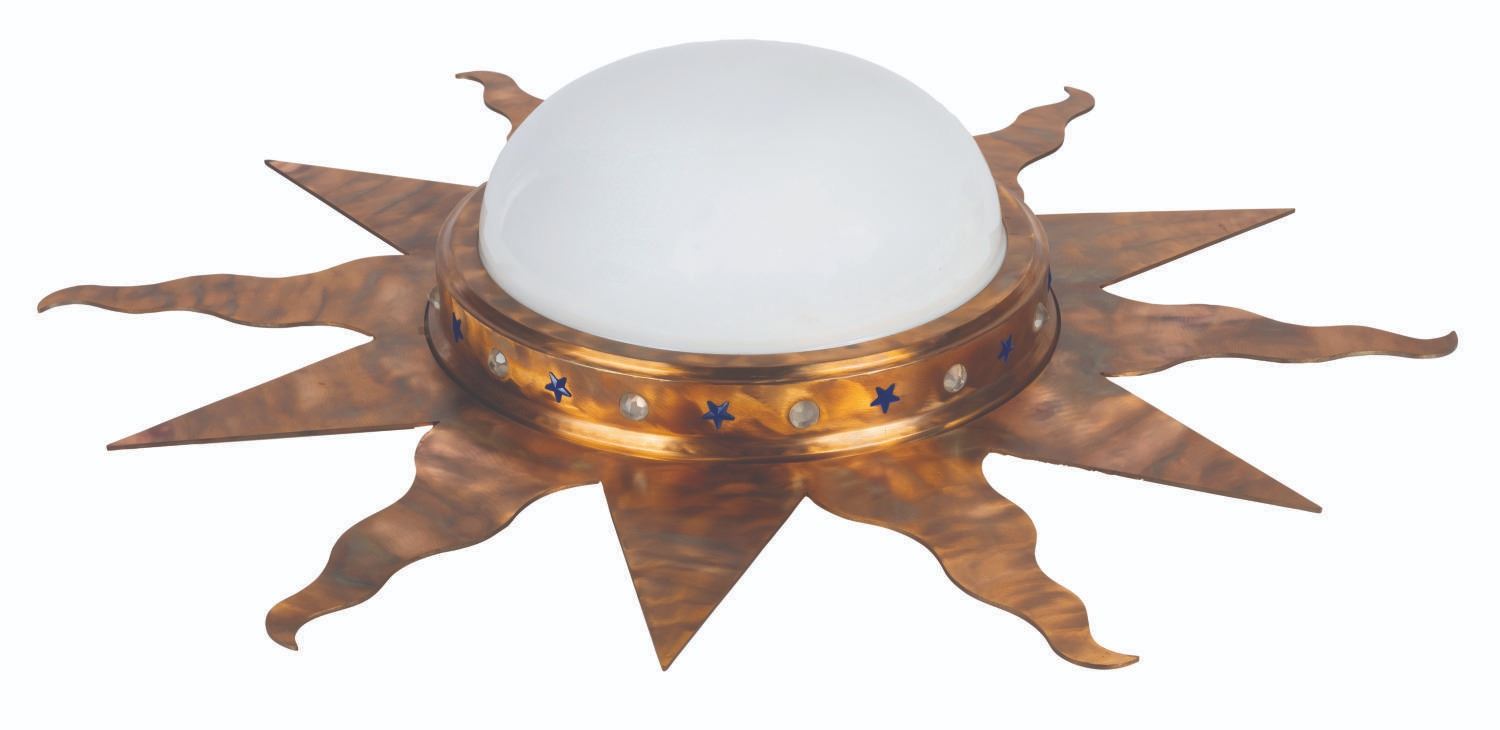 (Disney Store, 1990s-2000s) A retired sun-shaped ceiling light fixture from The Disney Store. The metallic and glass fixture has two sockets and was designed to be suspended by three chains, tethered to gravity bolts. The lamp glass measures 13.75" in diameter and 4.75" deep. Measuring 36" and 7.75" deep, the entire lamp displays in fine store-used condition, exhibiting slight wear from use. Due to size and weight, this item will require special shipping arrangements. Please inquire before bidding.