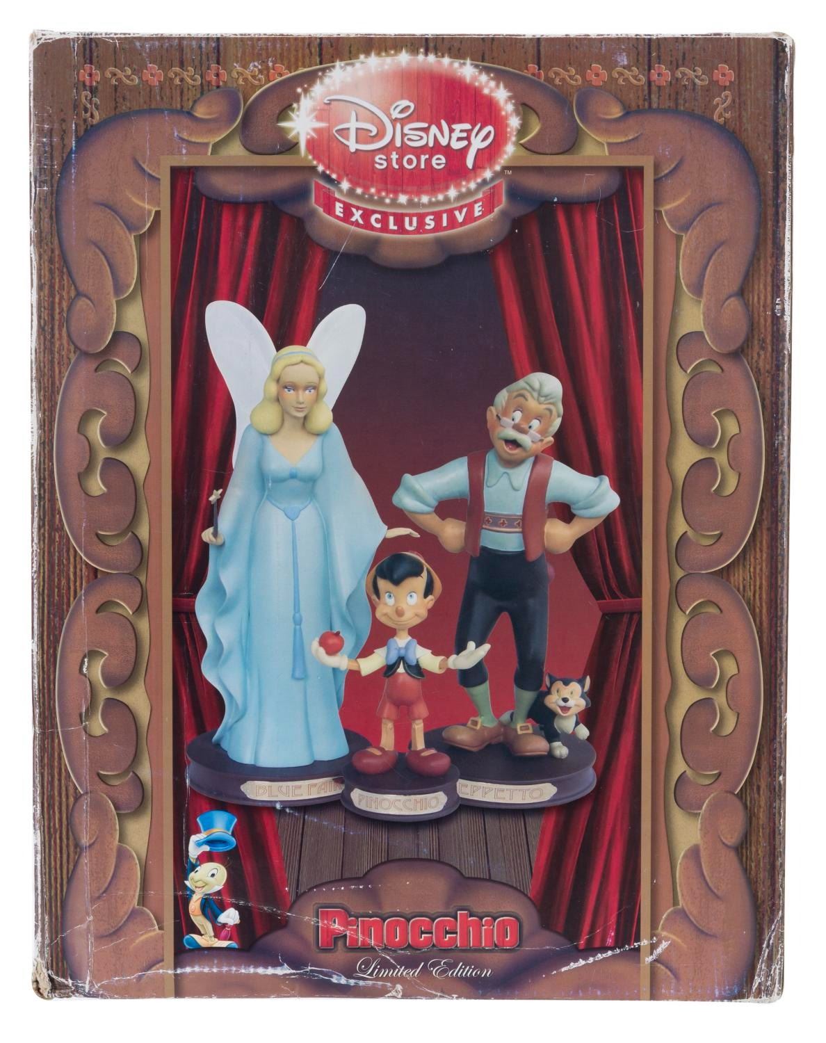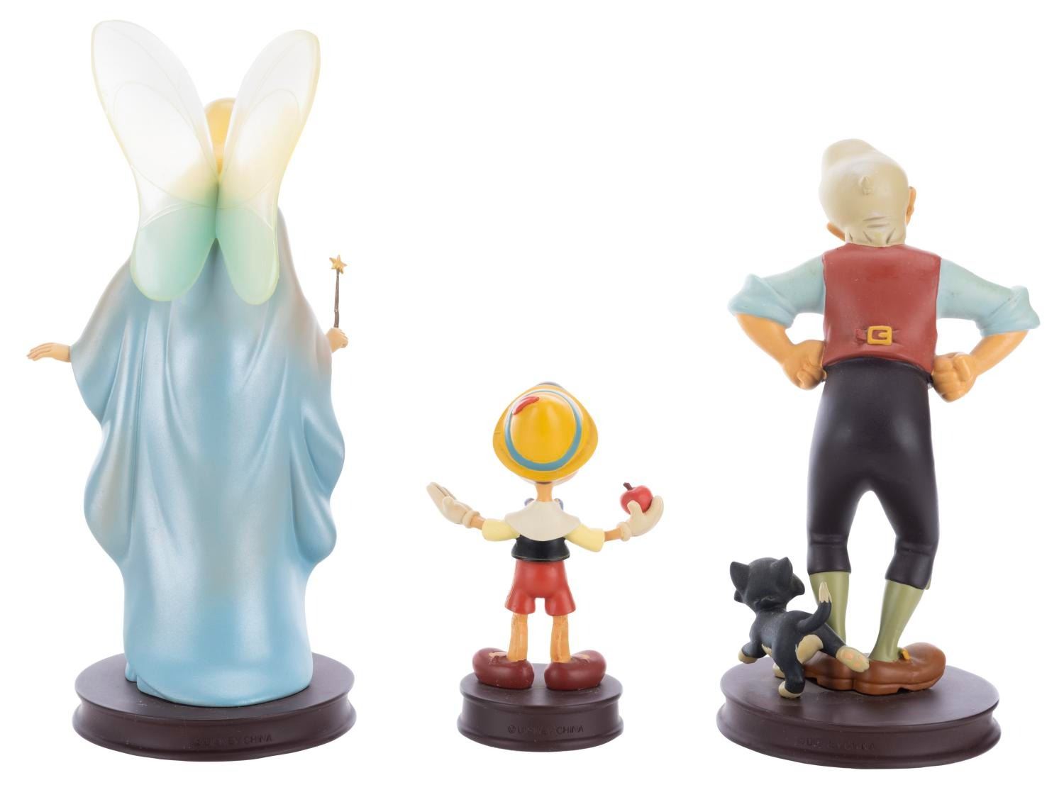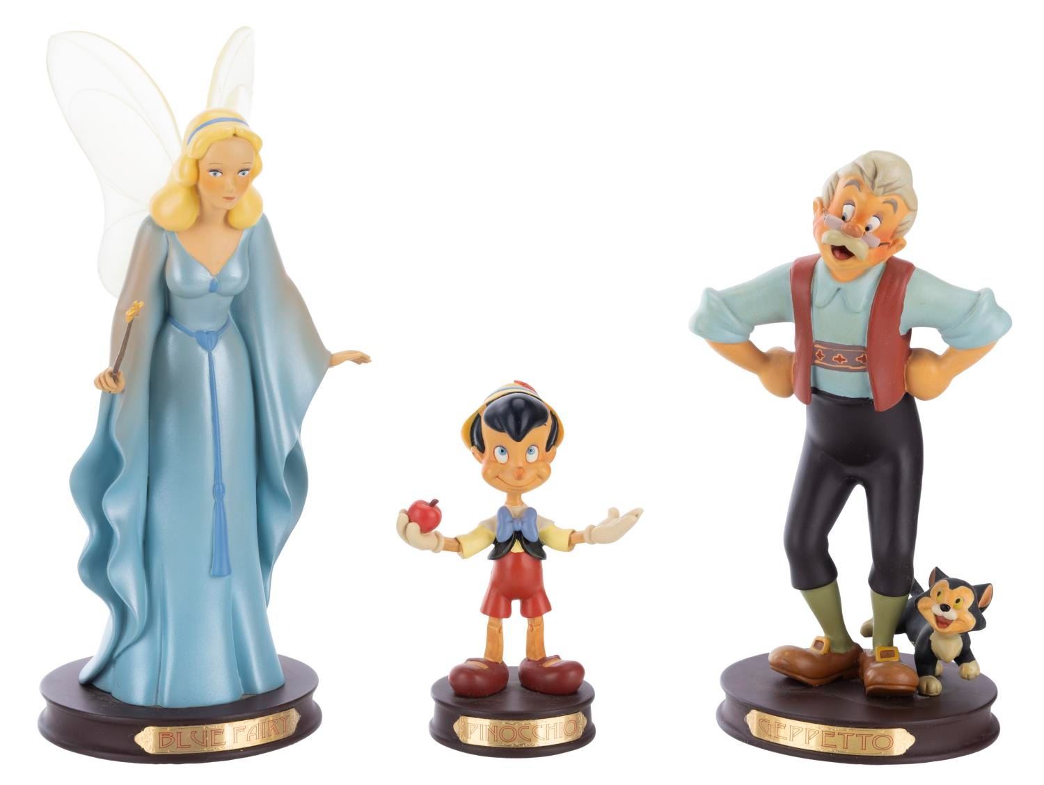 (Disney Store, 2009) A set of Pinocchio figurines exclusive to the Disney Store and featuring Pinocchio, the Blue Fairy, Geppetto, and Figaro. The limited edition set measures from the 3.25" x 5" tall Pinocchio to the 4.5" x 9.5" Blue Fairy, the set is in very good to good condition with scratches to the nameplates, staining and smudging to the reverse of Geppetto, a small mark on Pinocchio's stomach, and a repair by a previous owner to the Blue Fairy's wand.