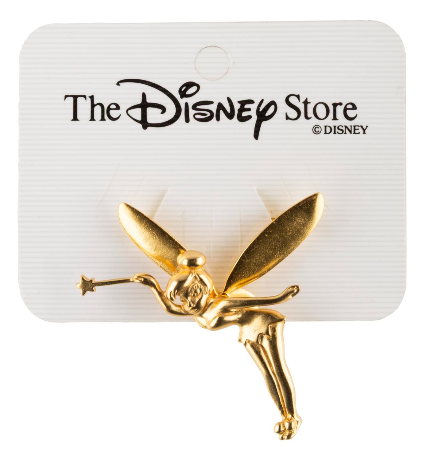 (Disney Store, 1990s-2000s) A gold-toned brooch of Tinker Bell from "Peter Pan," witha a spring attaching her wings so the figure will move while worn. Measuring 2.5" x 2.5" the brooch is in very good condition with light handling wear.
