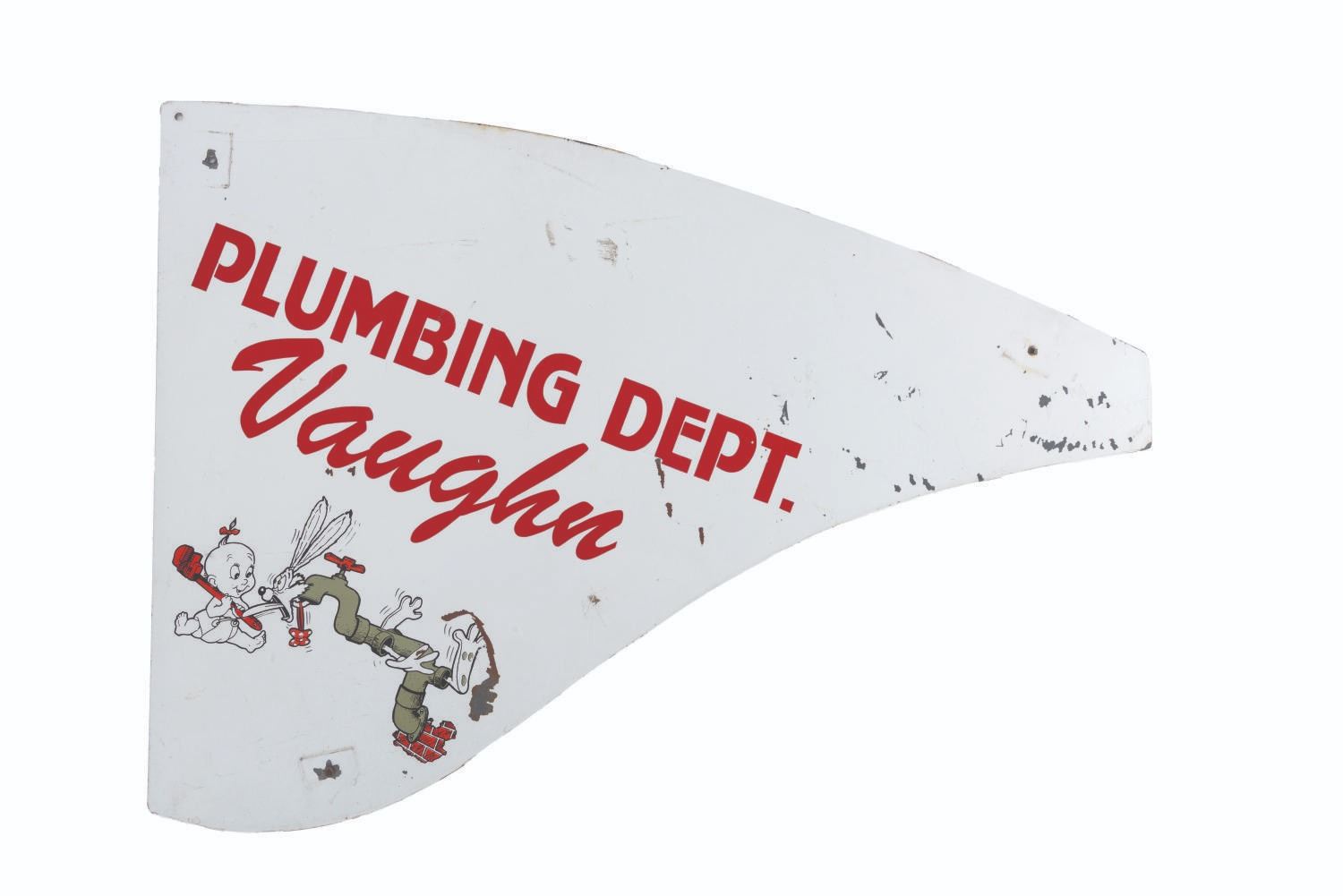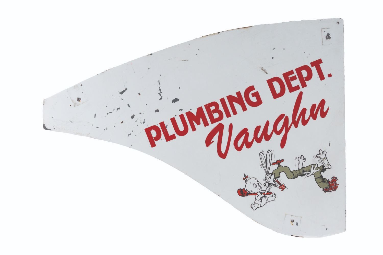 (Disney, 1980s-90s) A Disney Studio Plumbing Department bicycle shield featuring Baby Herman and Roger Rabbit. These types of shields were seen on bicycles ridden by Cast Members around the Studio, with this one attributed to "Vaughn." Measuring 15" x 22", the "Who Framed Roger Rabbit"-themed piece is in good condition with scuffs throughout, light stains, and wear from use.