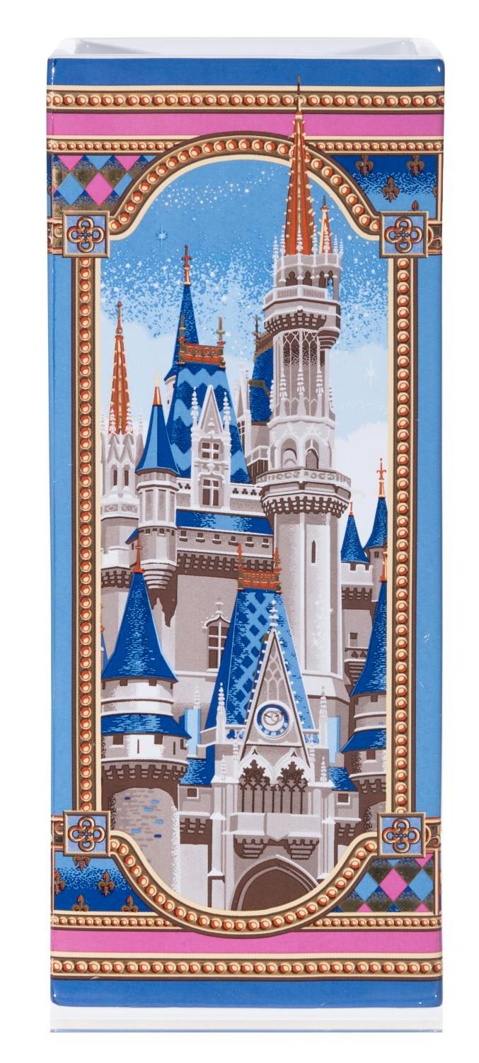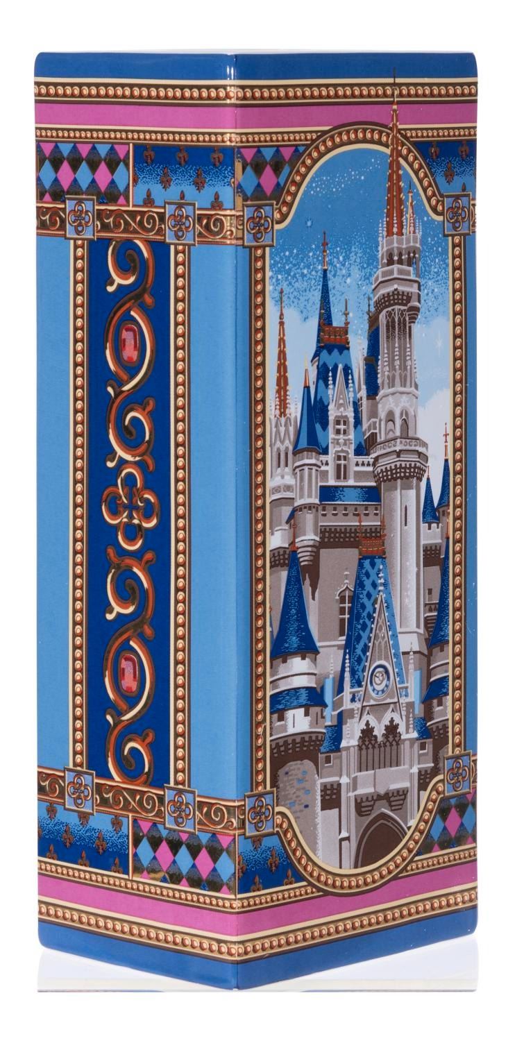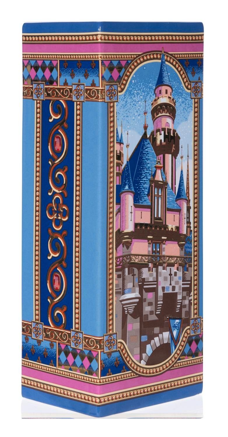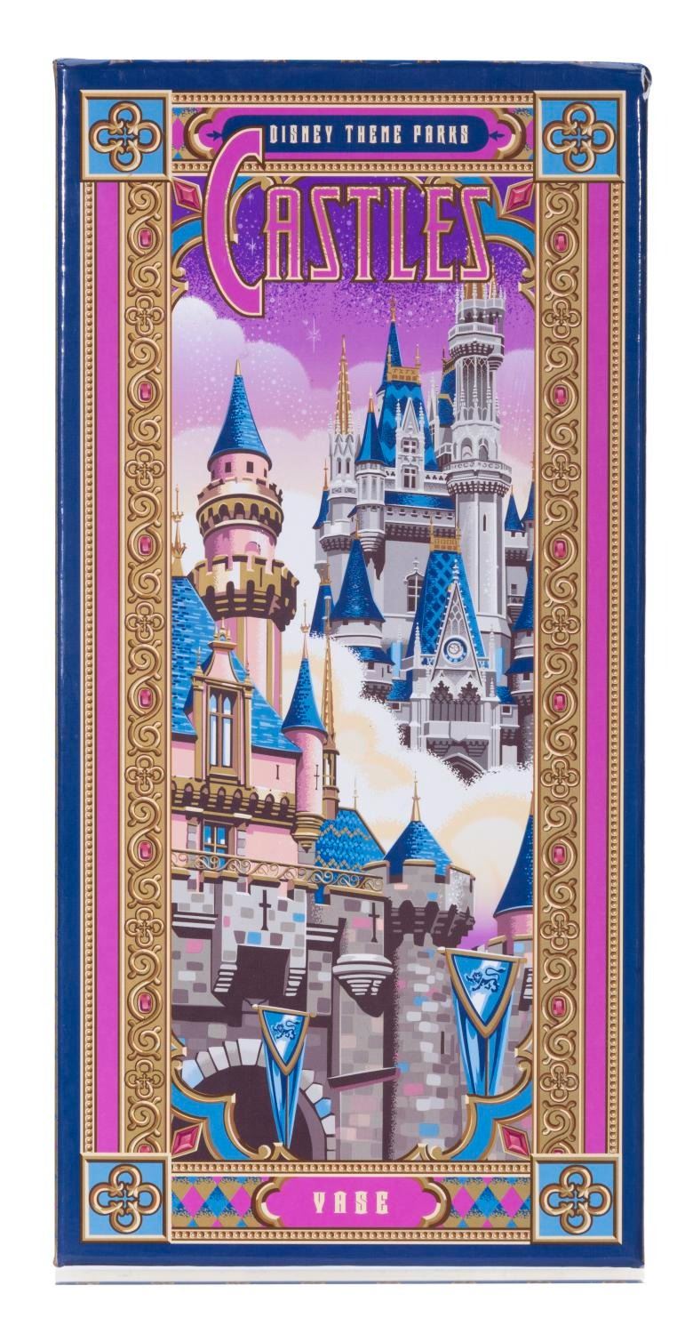 (Disney Parks, 2010s) A vase designed by Jeff Granito for Disney Theme Parks depicting Sleeping Beauty Castle at Disneyland and Cinderella Castle at the Magic Kingdom within regal gold-toned edging. Measuring 4"x3"x9.75", the decorative vase is in fine condition in its original 5.75"x11.5"x4.75" box.