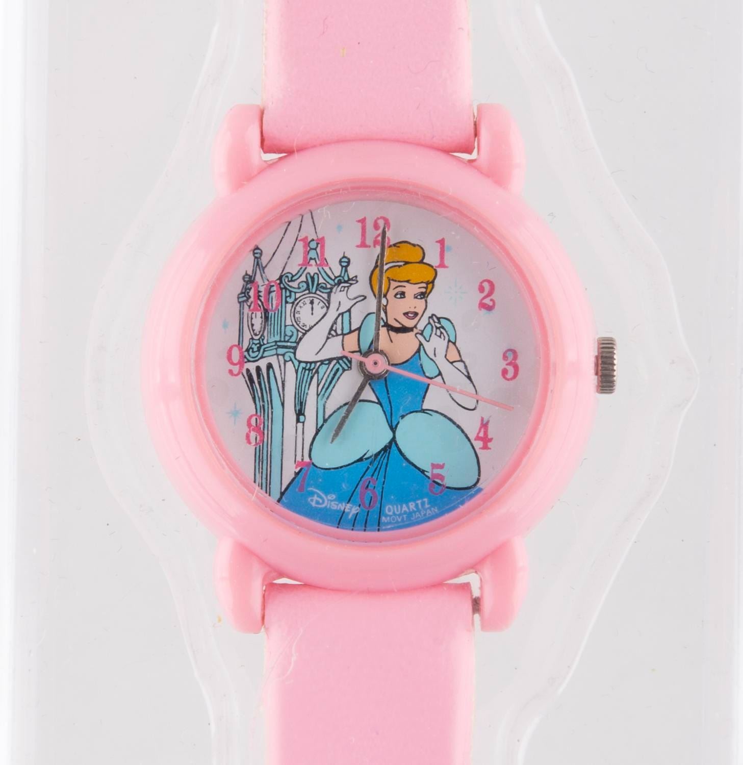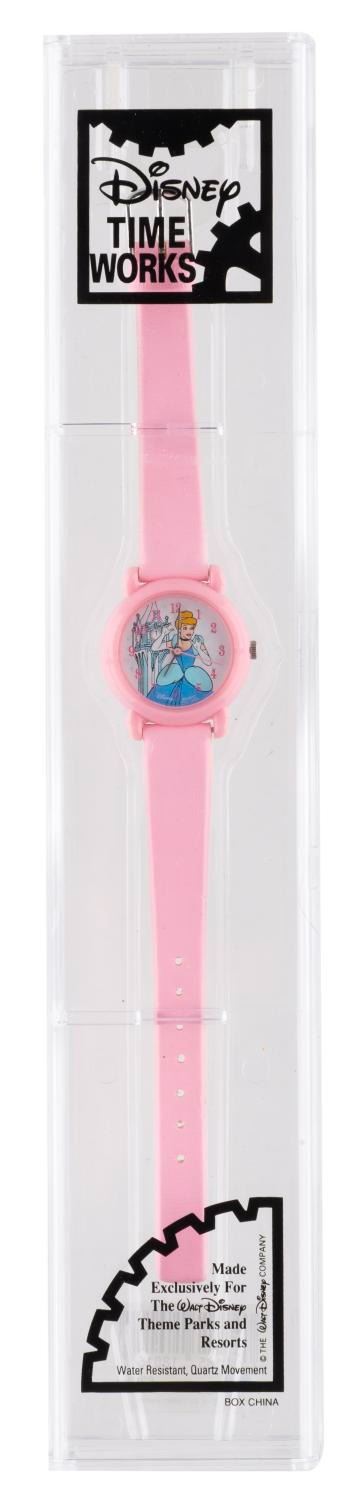 (Disney Timeworks, 1990s) A children’s "Cinderella " wristwatch, exclusively available at Walt Disney Theme Parks and Resorts. Measuring 1.25 " in diameter with an 8 " band, the watch is in fine, as-new condition with the original box, requiring a battery and possibly service to function. The original box exhibits light wear from handling and age.