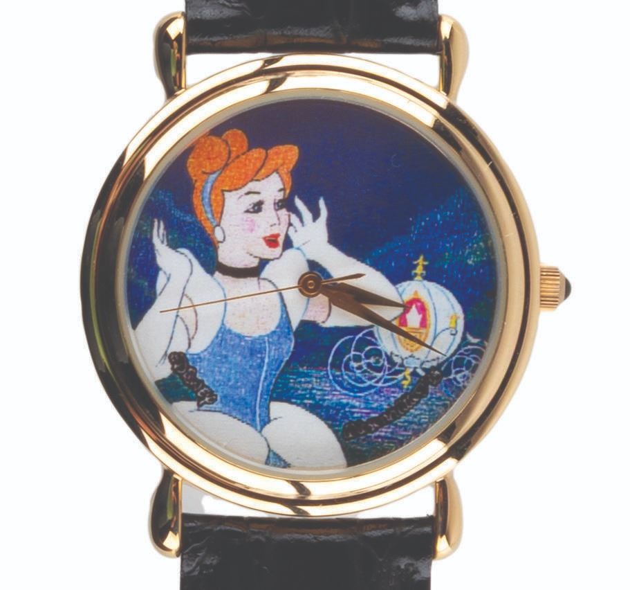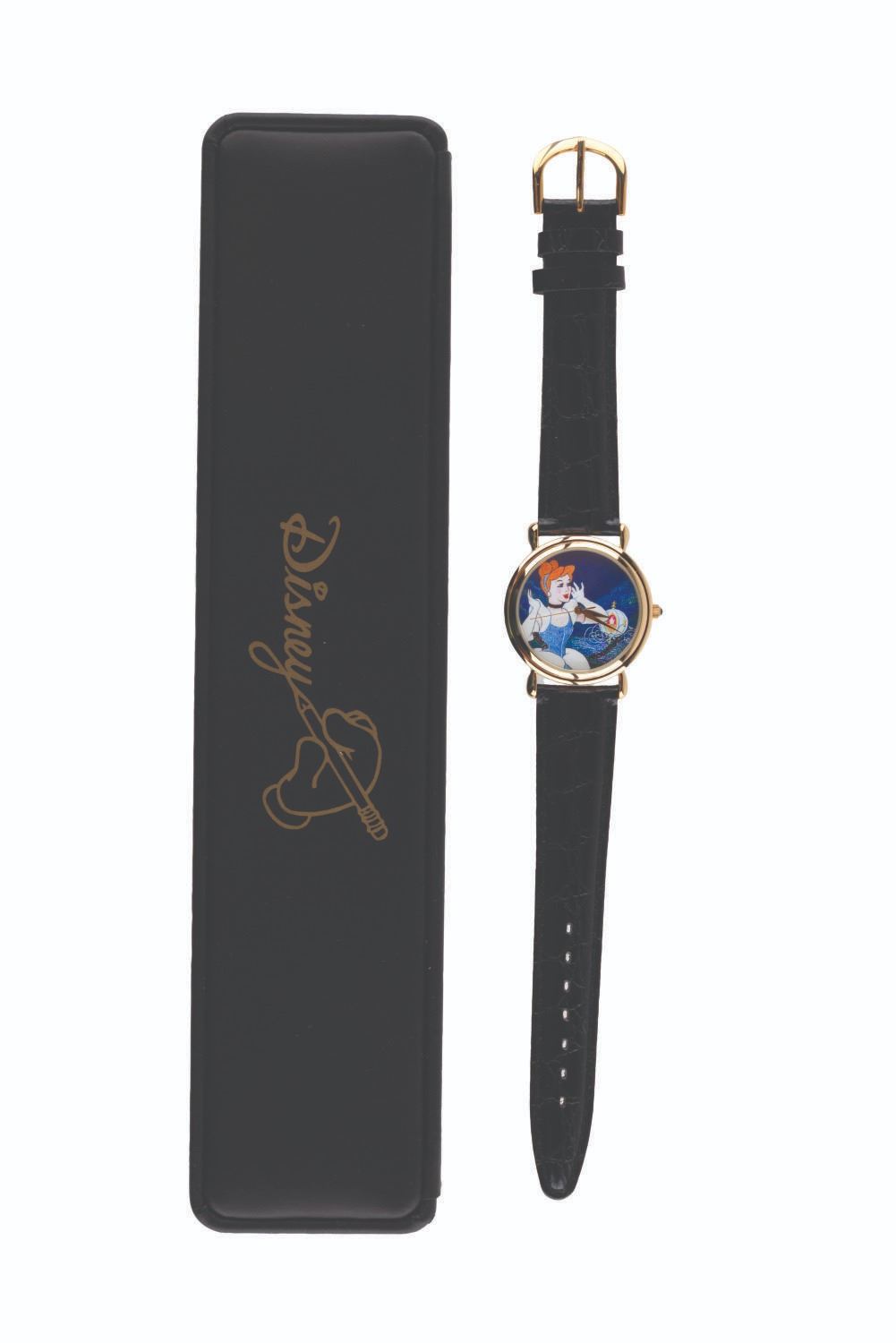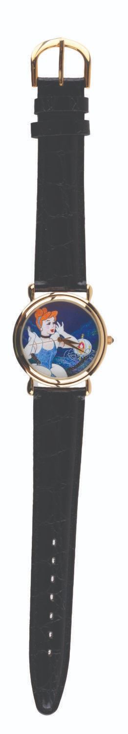 (Disney Timeworks, 1990s) A "Cinderella " wristwatch. Measuring 1.25 " x 9.25 ", the watch is in fine, as-new condition with the original box, requiring a battery and possibly service to function. The original box exhibits light wear from handling and age.