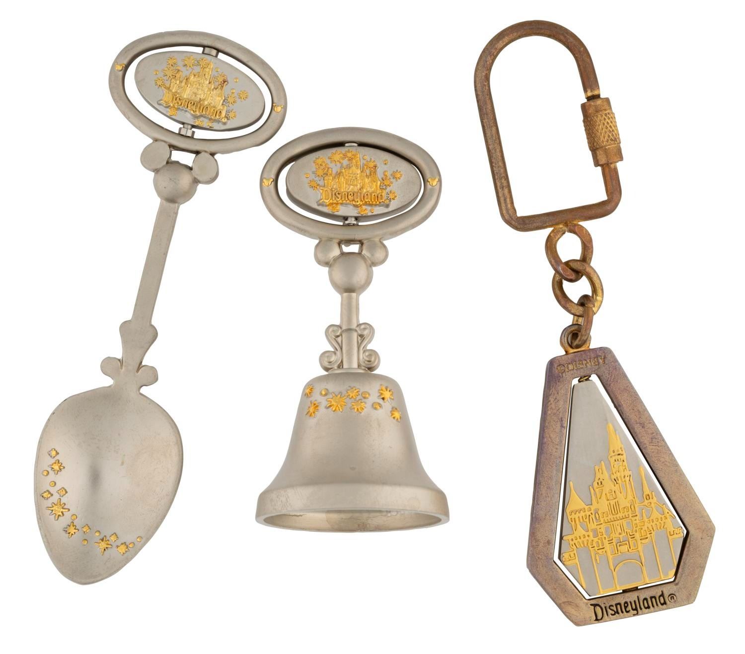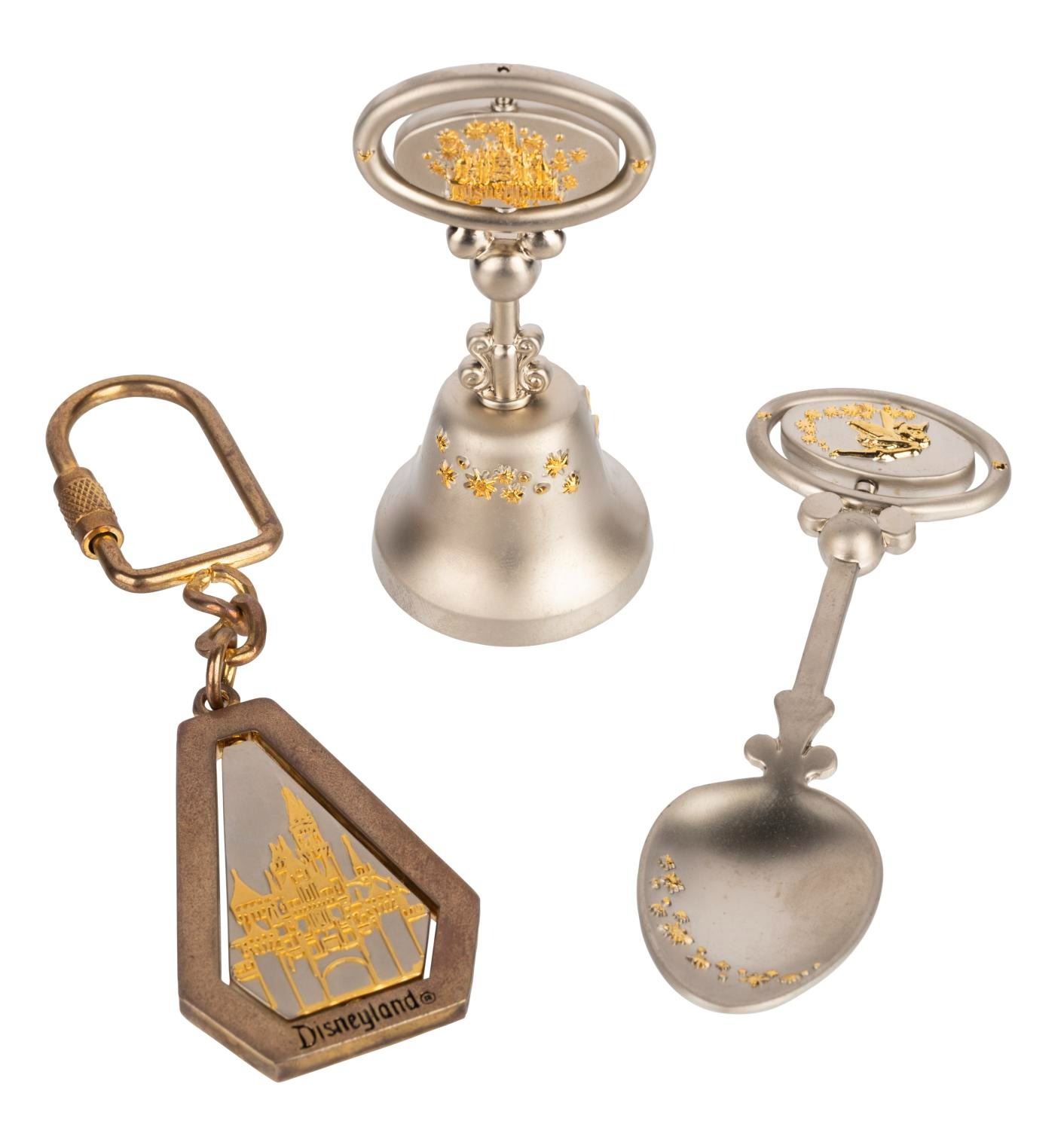 (Disneyland, 1990s) A Disney Treasures Collection spoon, bell, and keyring each featuring a double-sided spinner with Tinker Bell and Sleeping Beauty Castle. The bell measures 3" tall and 1.5" wide, the spoon is 4"x1.25", and the keyring is 1.5"x4.5". Each piece is in fine condition.