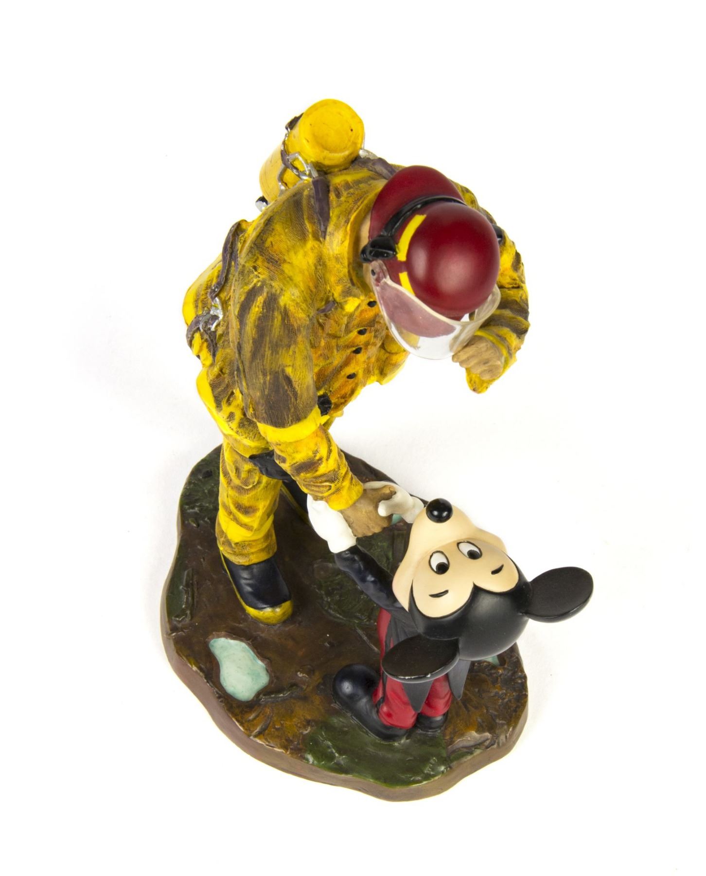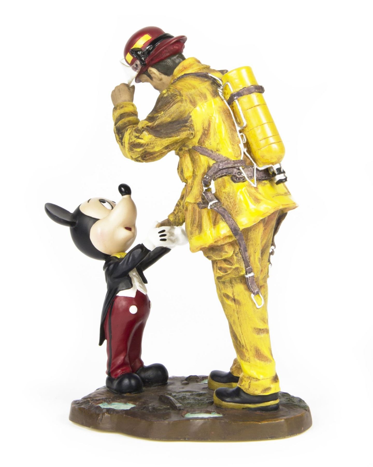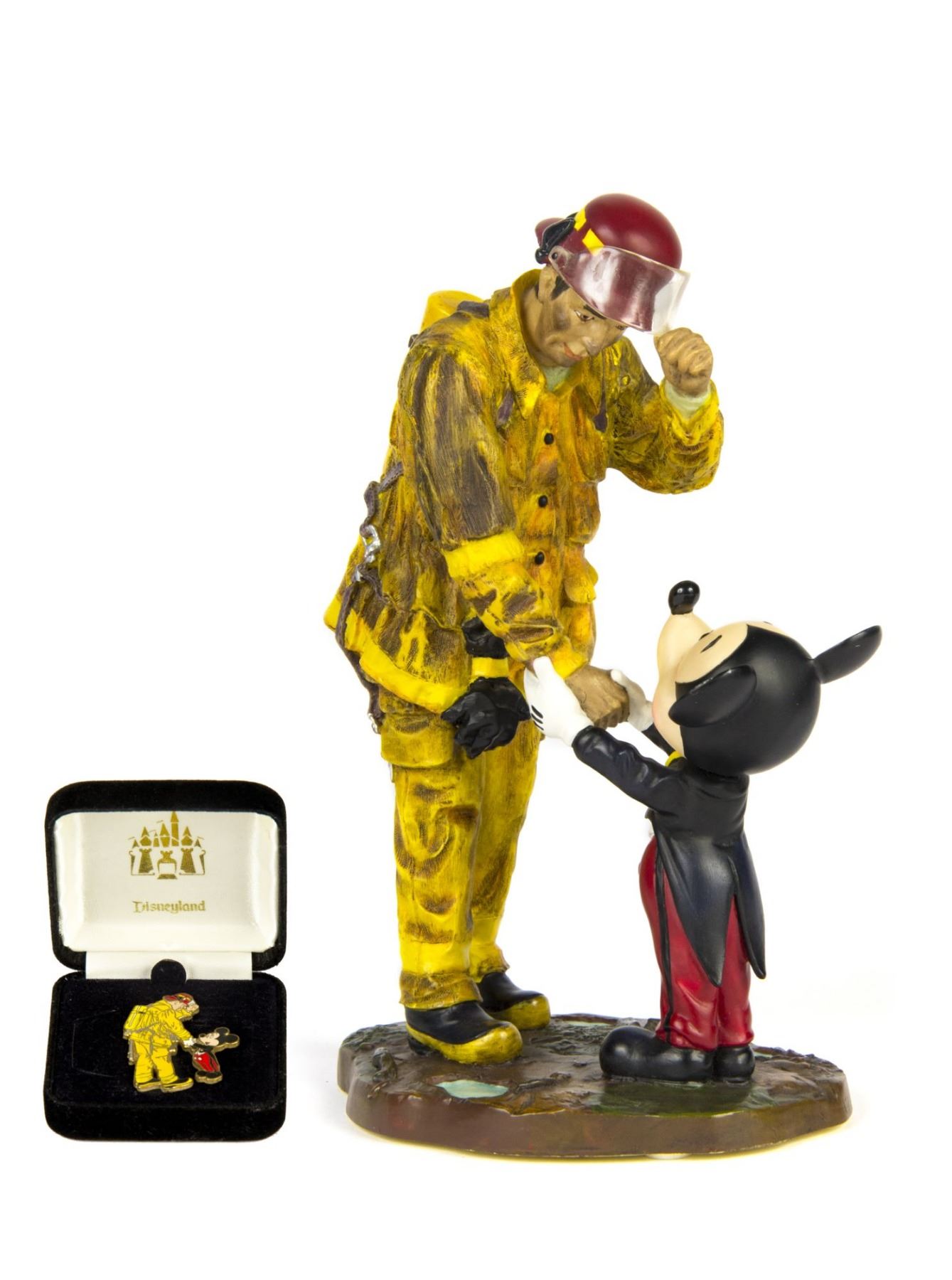(Disneyland, c.2002) A hand-painted resin statue titled "A Disney Tribute to Fire Fighters" that was inspired by the iconic artwork of Charles Boyer. The statue was created exclusively for Disneyland and Walt Disney World, and is paired with an official Disney Pin trading pin which depicts the same scene. The statue measures 7.5" tall and the pin measures 1.75"x1.25" and comes in its original Disneyland box. Both items are in very good condition with little wear.