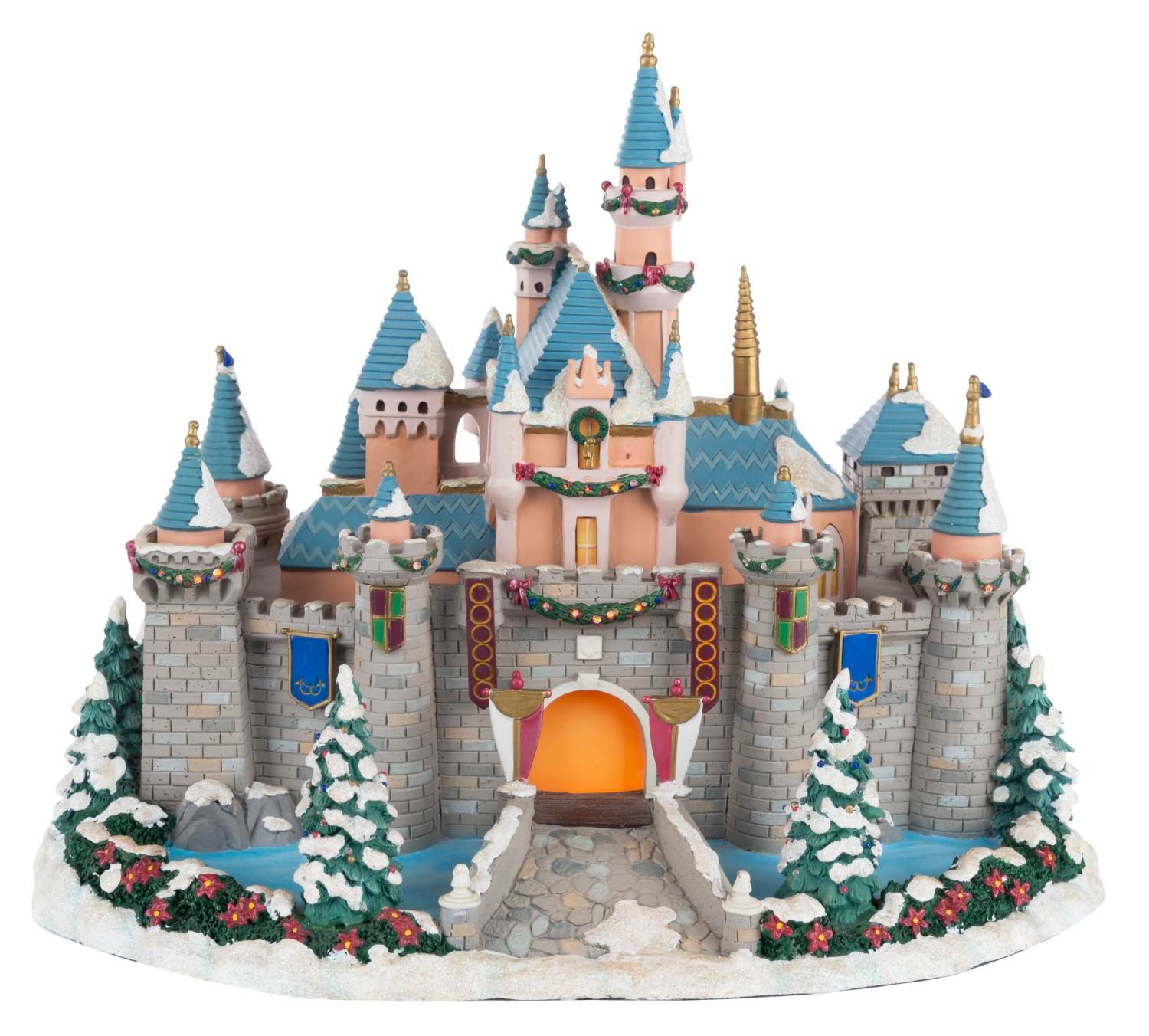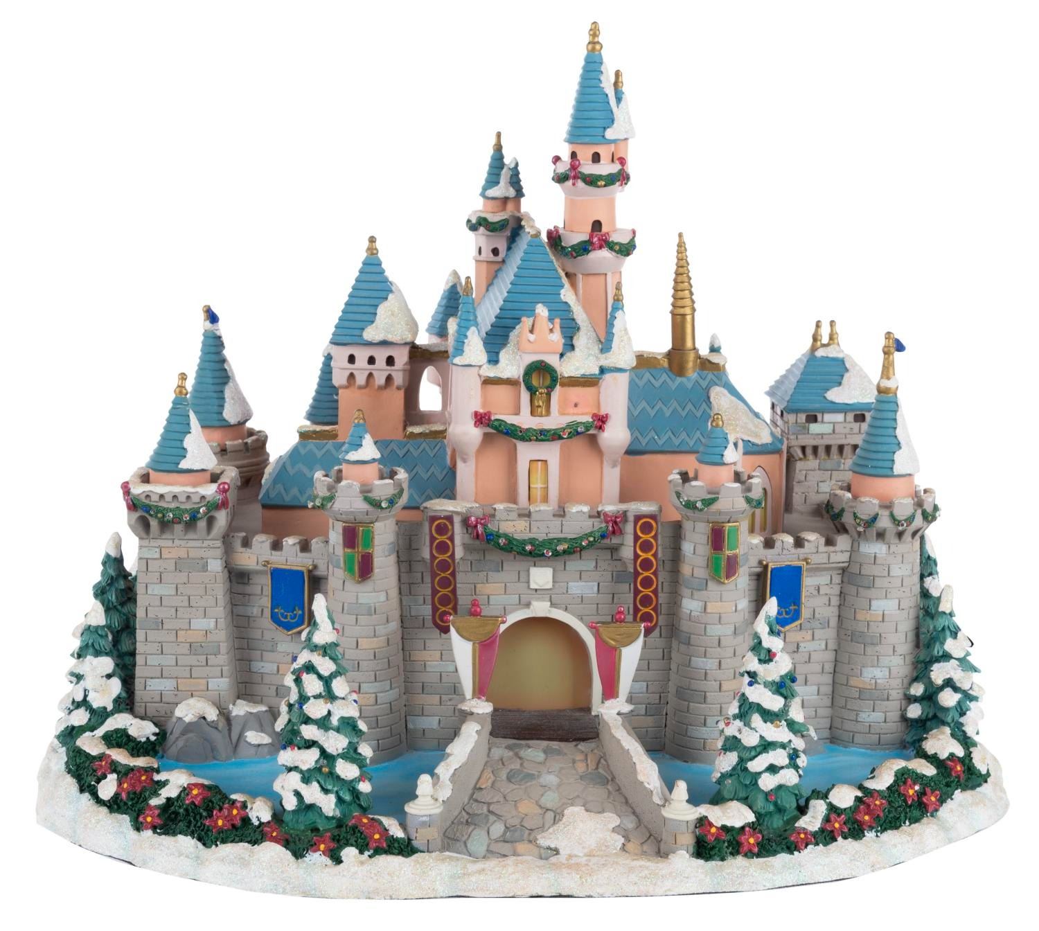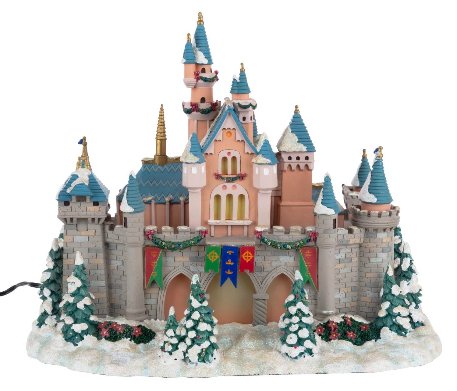 (Disney, 1990s-2000s) A Disney Village light-up sculpture of Disneyland's Sleeping Beauty Castle decorated for the holiday season. The castle includes an AC adapter and functioned when tested. Measuring 8” x 10” x 8.5”, the sculpture is in very good condition with visible repair work on the turrets and a missing Tinker Bell figure.