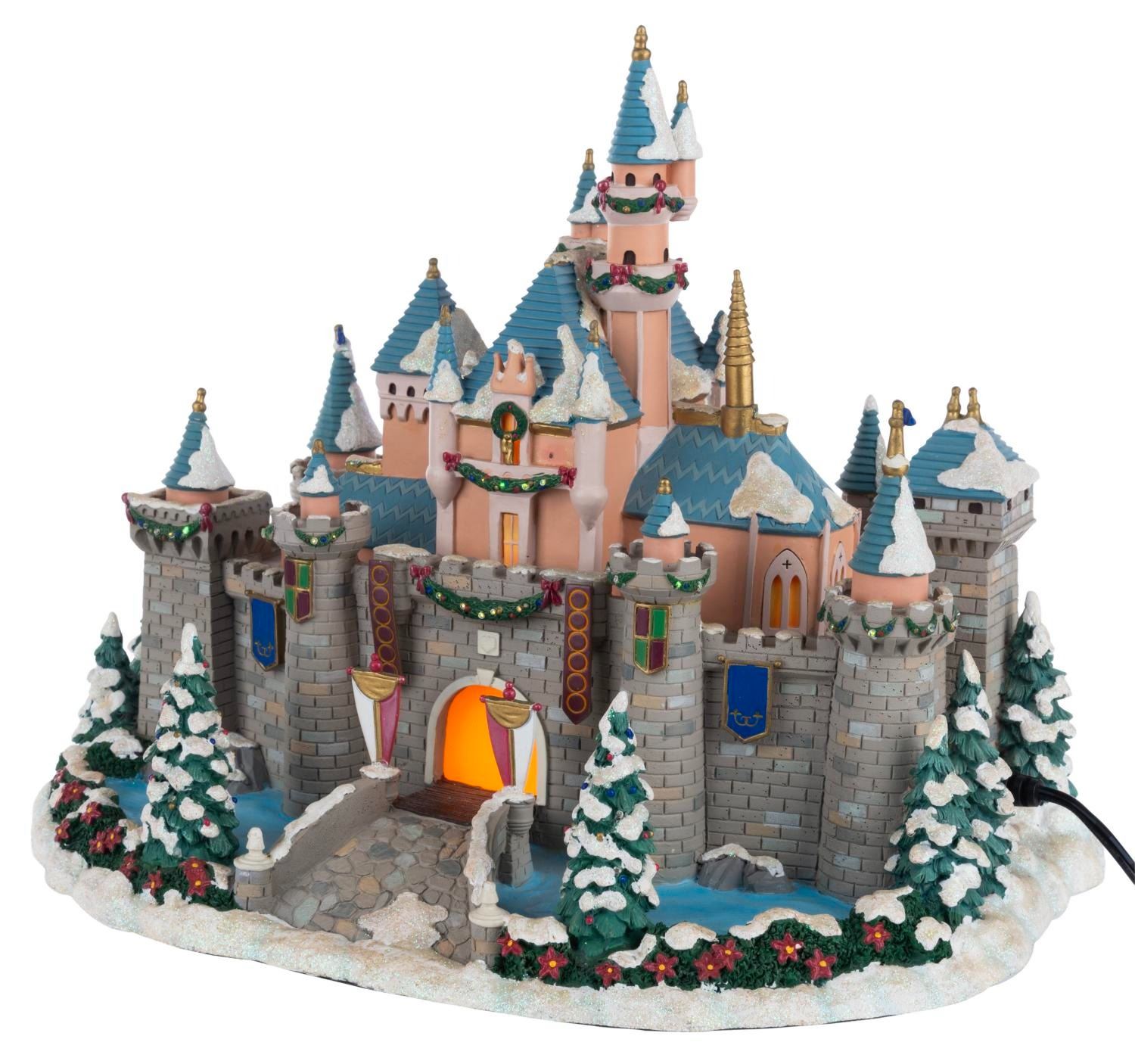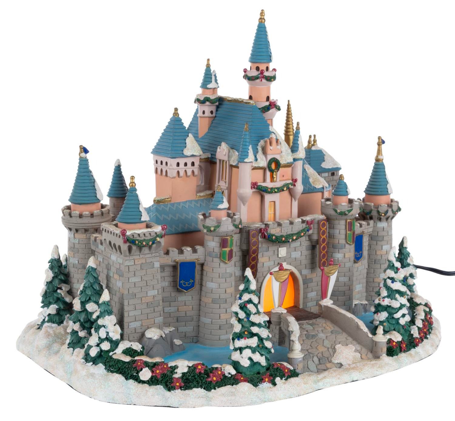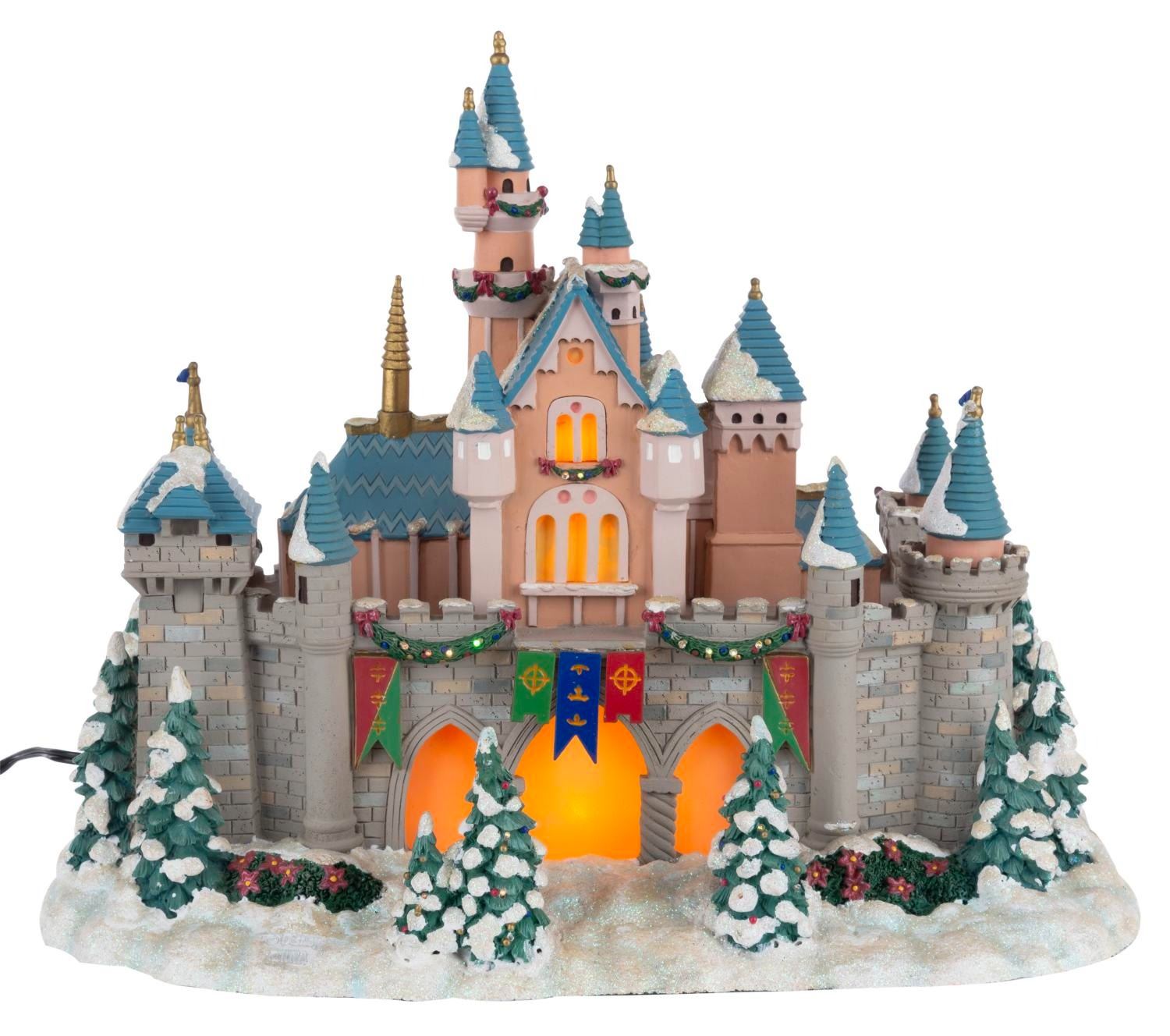 (Disney, 1990s-2000s) A Disney Village light-up sculpture of Disneyland's Sleeping Beauty Castle decorated for the holiday season. The castle includes an AC adapter and functioned when tested. Measuring 8” x 10” x 8.5”, the sculpture is in very good condition with visible repair work on the turrets and a missing Tinker Bell figure.