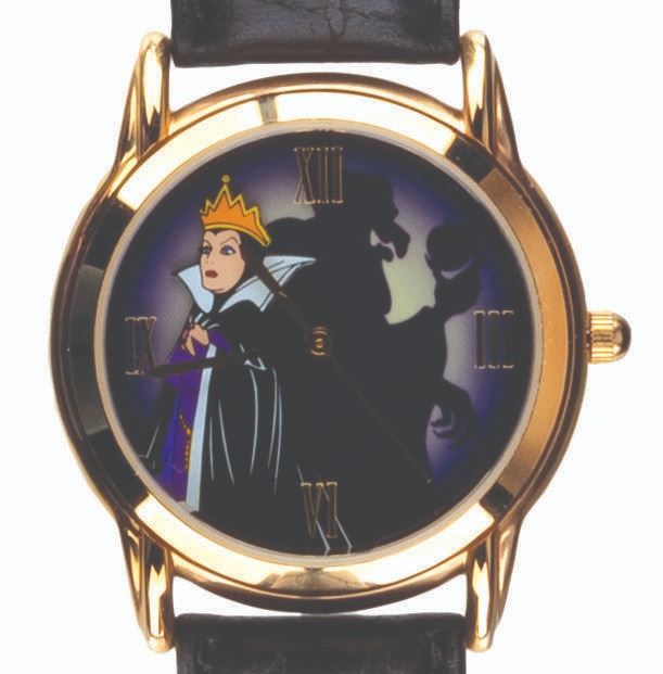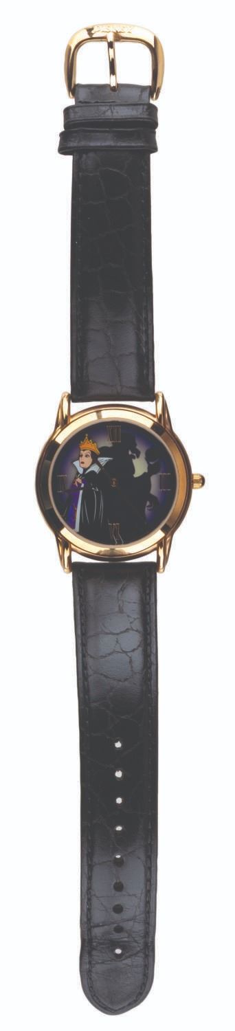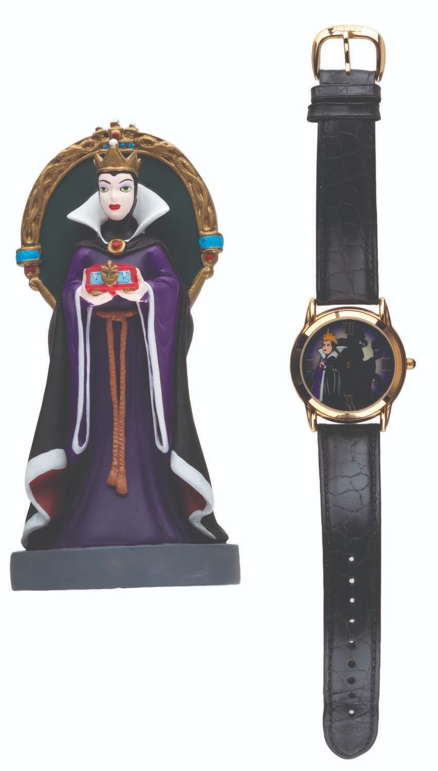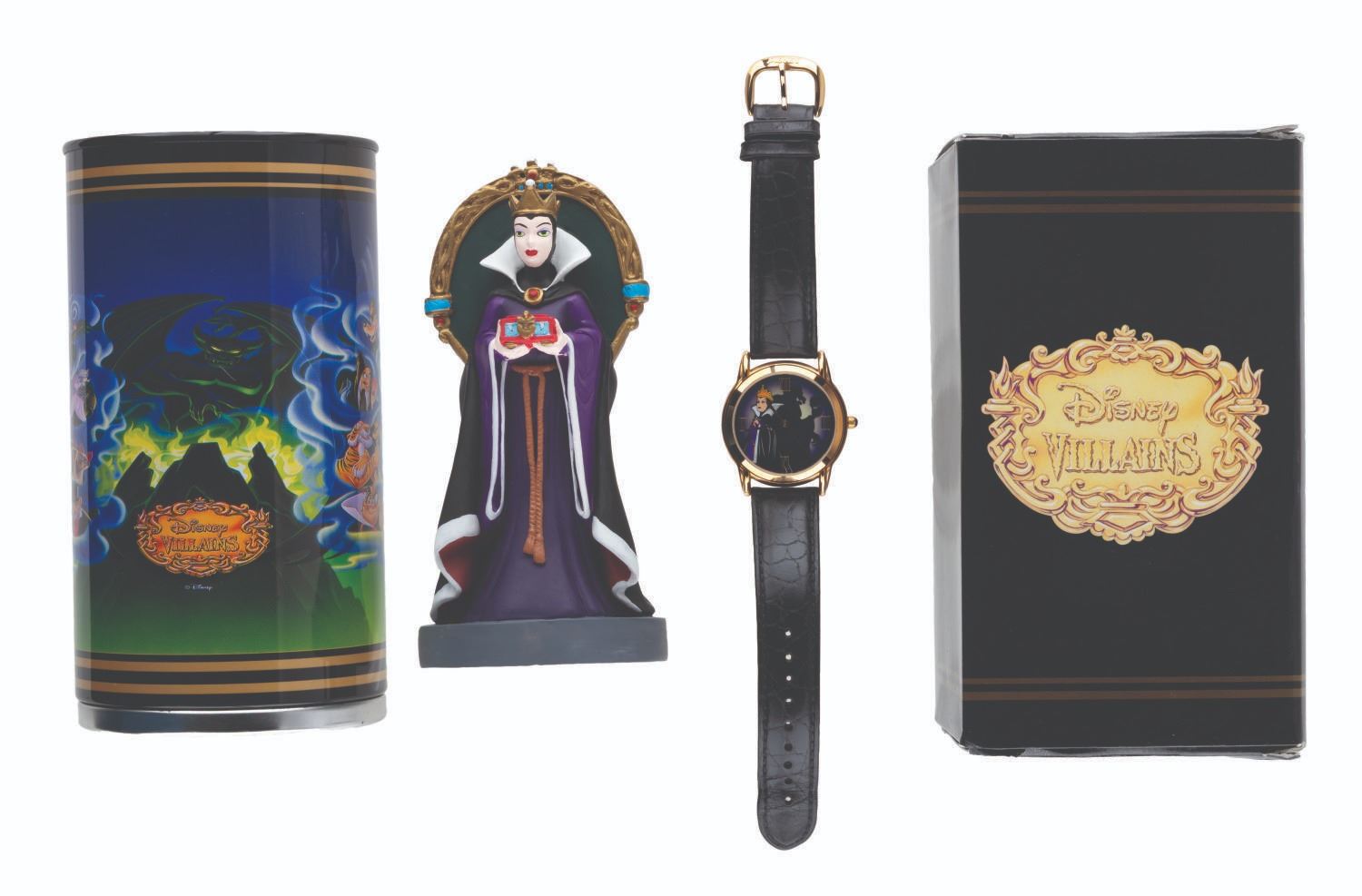 (Disney, 1990s) A Disney Villains series watch of the Evil Queen from "Snow White and the Seven Dwarfs. " The set includes a 6 " figural statue of the Queen, and her alter ego, the Hag, and a tin showing all the villains in the series. The watch, figurine, and tin are in fine condition, with the watch requiring a battery and possibly service to function.