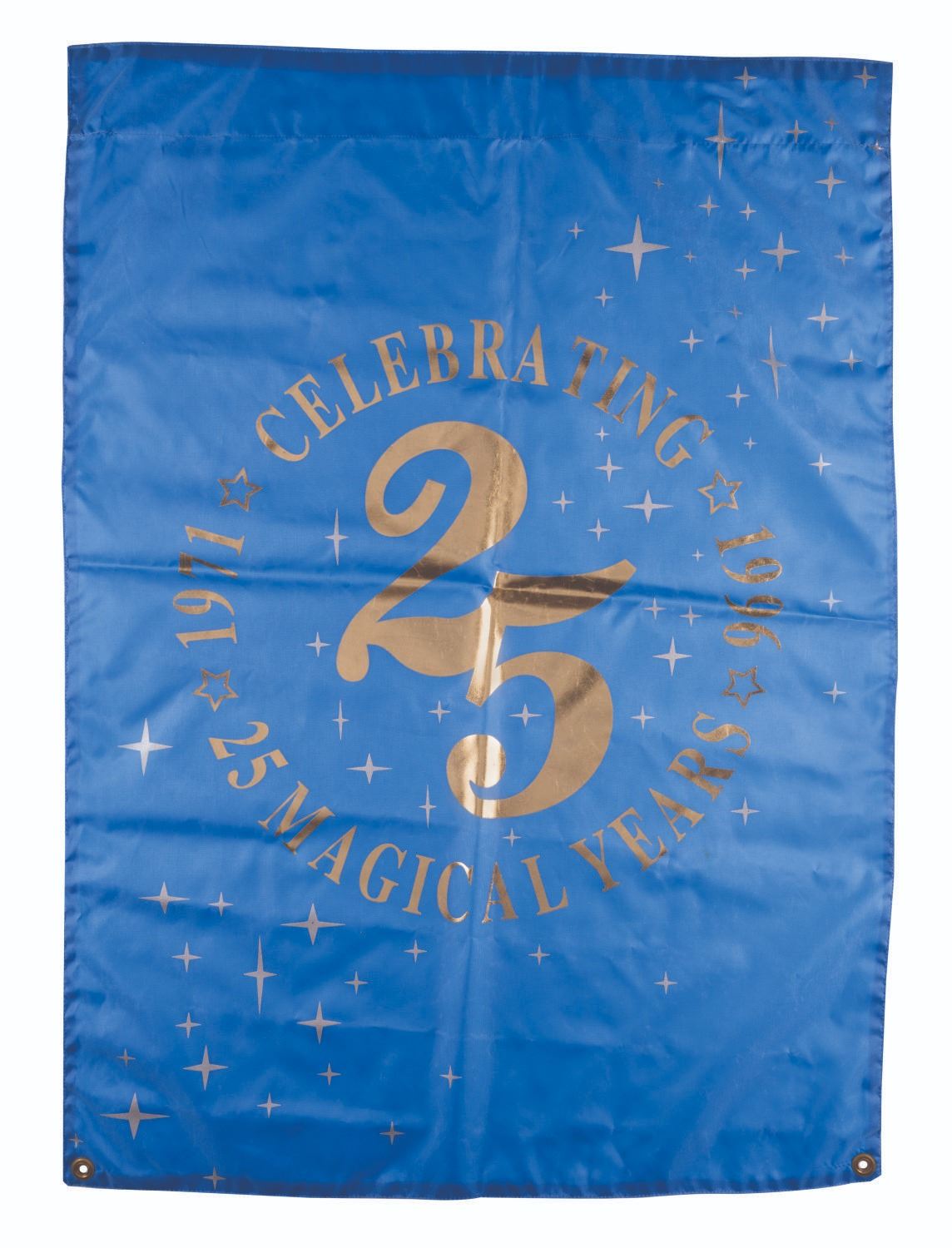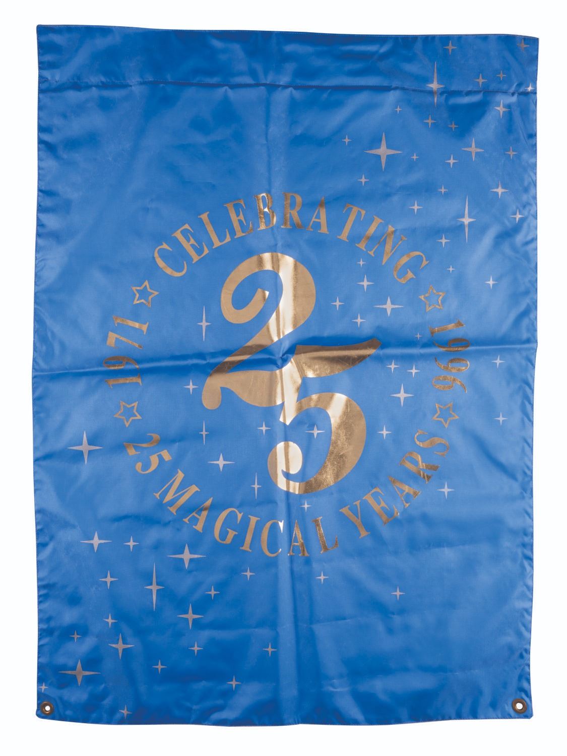 (Walt Disney World, 1996) A decorative blue lamppost banner from the “25 Magical Years” celebration of Walt Disney World. Measuring 28.75” x 40”, the banner is in very good condition with creases from storage, light stains, and wear from Resort display.