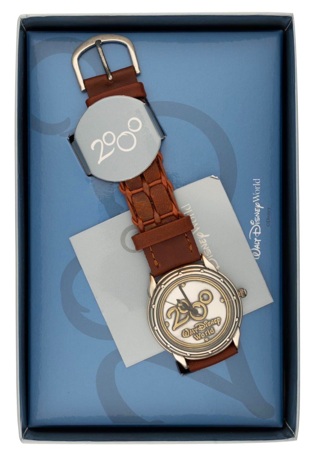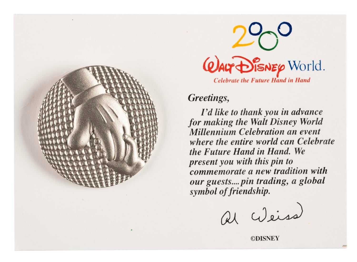 (Walt Disney World, 2000) A Walt Disney World Millenium Celebration wristwatch and pin, in the original box, "celebrating the future hand-in-hand." The timepiece measures 1.5" on a 9" band and the pin is 1.25" in diameter on its original card. The watch and pin are in fine condition and the card and the 6" x 4" x 1.25" box are in good-to-very-good condition with light wear.