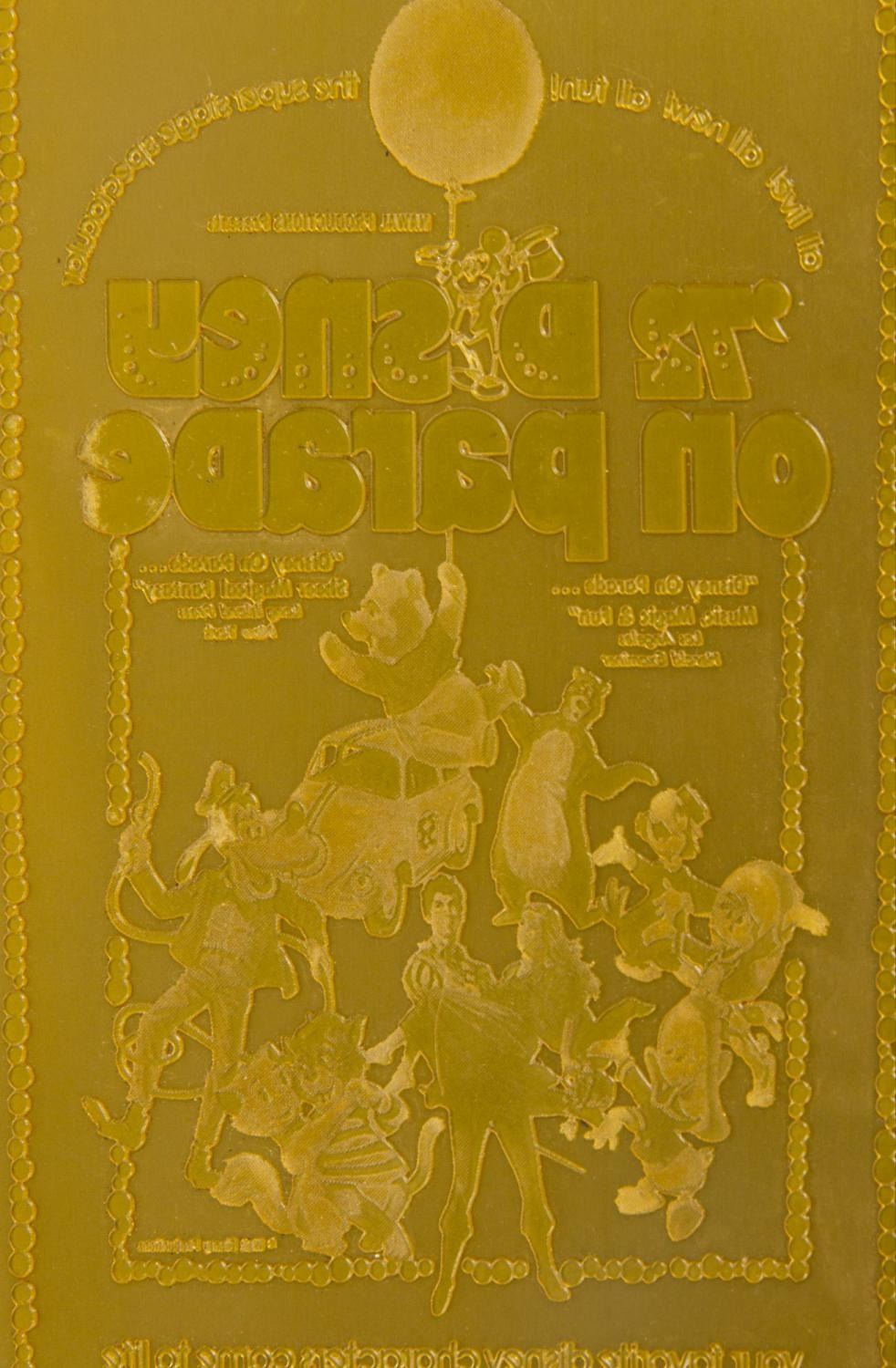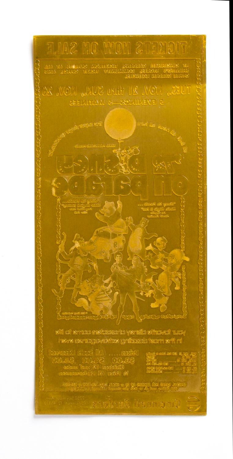 (Disneyland, 1972) A thin metal printing plate for Disney on Parade in 1972. This plate was used to create a flyer for promoting the parade at the Cincinnati Gardens in Ohio. Measuring 5.75" x 12.25", the plate is in very good condition with light wear and bending near the top.