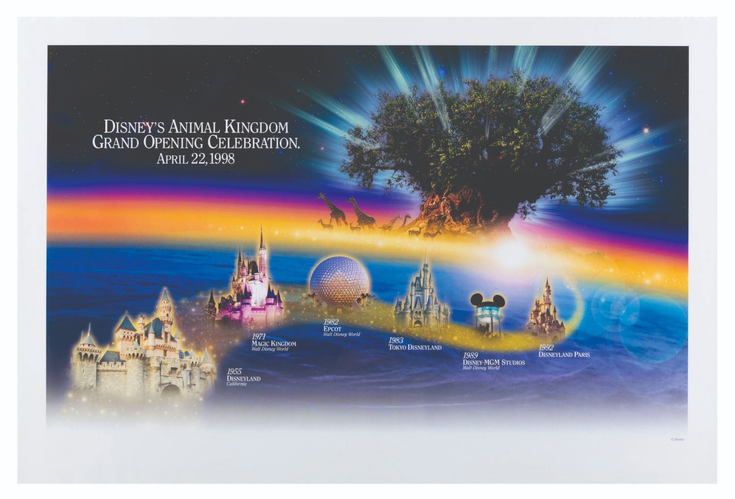(Animal Kingdom, 1998) A poster celebrating the opening of Disney's Animal Kingdom on April 22, 1998, with a timeline of the Disney Parks that preceded it. Measuring 16" x 24", the poster displays in very good condition with light edge wear including a .25" chip in the bottom right border.