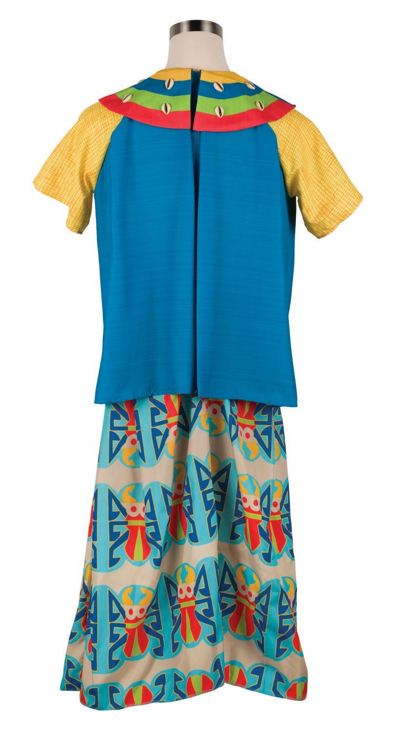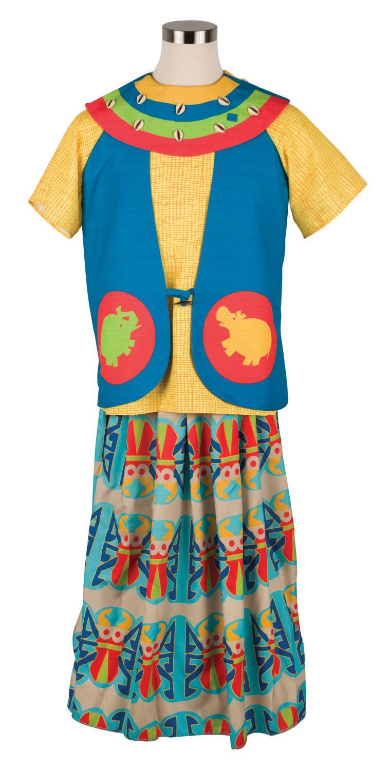 (Disney's Animal Kingdom) A wardrobe shirt and skirt once worn by Mercantile Hostesses of Disney's Animal Kingdom. This costume shirt and skirt are similar to those once worn by Discovery Island Mercantile Hostesses of the Theme Park. The shirt measures a Female size XL while the skirt is a Female "06U" waist. Each piece displays in fine condition overall, retaining faux cowrie shell buttons and crisp fabric, and exhibiting little wear.