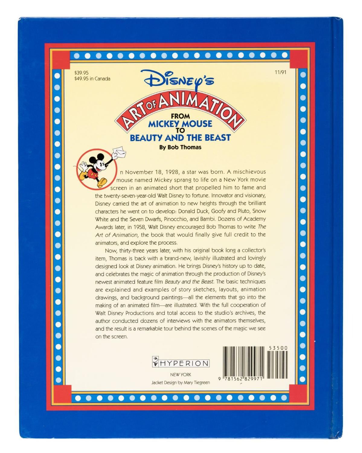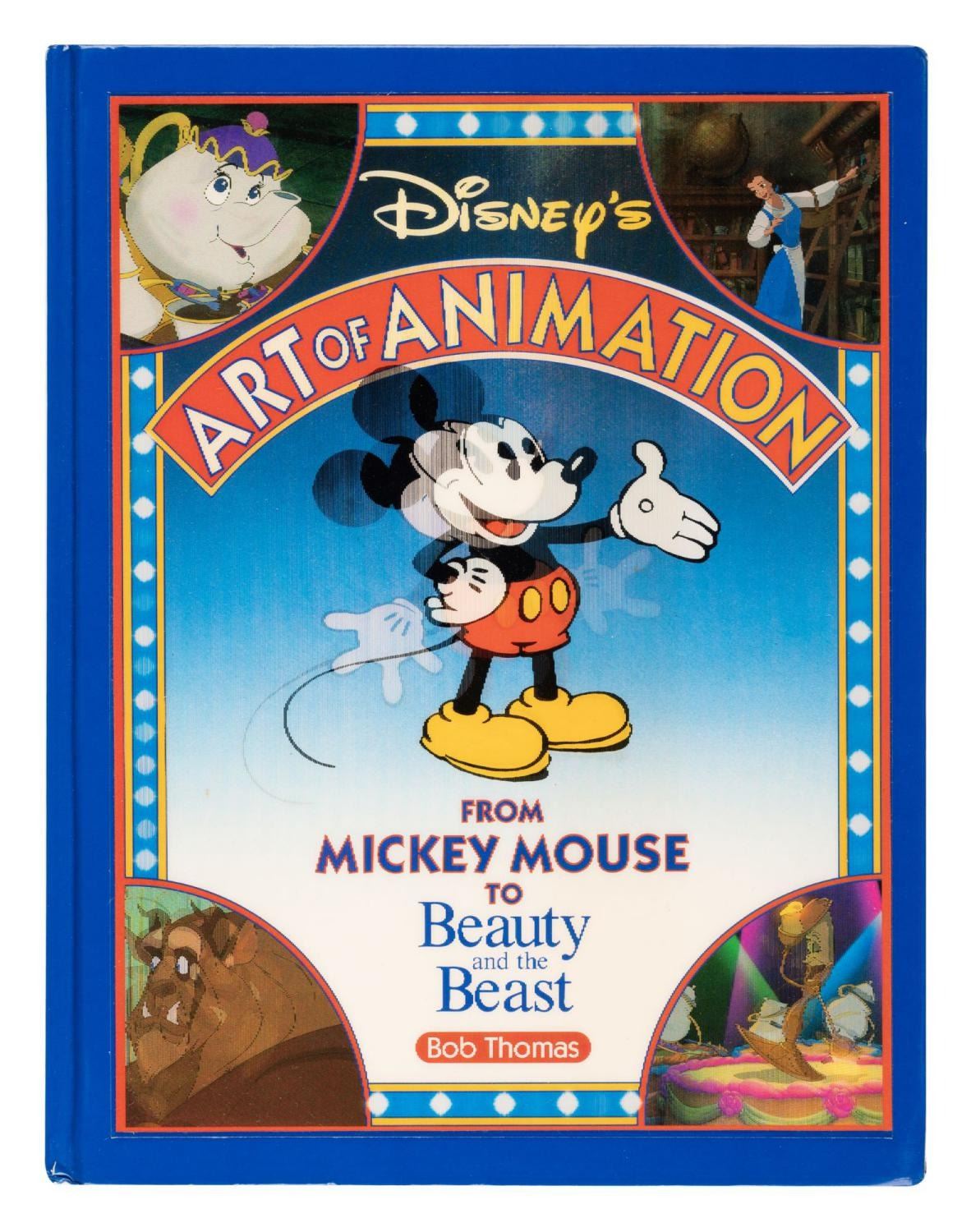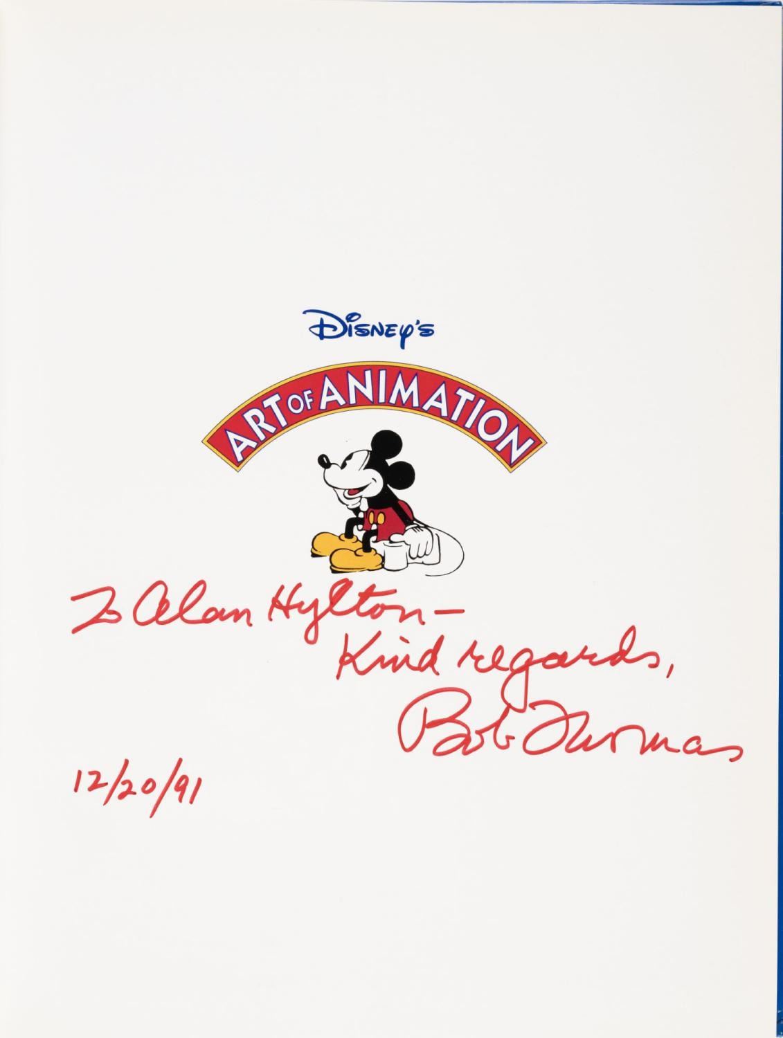 (Hyperion, 1991) A signed first edition Disney’s Art of Animation: From Mickey Mouse to Beauty and the Beast book with a lenticular cover. The title page features a personalized dedication in red marker by the book’s author, Bob Thomas. Measuring 8.75” x 11.25”, the book is in good condition with scratches, scuffs, and edge wear.