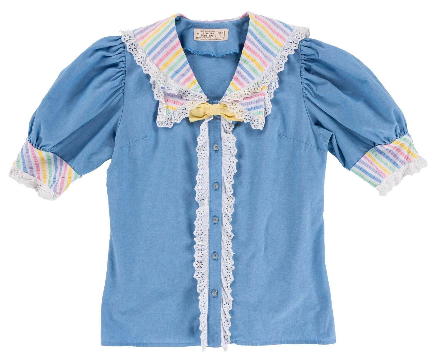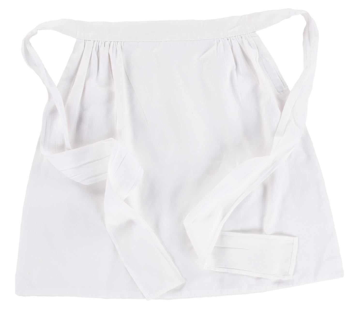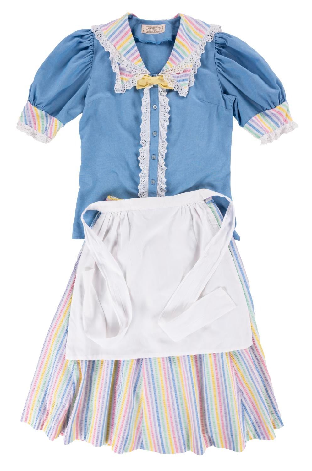 (Disney’s Beach Club Resort, 2000s) A blouse, skirt, and apron worn by Cast Members at the Beaches & Cream Soda Shop at Disney’s Beach Club Resort. The dress labeled 10x28, the blouse labeled a size 10, and the one size fits all apron are in good Park-used condition, with small spots of discloroation to the yellow “bow tie” that clips to the blouse.