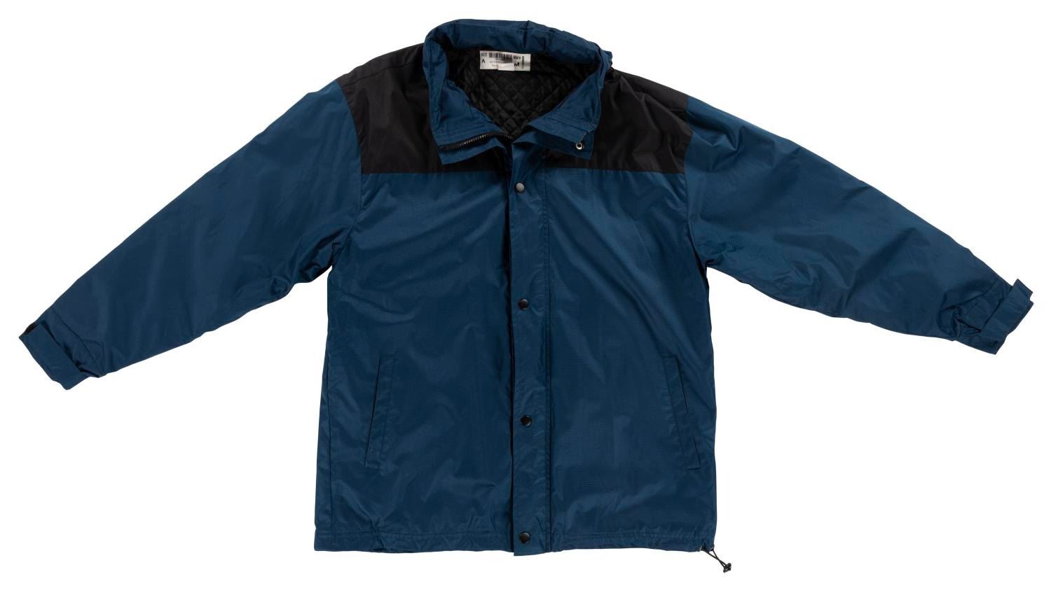 (Disney’s Blizzard Beach, 2000s) A blue and black hooded jacket worn by a Cast Member at Disney’s Blizzard Beach Water Park. Labeled a size Male M, the polyester jacket is in very good condition with light fraying and wear from Resort use.