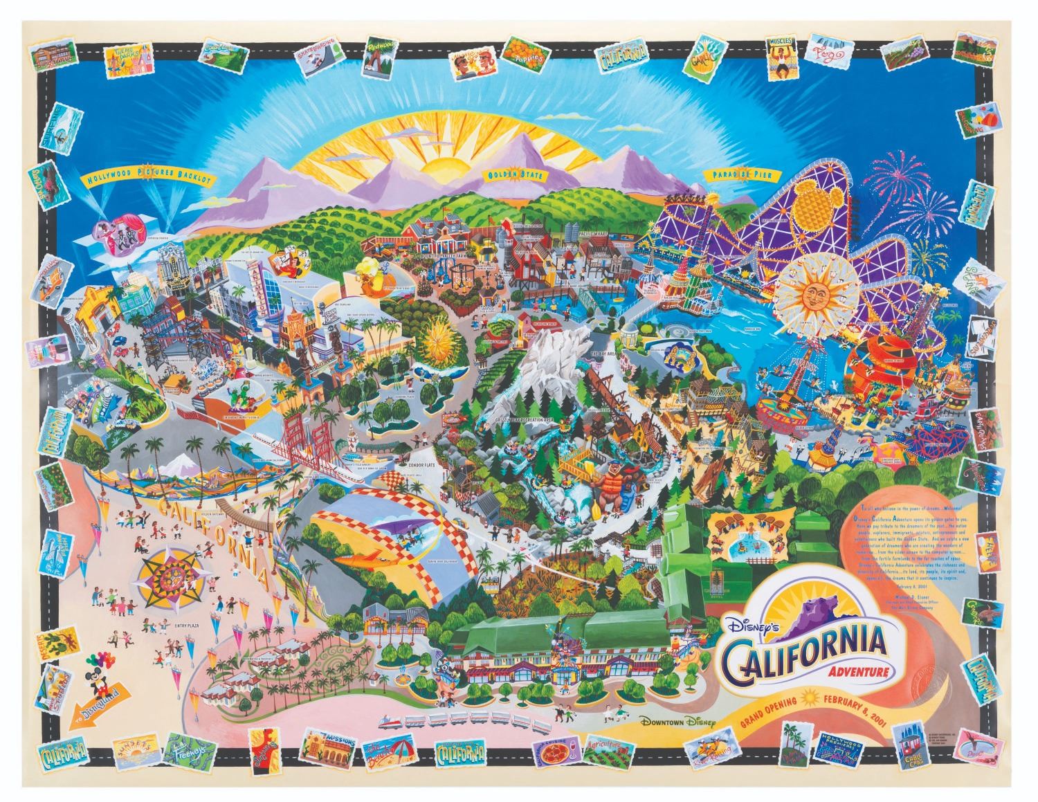 (Disney's California Adventure, 2001) A rare rolled fun map from the Grand Opening of Disney's California Adventure on February 8, 2001. This version of the map was an Imagineering exclusive and features an embossed Walt Disney Imagineering logo at the lower right. Rolled as issued, the map measures 26.5" x 43.25" and is in fine condition.