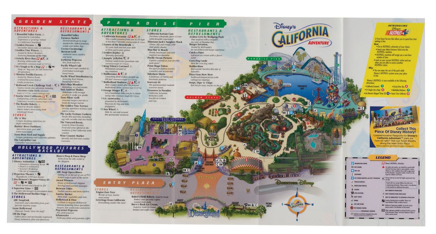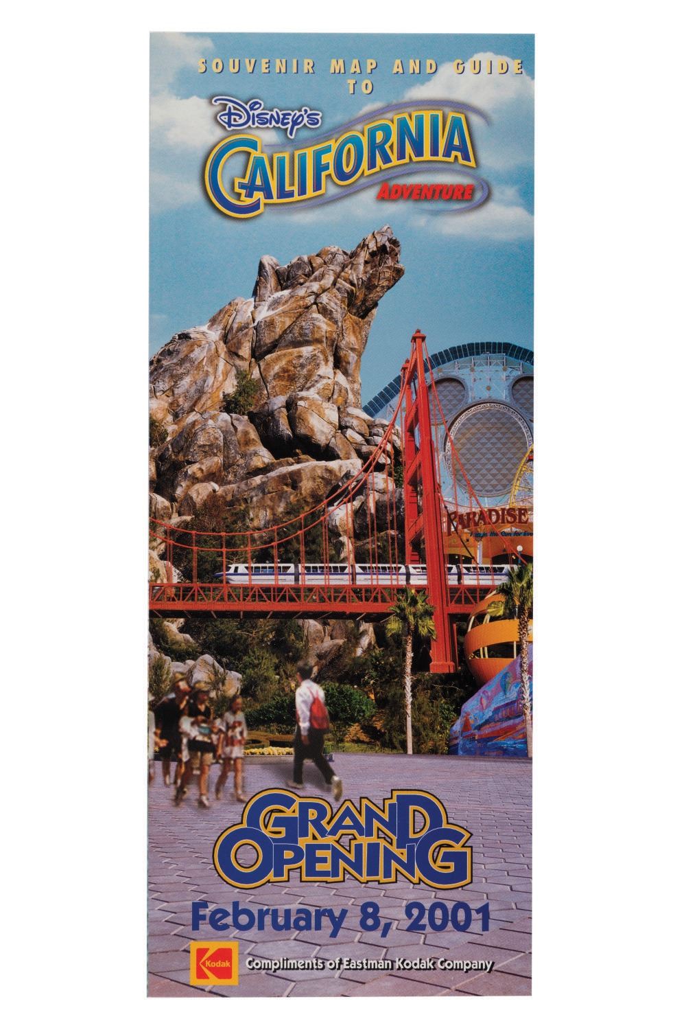 (Disneyland Resort, 2001) A Souvenir Map and Guide to Disney's California Adventure from the Grand Opening February 8, 2001. Maps of this style were given to Guests upon entry through the turnstiles of the Main Gate. Measuring 10"x20" open, the Guide is in fine condition.