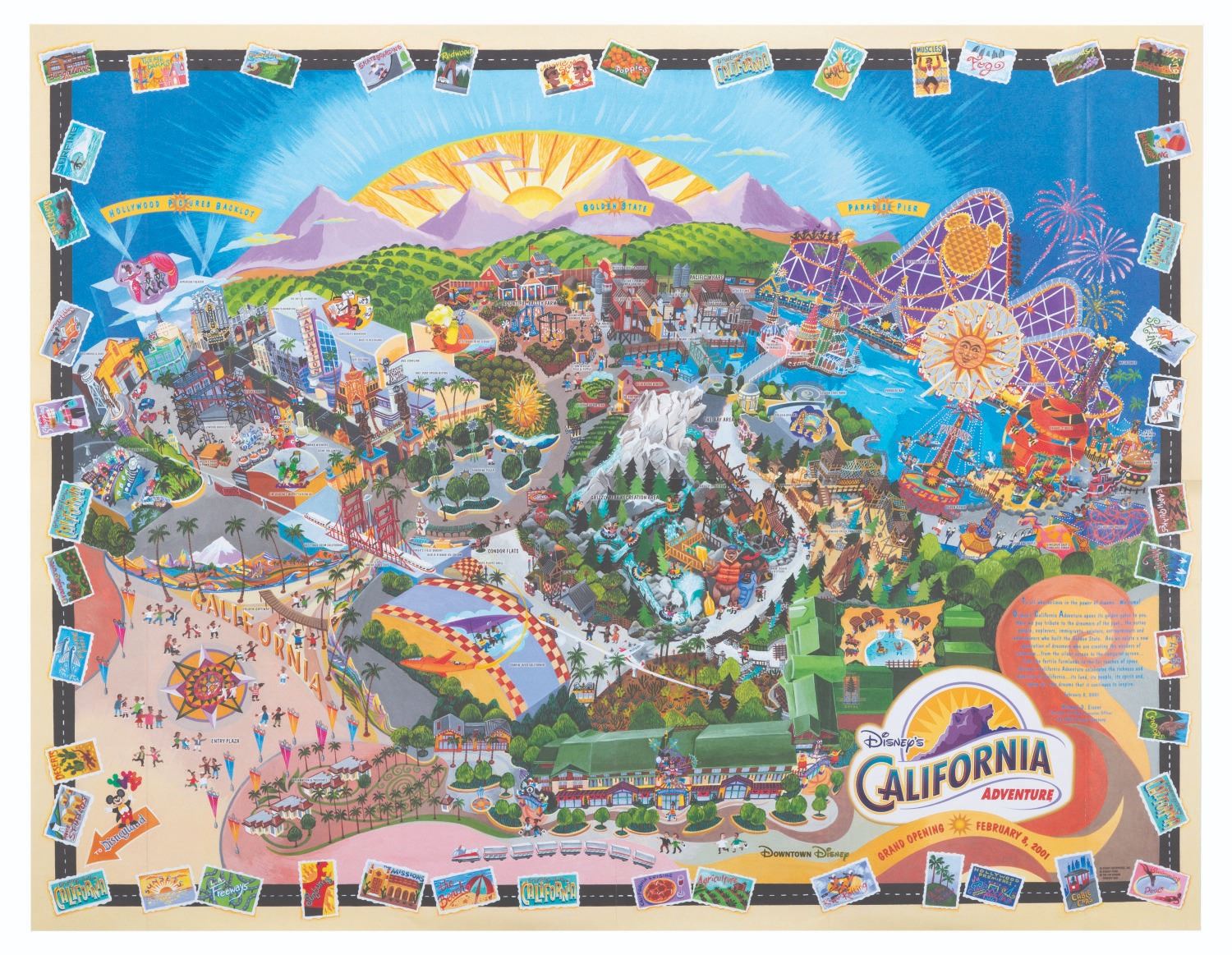 (Disney's California Adventure, 2001) A stylized illustrated map celebrating the Grand Opening of Disney's California Adventure on February 8, 2001. Measuring 26.5" x 34", the map is in very good to fine condition with very light wear along original fold lines.