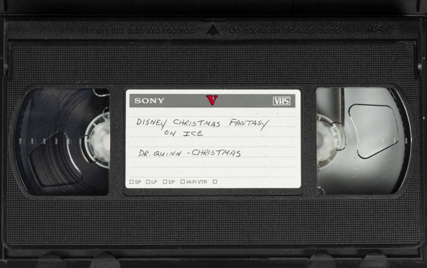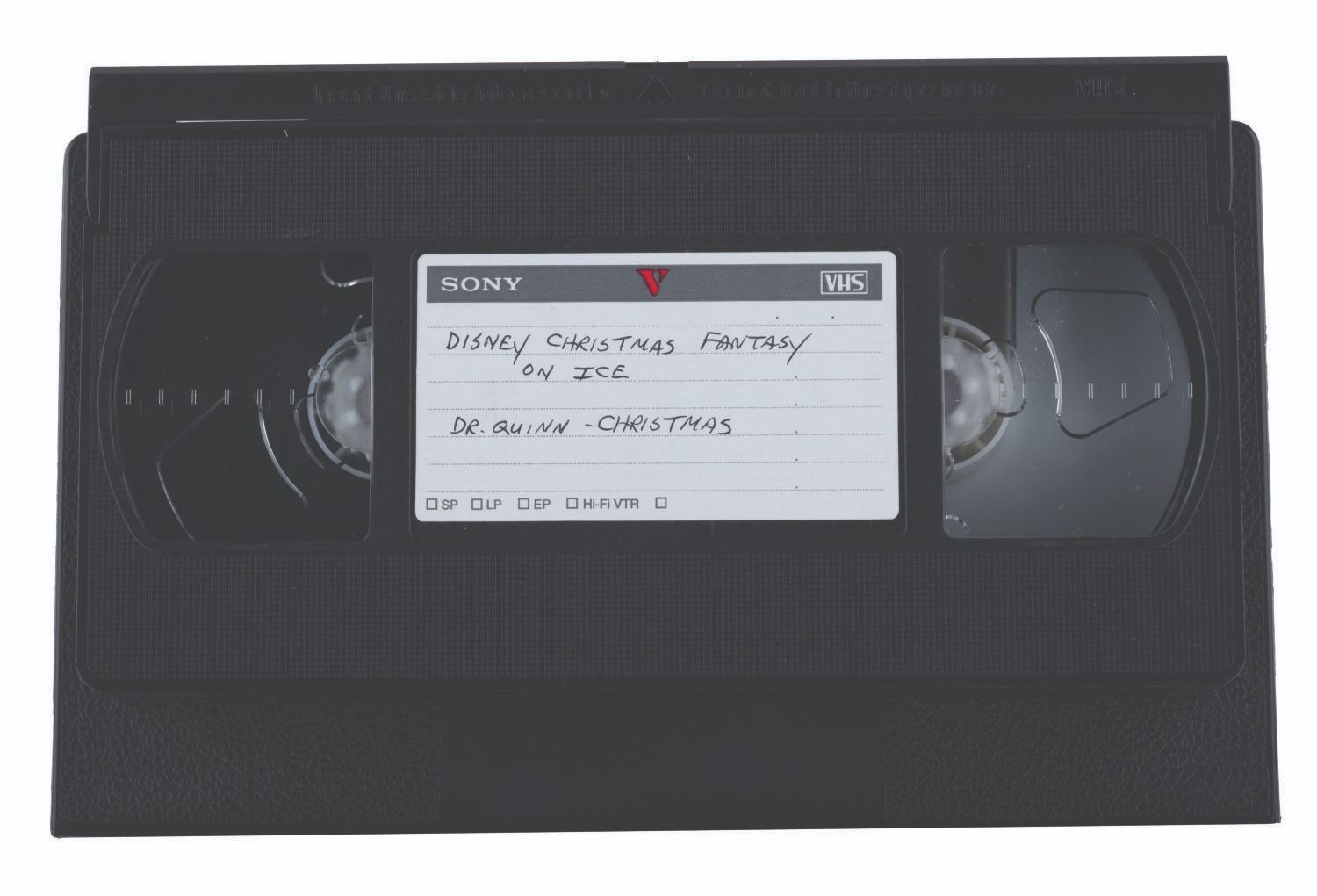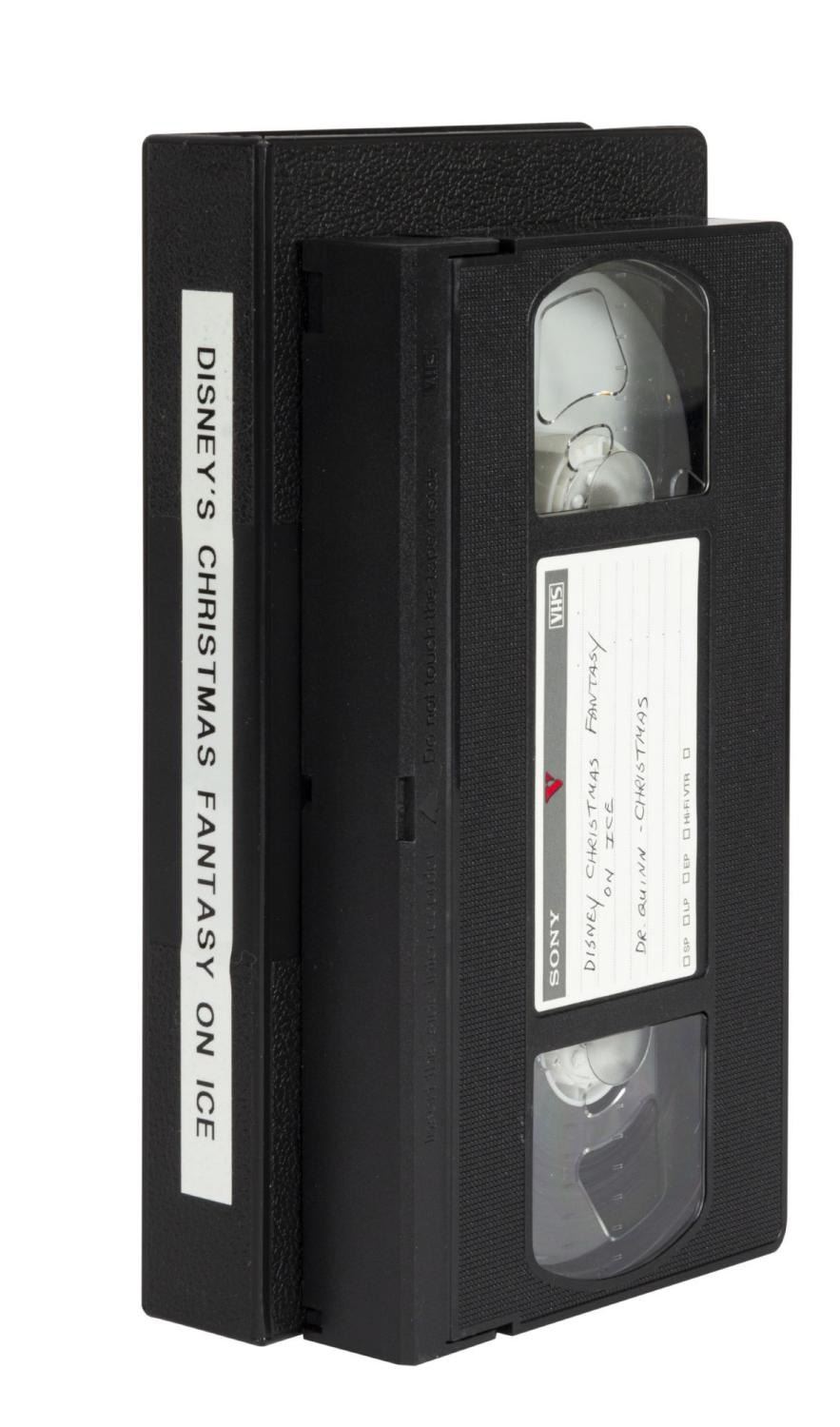 (1992) A VHS recording of the “Disney’s Christmas Fantasy on Ice” CBS special. Among the stars of the special are Disney characters Mickey, Minnie, and Roger Rabbit, and professional skaters including Nancy Kerrigan, Kurt Browning, and Brian Boitano. The label indicates the VHS also includes a “Dr. Quinn - Christmas” episode. Measuring 4.25” x 7.5” in a 4.75” x 8” hard plastic case, the VHS is untested and appears to be in fine condition.