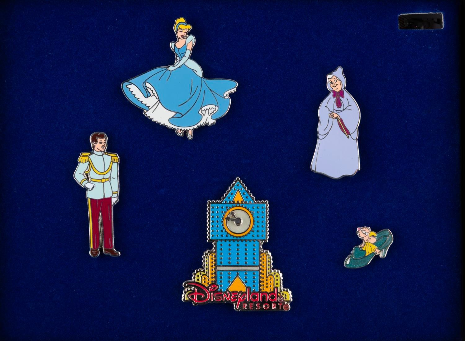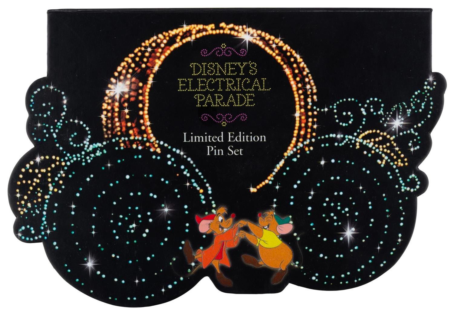 (Disneyland Resort, 2002) A musical boxed pin set of the "Cinderella" sequence of Disney’s Electrical Parade. Included are five pins of Cinderella, Prince Charming, the Fairy Godmother, the Clock, and Jaq with the Glass Slipper. The box contains a music chip to play the theme when opened, with the original batteries no longer functional. Released in a limited editon 0f 2500, the boxed set is in fine condition.