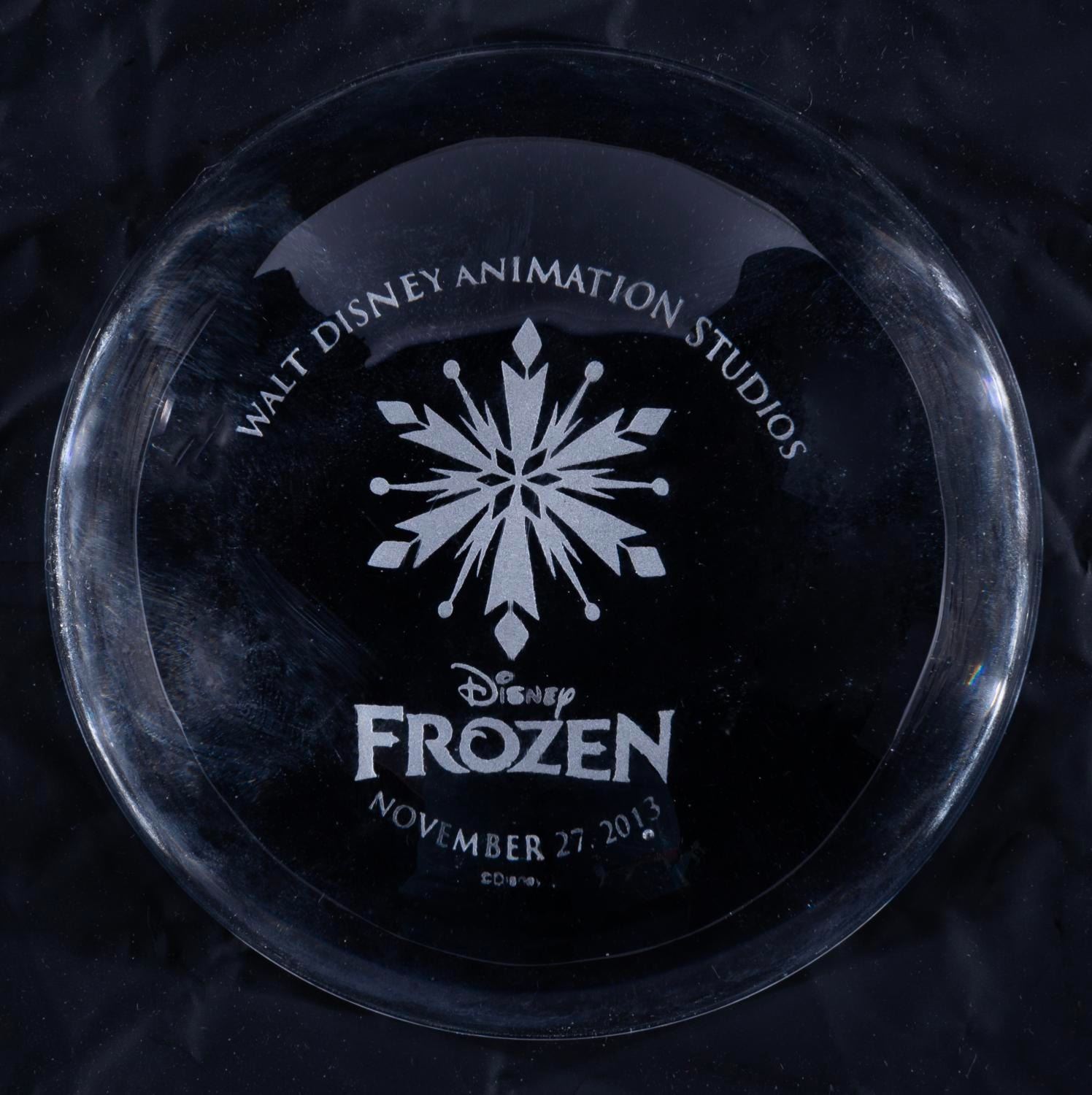 (Disney, 2013) A Walt Disney Animation Studios glass paperweight etched with the date of the premiere of “Frozen.” This was given as a gift to crew mebers at Walt Disney Feature animation. Measuring 3.5" x 3.5" x 1.5", the piece is in fine condition.