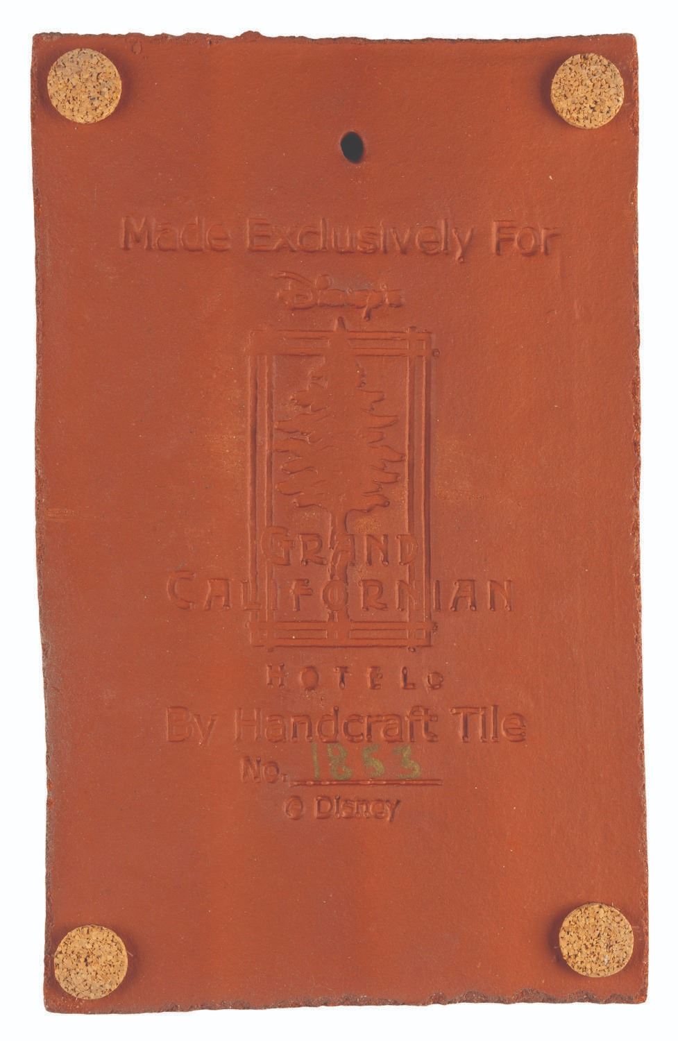 (Disney’s Grand Californian Hotel, 2000s) A green tile made exclusively for Disney’s Grand Californian Hotel by Handicraft Tile. The limited edition piece features a hotel logo on the reverse and is hand-numbered 1853 in gold marker. Measuring 6.25” x 10” x 0.75” deep, the tile is in fine condition.