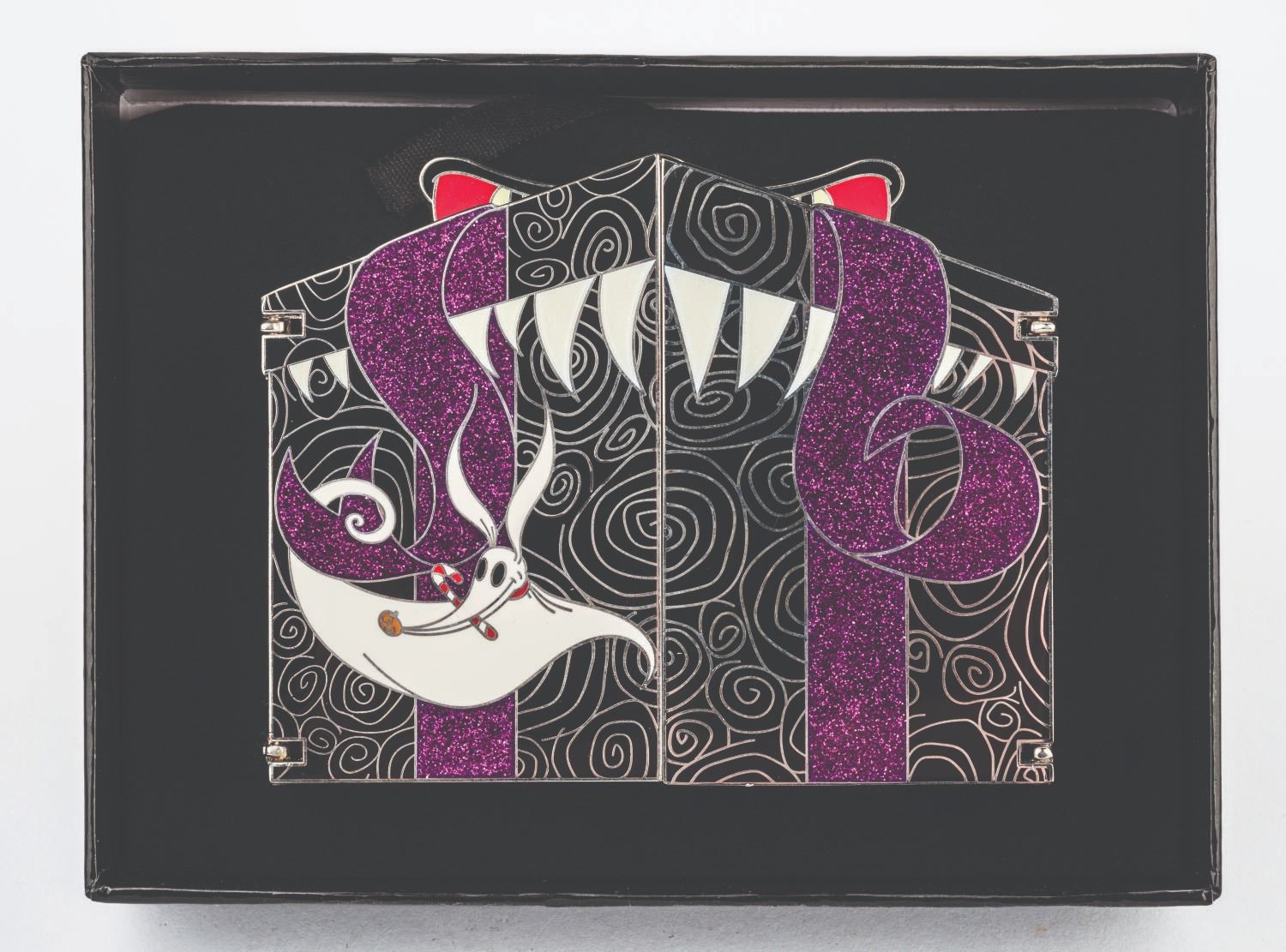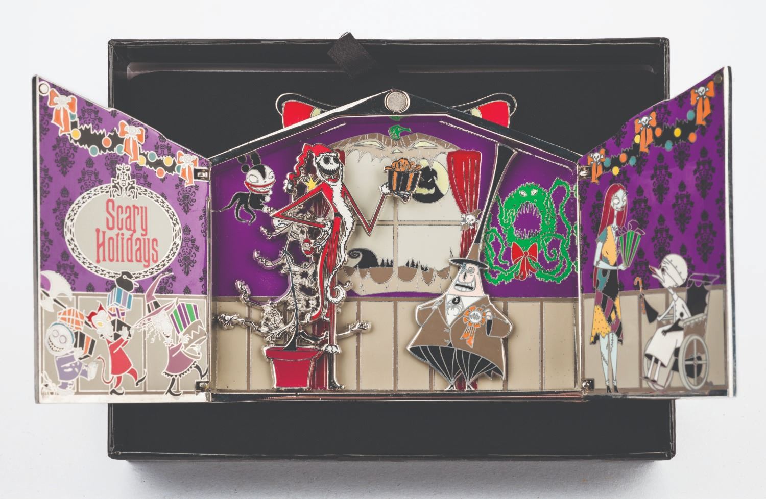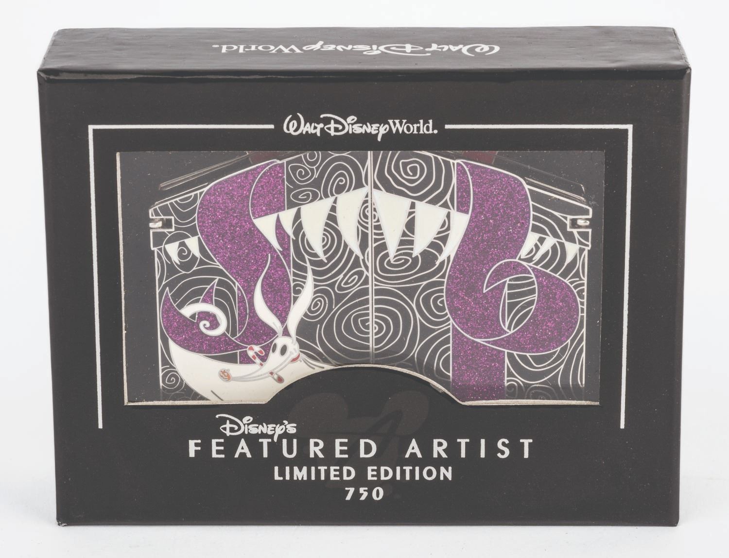 (Walt Disney World, 2006) A Disney’s Featured Artist Limited Edition Haunted Mansion “Scary Holidays” Jumbo Pin. This hinged jumbo gift-shaped pin opens to reveal “pin-on-pin” imagery of Tim Burton’s Jack, Sally, The Mayor, Dr. Finkelstein, Lock, Shock, and Barrel as envisioned by artist Tim Loucks. This collectible is magnetically sealed, was limited to an edition of 750, and is in fine condition in its original box.