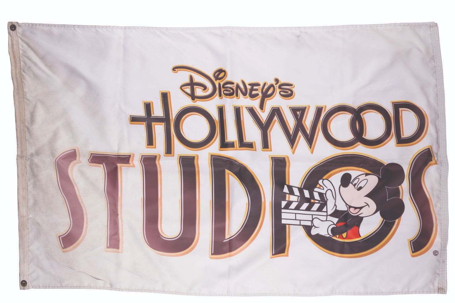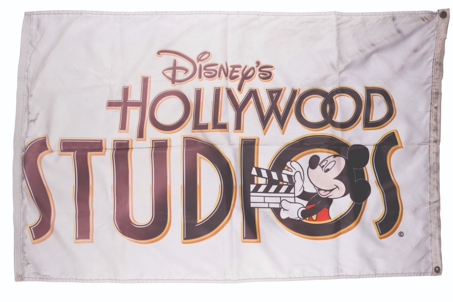 (Disney's Hollywood Studios, 2000s-10s) A large flag that once flew near the entrance of Disney's Hollywood Studios. Measuring 56" x 35", the flag is in fair-to-good condition exhibiting fading, scuffs, dust retention, areas of fraying, loose threads, and wear from sun exposure during its original Park display and age of materials.