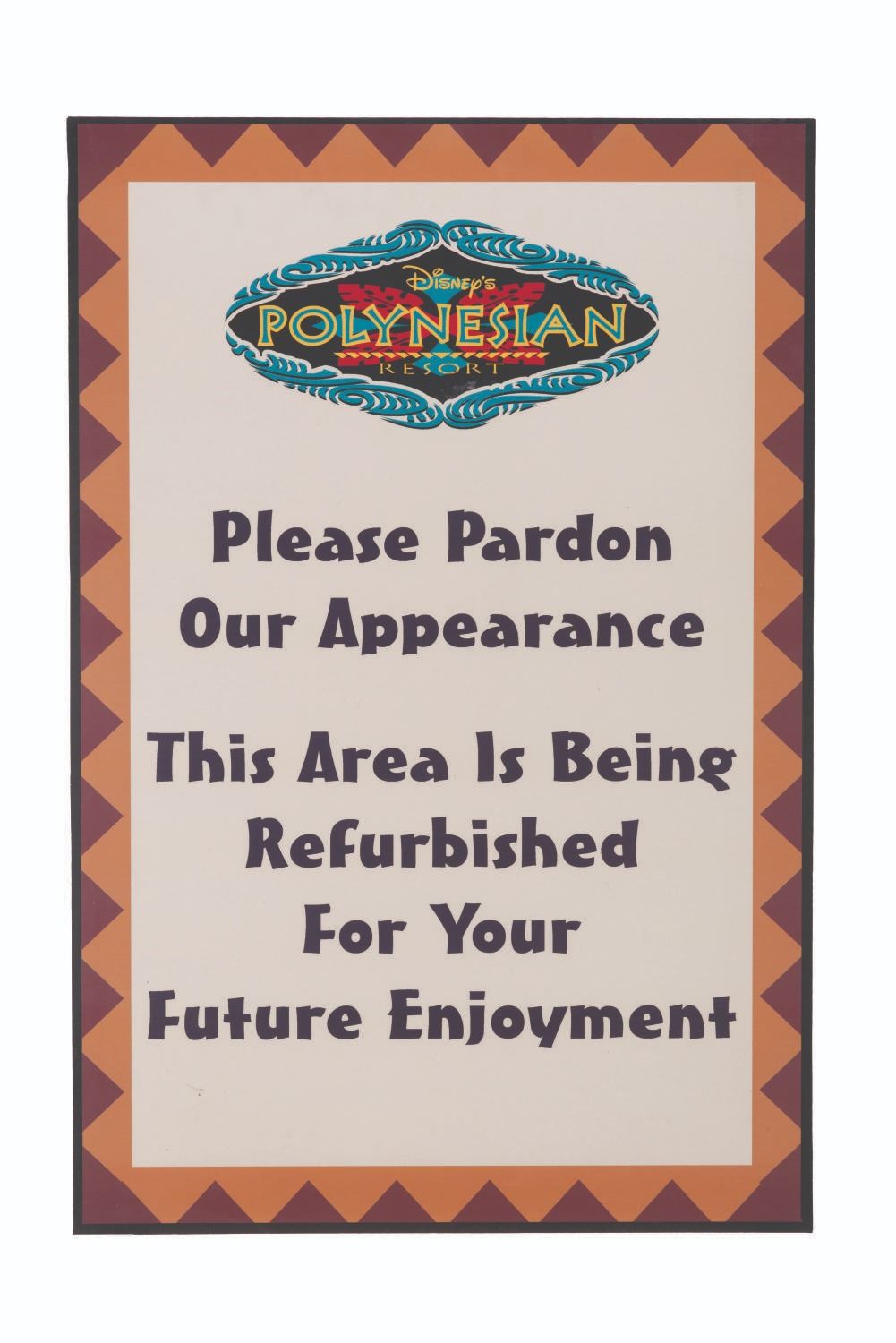(Disney's Polynesian Resort, 1996-2014) A refurbishment sign from Disney's Polynesian Resort featuring the Resort's third logo, before the change to its current name, Disney's Polynesian Village Resort. Measuring 24" x 36", the foamcore sign displays in very good condition with scuffs, scratches, and wear from Resort use.