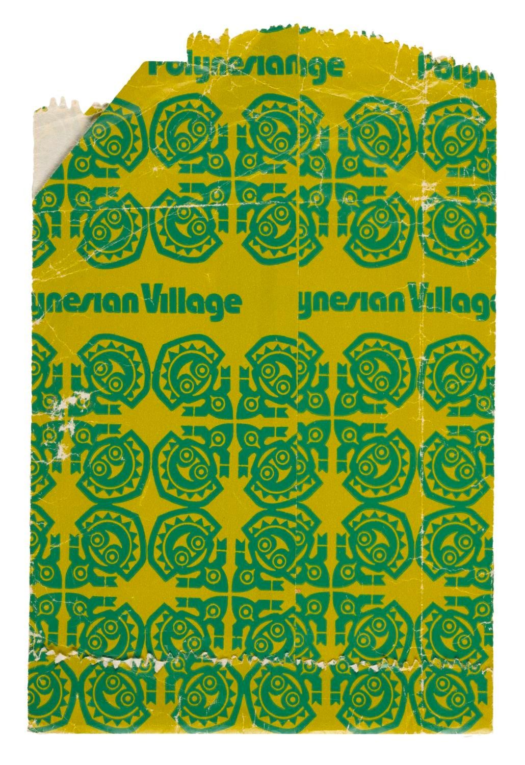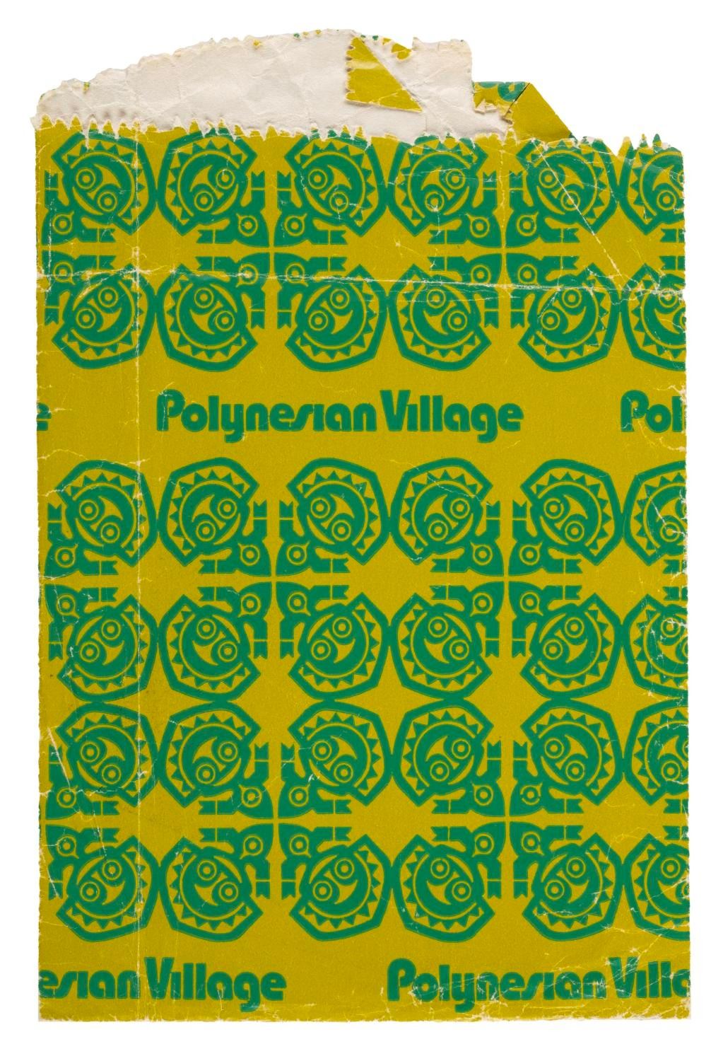 (Disney's Polynesian Village, 1970s) A paper souvenir shopping bag from a merchandise location at Disney's Polynesian Village Resort at Walt Disney World. Measuring 5.5" x 8.25", the paper bag is in fair condition exhibiting creases, tears, and wear from handling and age.