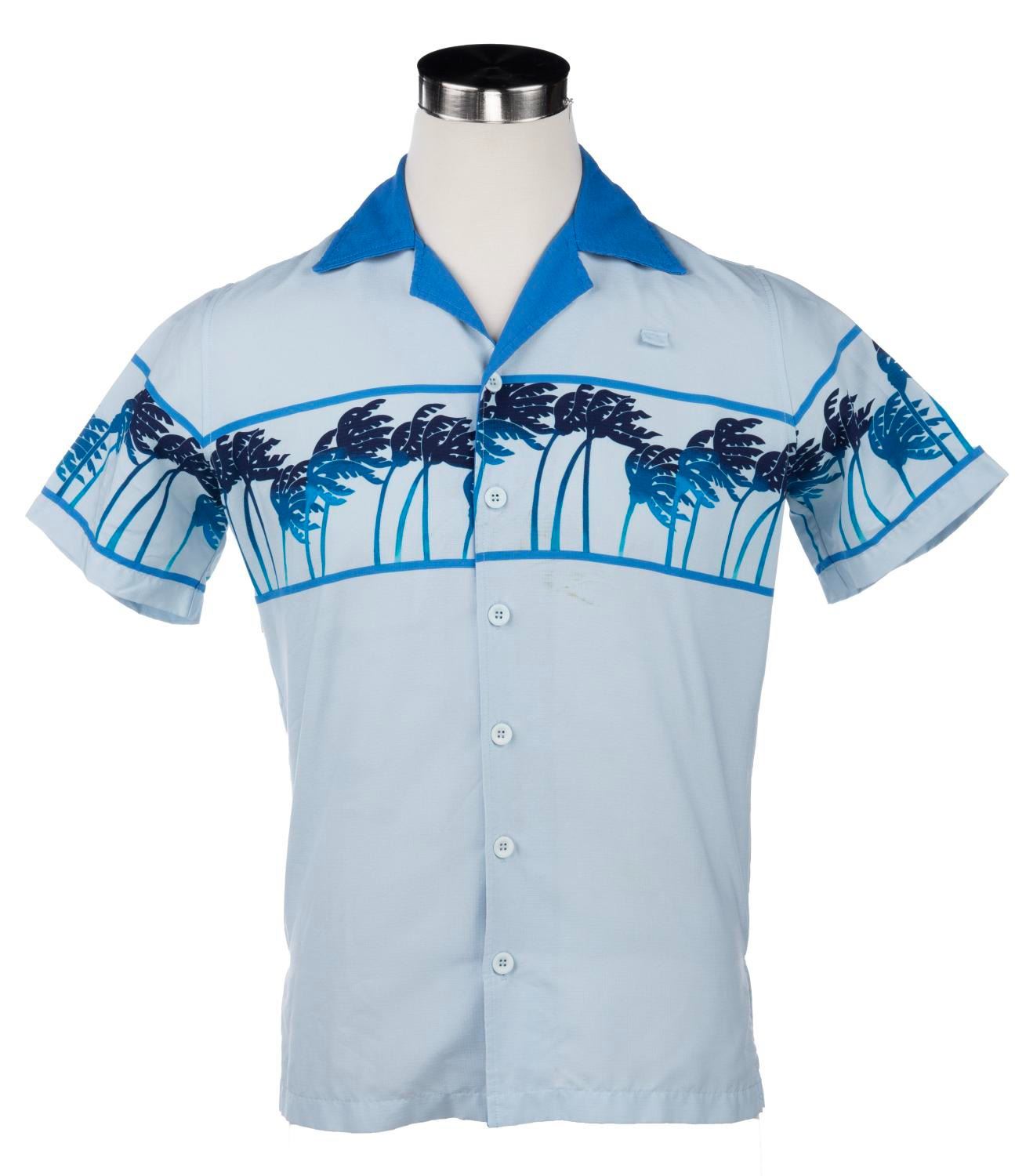 (Disney's Typhoon Lagoon) A shirt worn by Merchandise Hosts and Hostesses of Disney's Typhoon Lagoon at Walt Disney World. Measuring a male size S, the shirt is blue with palm trees, and is in very good condition with few stains and little wear from Park use.