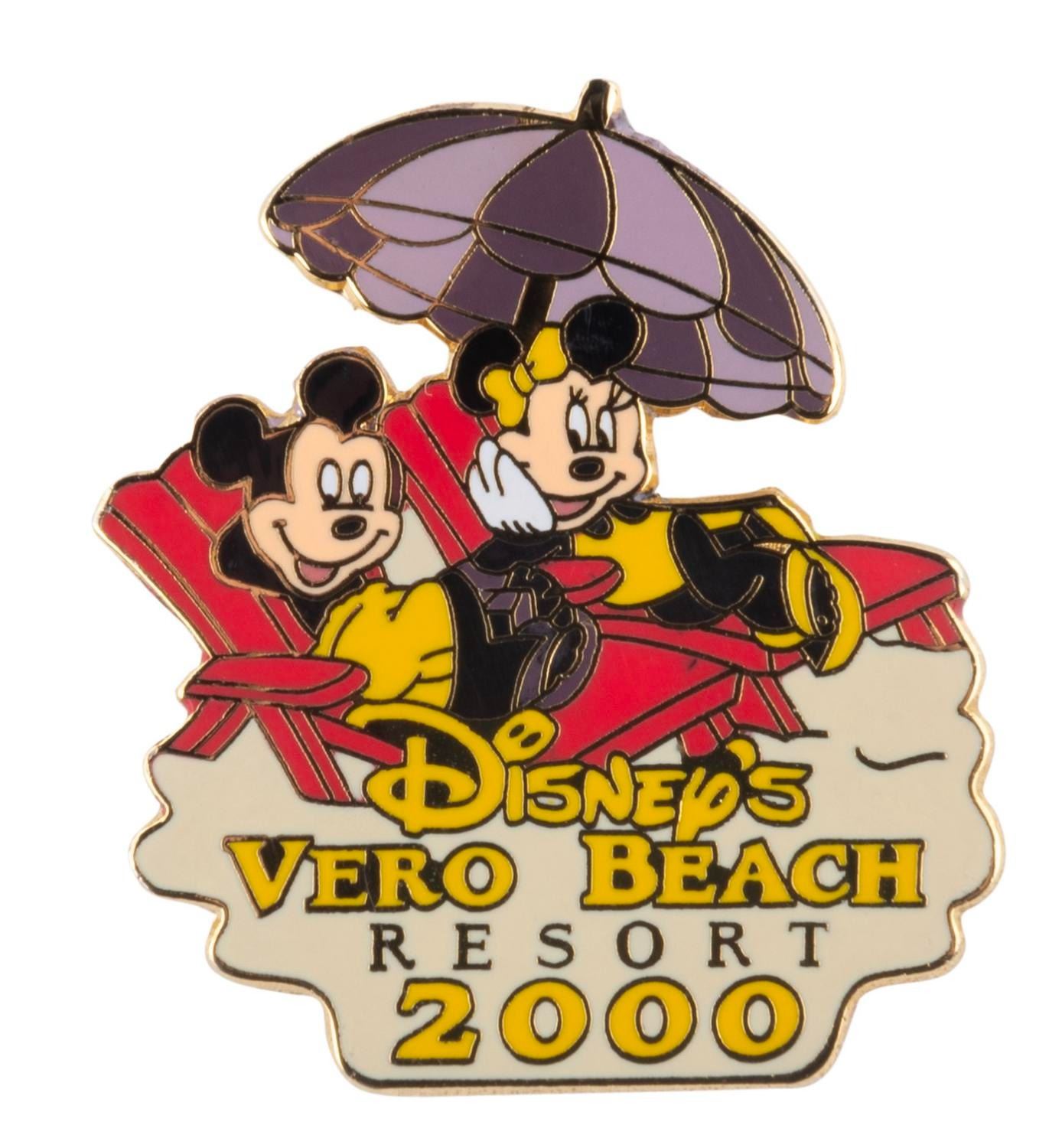 (Walt Disney World, 2000) A Disney’s Vero Beach Resort pin featuring Mickey and Minnie Mouse lounging at the beach. The pin is in very good condition.