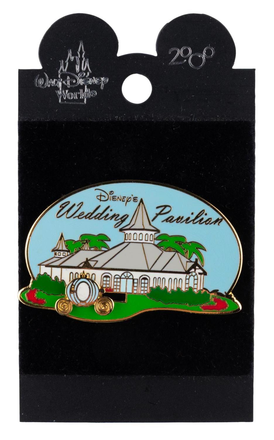 (Walt Disney World, 2000) A Walt Disney World Wedding Pavilion pin with a Cinderella Coach slider feature. The pin is in fine condition on the original card.