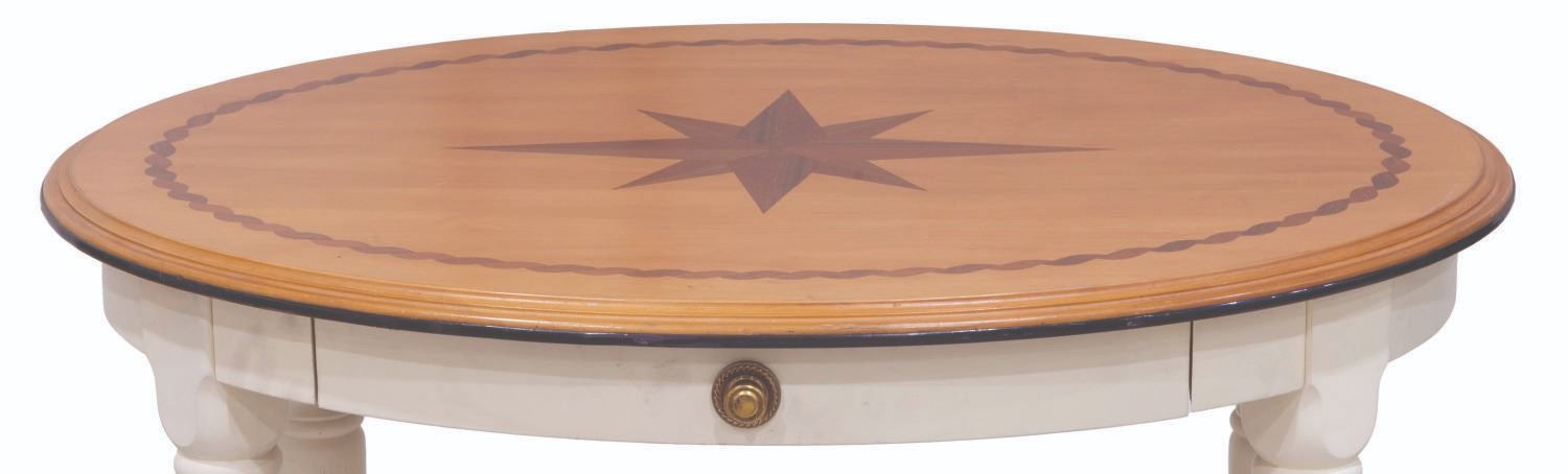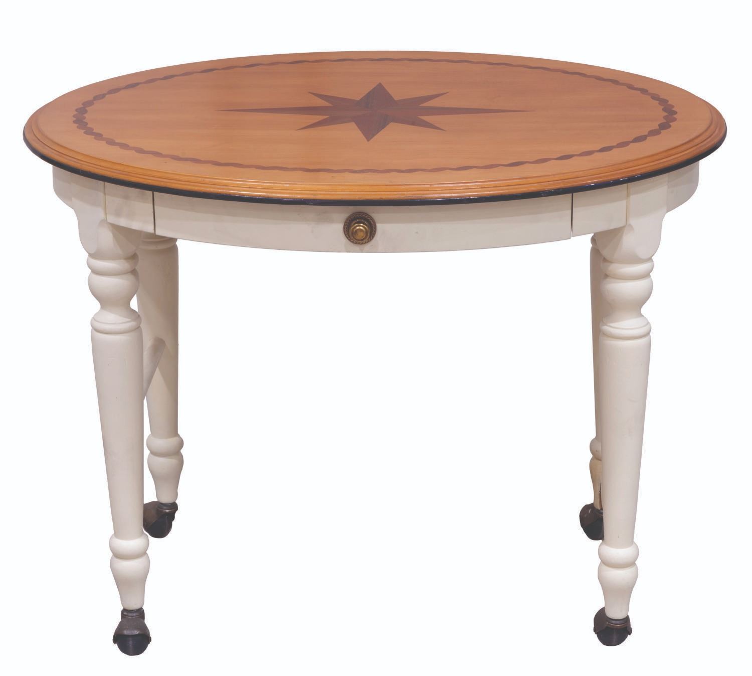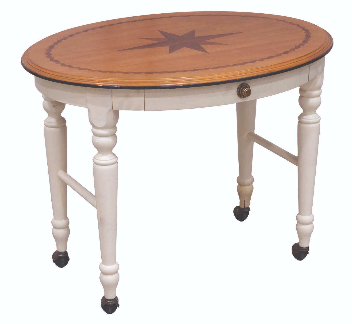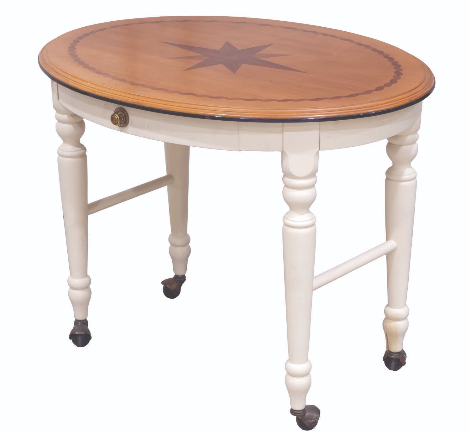 (Disney’s Yacht Club Resort, 1990s-2000s) A Disney’s Yacht Club Resort guest room rolling desk. This stately wooden desk features an eight-point compass design and a wheel at the bottom of each leg. Measuring 28.5” tall and 28.25” x 37.25”, the desk is in good condition with scratches, scuffs, and stains from Resort use, and one of the legs has been repaired. Due to size and weight, this item requires special shipping arrangements. Please inquire before bidding.