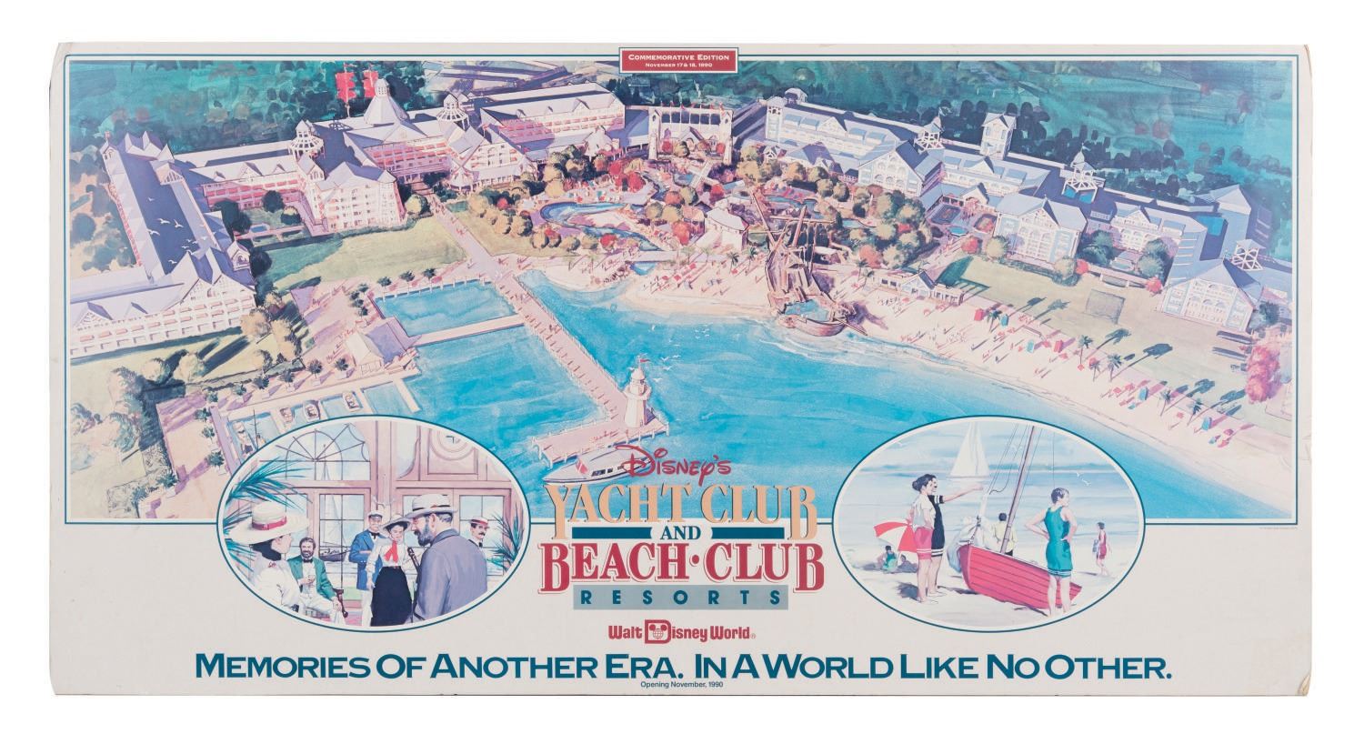 (Walt Disney World, 1989) A sign promoting a commemorative edition poster print for Disney's Yacht Club and Beach Club Resorts at Walt Disney World. Measuring 33.25"x17.25", the sign is in very good overall condition, despite minor fading and wear to edges and corners.