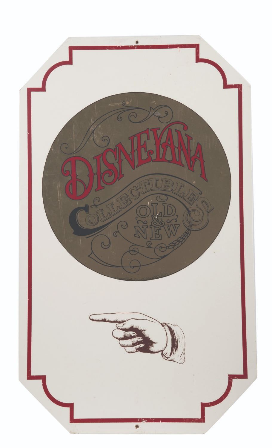 (Disneyland, 1990s) An original sign directing Guests towards the Disneyana shop on Main Street, U.S.A. The Disneyana Shop opened in 1976 selling vintage Disney collectibles but due to difficulty stocking the shop, it switched to limited editions and current merchandise before closing in April 2013. Measuring 18” x 30”, the sign is in good condition with scuffs, scratches, and wear from Park use.
