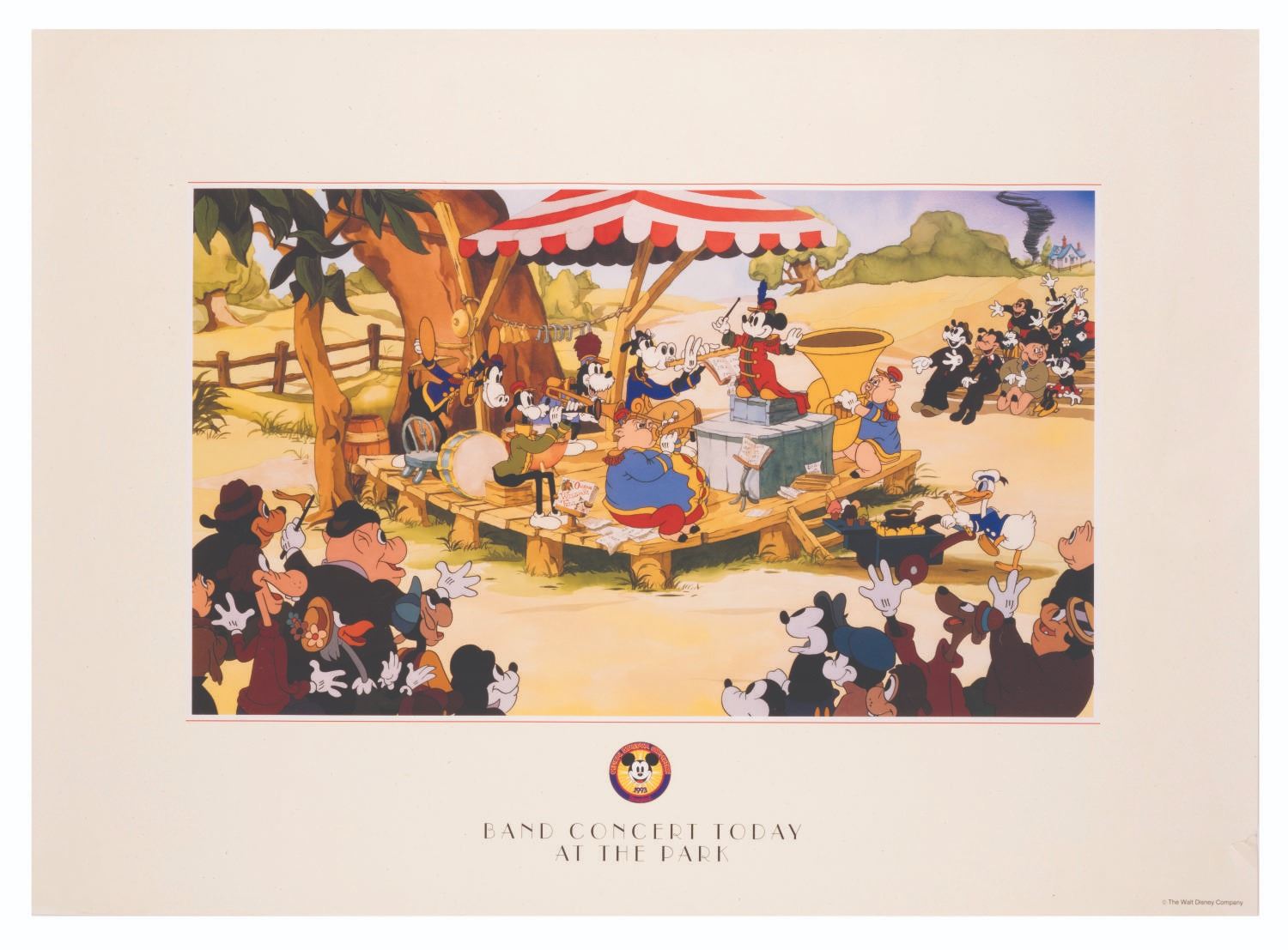 (Disneyana, 1993) A "Band Concert Today in the Park" poster from the 1993 Disneyana convention. Measuring 17.75" x 24.5", the poster is in good condition with intentional soiling distress to the border, edge wear, creasing, and a small tear along the right edge.