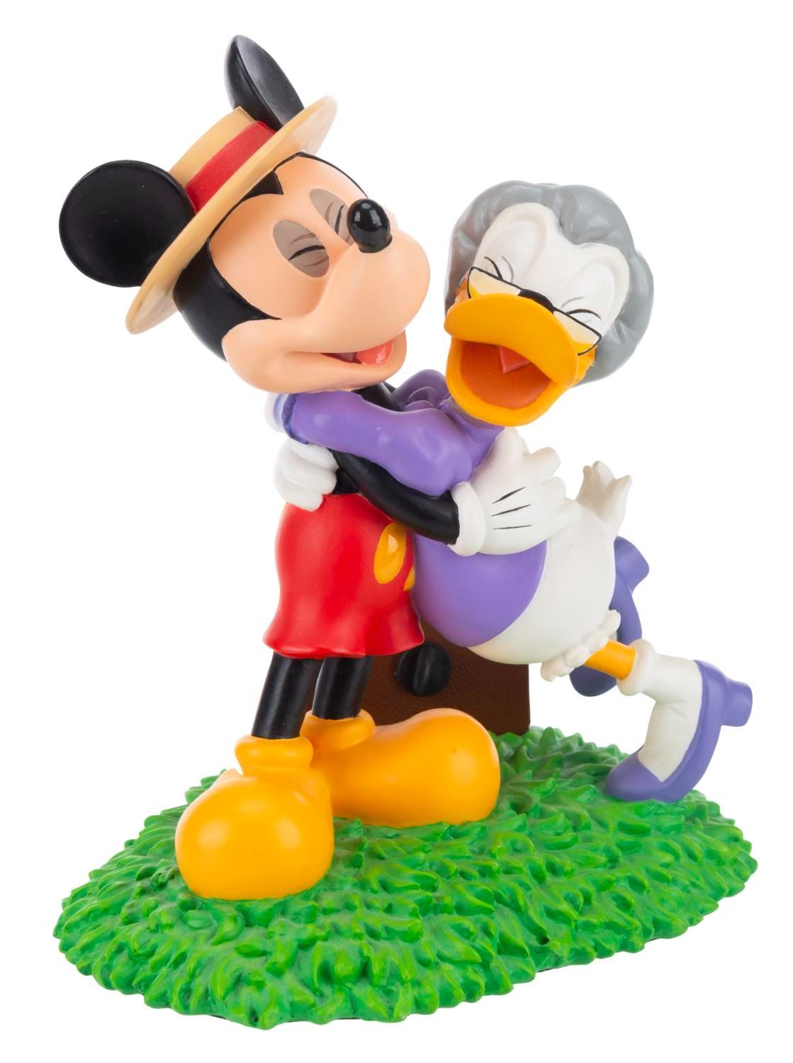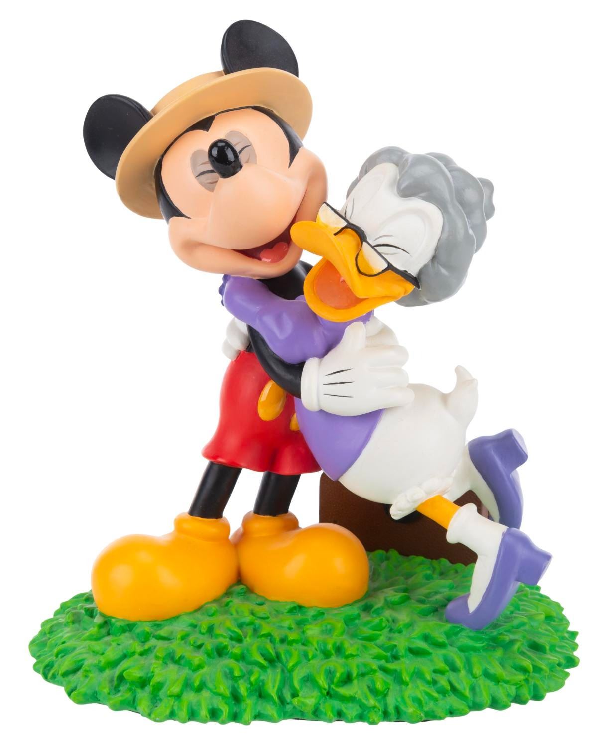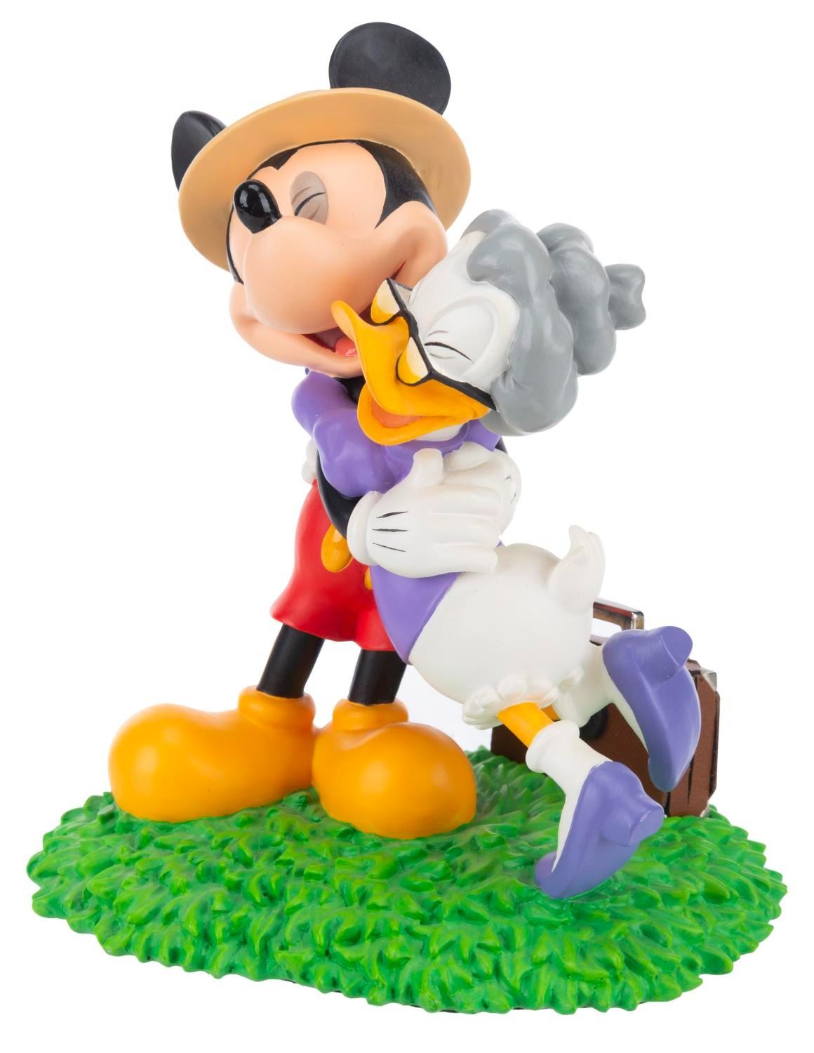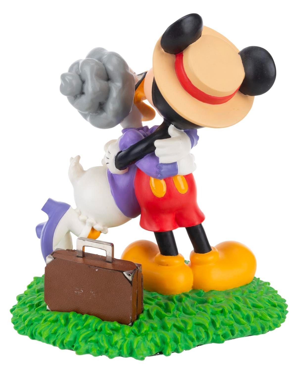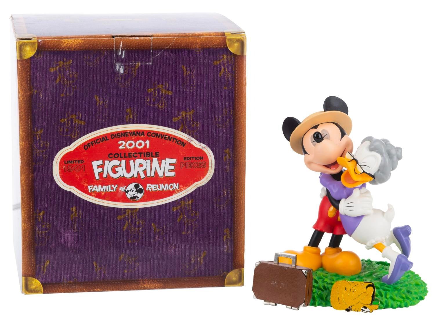 (Disney, 2001) A figurine of Mickey on a railroad handcar with a watch. The resin figurine was released at the 10th Official Disneyana convention and was limited to an edition of 750. Measuring 5.5” x 6.75” x 6.5”, the figurine is in fine condition. Measuring 1.25” in diameter and 9.25” long on a leather band, the watch displays in good condition with splitting and deterioration to the band from age and in need of a battery or servicing to function. Both are packaged in the original 7.5” x 9” x 9” box.