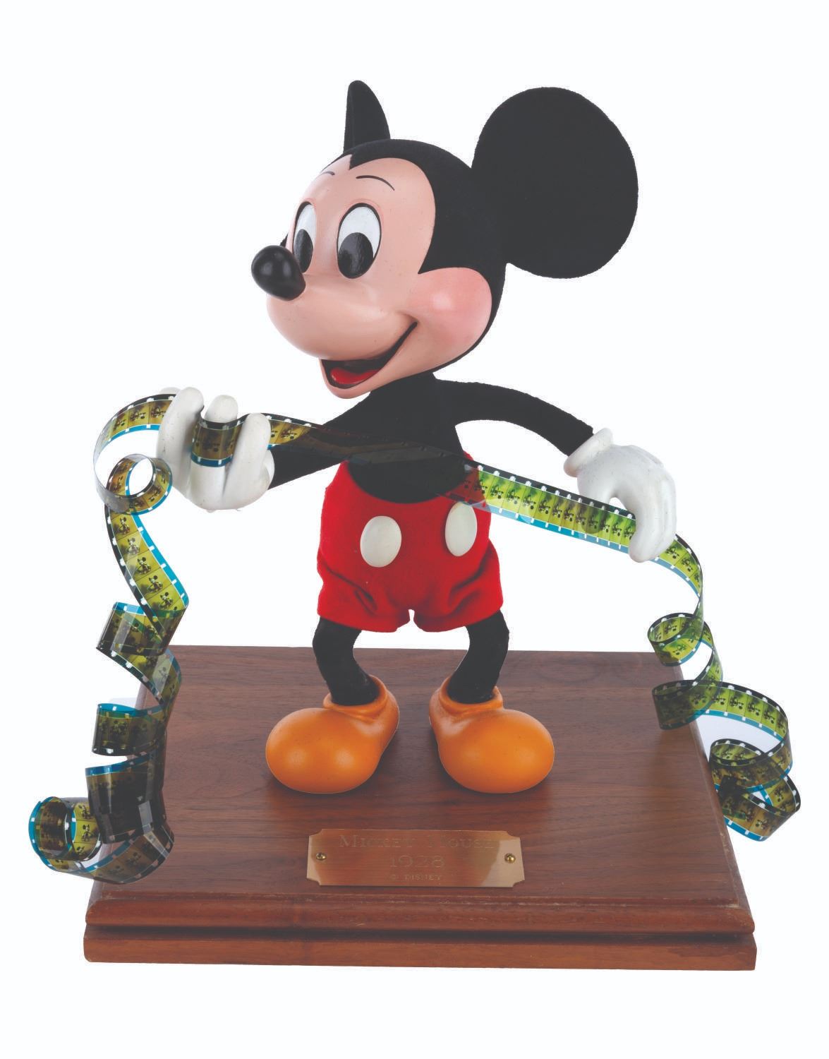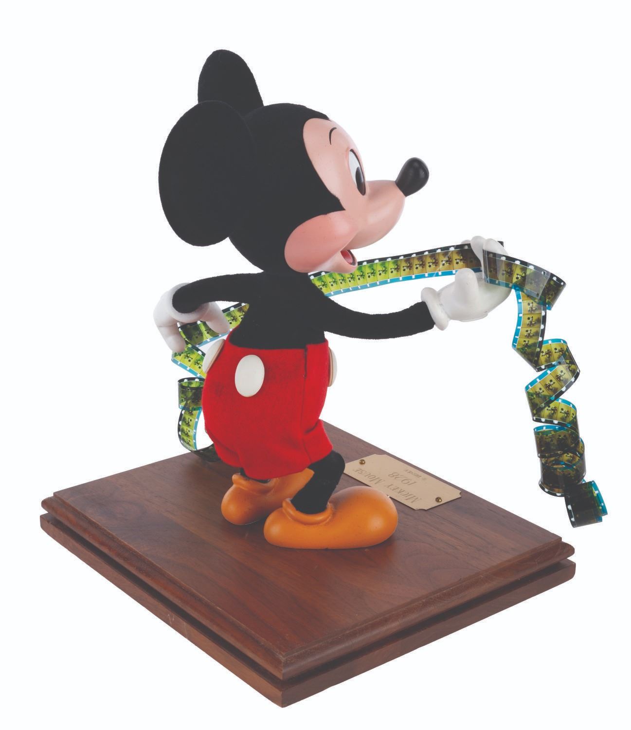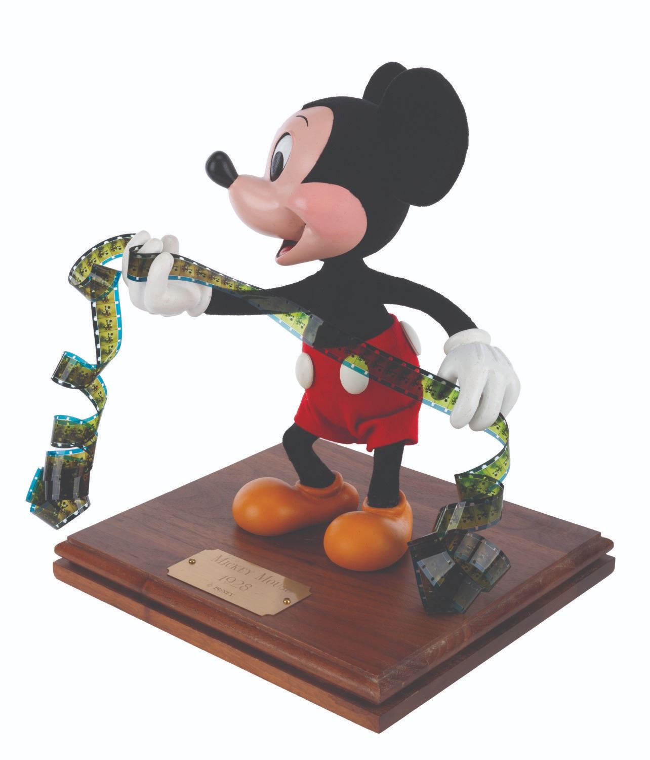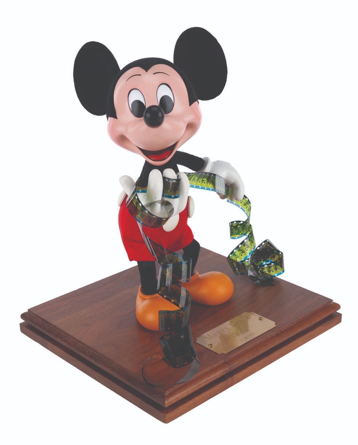 (Disney, 1970s-80s) A hand-made display figure of Mickey Mouse holding a film reel. For a short time, the artists who created Main Street Emporium window dioramas produced an extremely limited number of figures for direct sale through the Disneyana Shop on Main Street in Disneyland. This figure has a custom base with a plaque that reads “Mickey Mouse, 1928”, and is signed on the bottom by ten Disney Cast Members. Measuring 9” x 10” tall atop the 1” x 8.25” x 9.25” wooden base, the figure displays in very good condition with light scuffs to the top and side of the base, very minor scuffs and scratches to the plaque, and repairs to the figure.