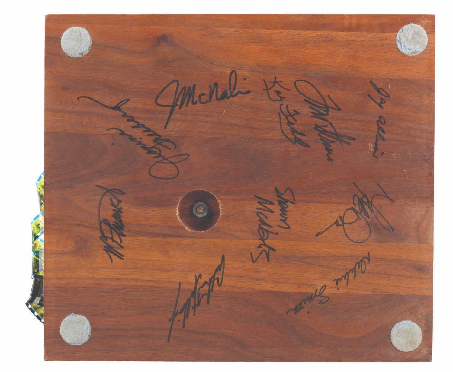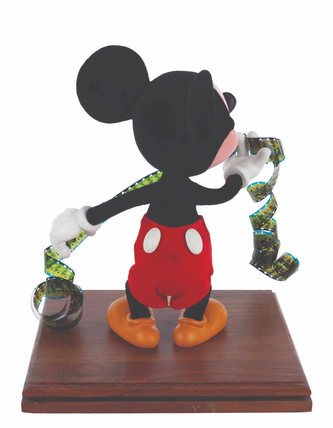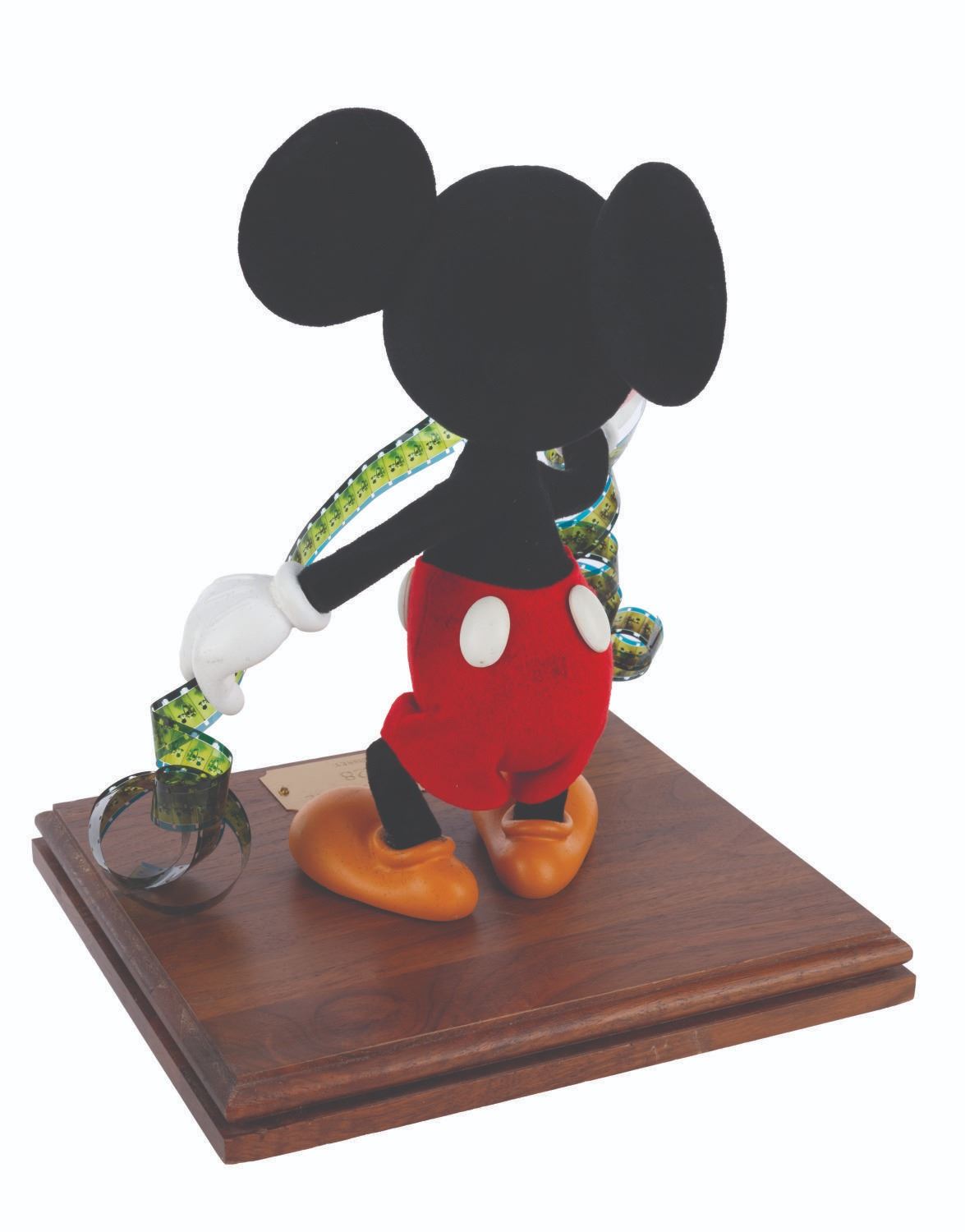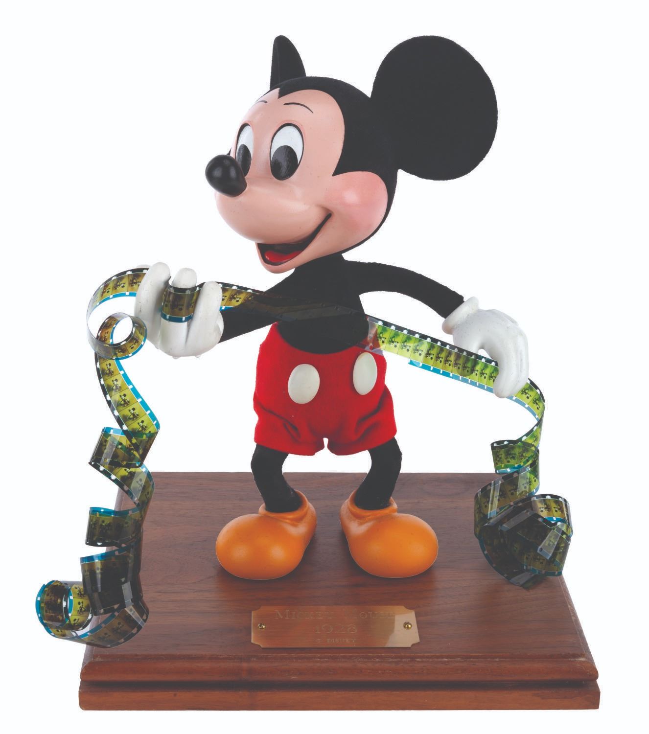 (Disney, 1970s-80s) A hand-made display figure of Mickey Mouse holding a film reel. For a short time, the artists who created Main Street Emporium window dioramas produced an extremely limited number of figures for direct sale through the Disneyana Shop on Main Street in Disneyland. This figure has a custom base with a plaque that reads “Mickey Mouse, 1928”, and is signed on the bottom by ten Disney Cast Members. Measuring 9” x 10” tall atop the 1” x 8.25” x 9.25” wooden base, the figure displays in very good condition with light scuffs to the top and side of the base, very minor scuffs and scratches to the plaque, and repairs to the figure.