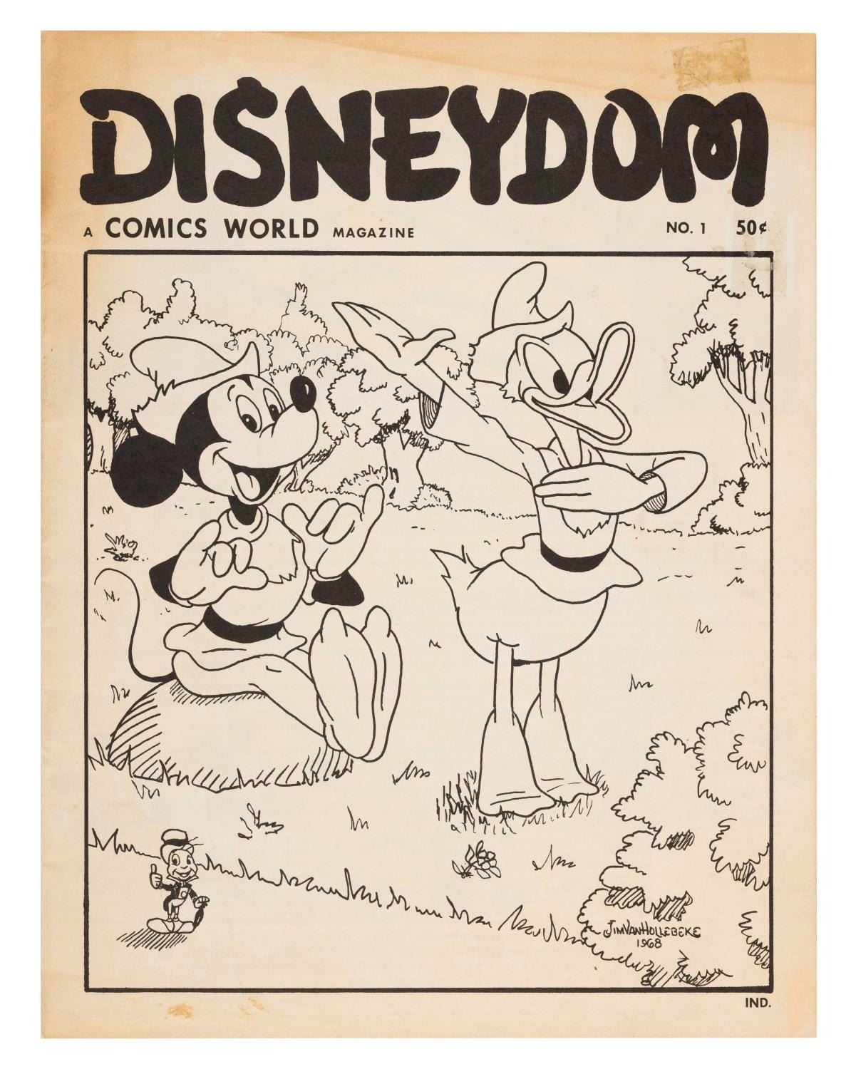 (Dan MacAvoy, 1969) The premiere issue of Disneydom, an early fan magazine for all things Disney. Contents include an article on Carl Barks, "The Way To Tour Disneyland," and a story on Mickey Mouse's 40th birthday. Measuring 8.5" x 11", the magazine is in very good condition with some discoloration to the cover from age and a spot of price sticker residue.