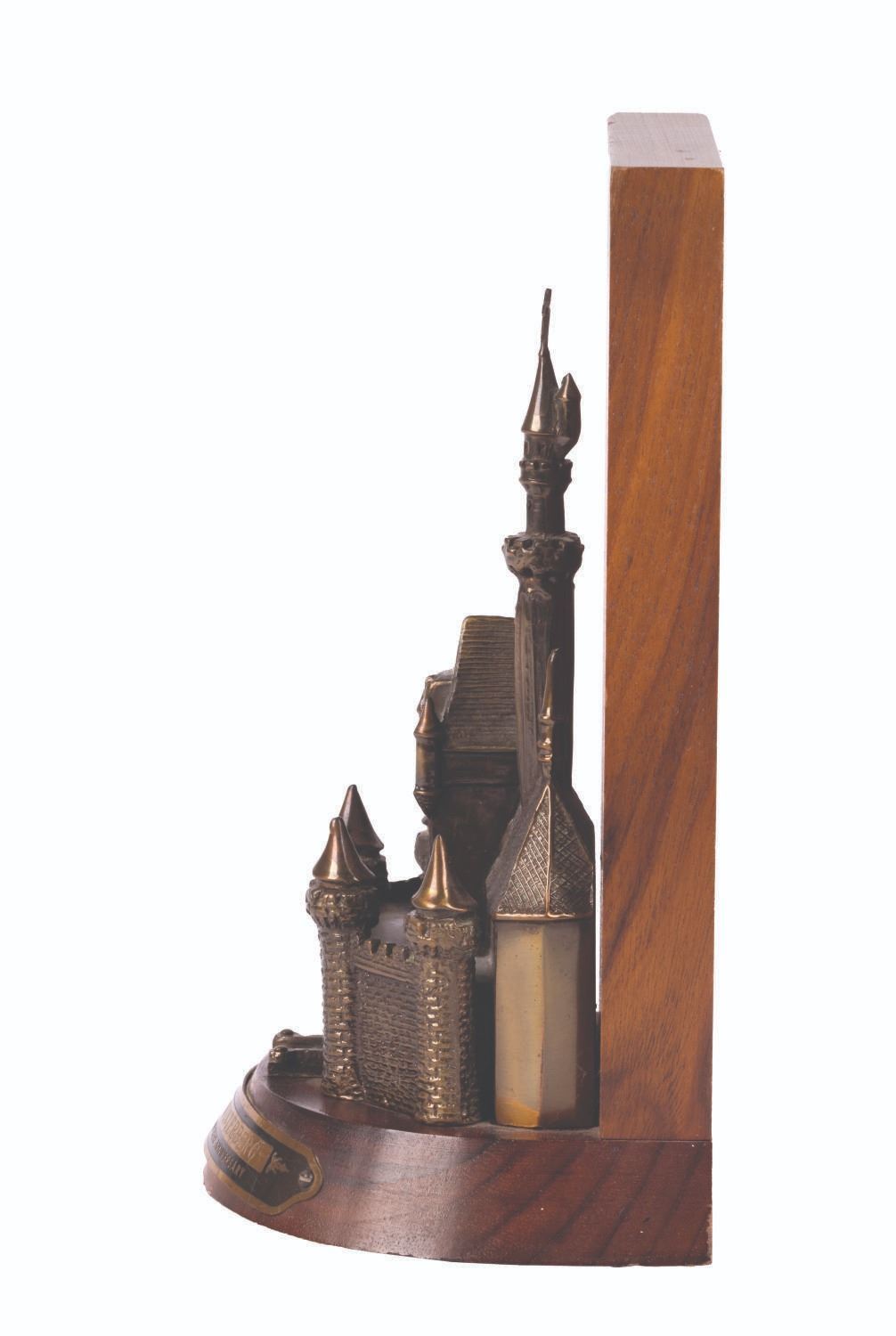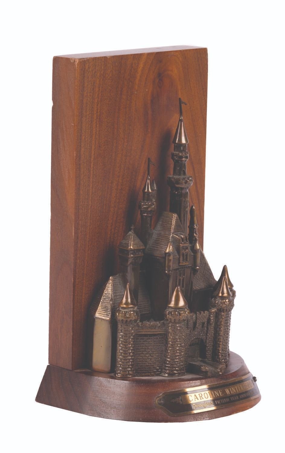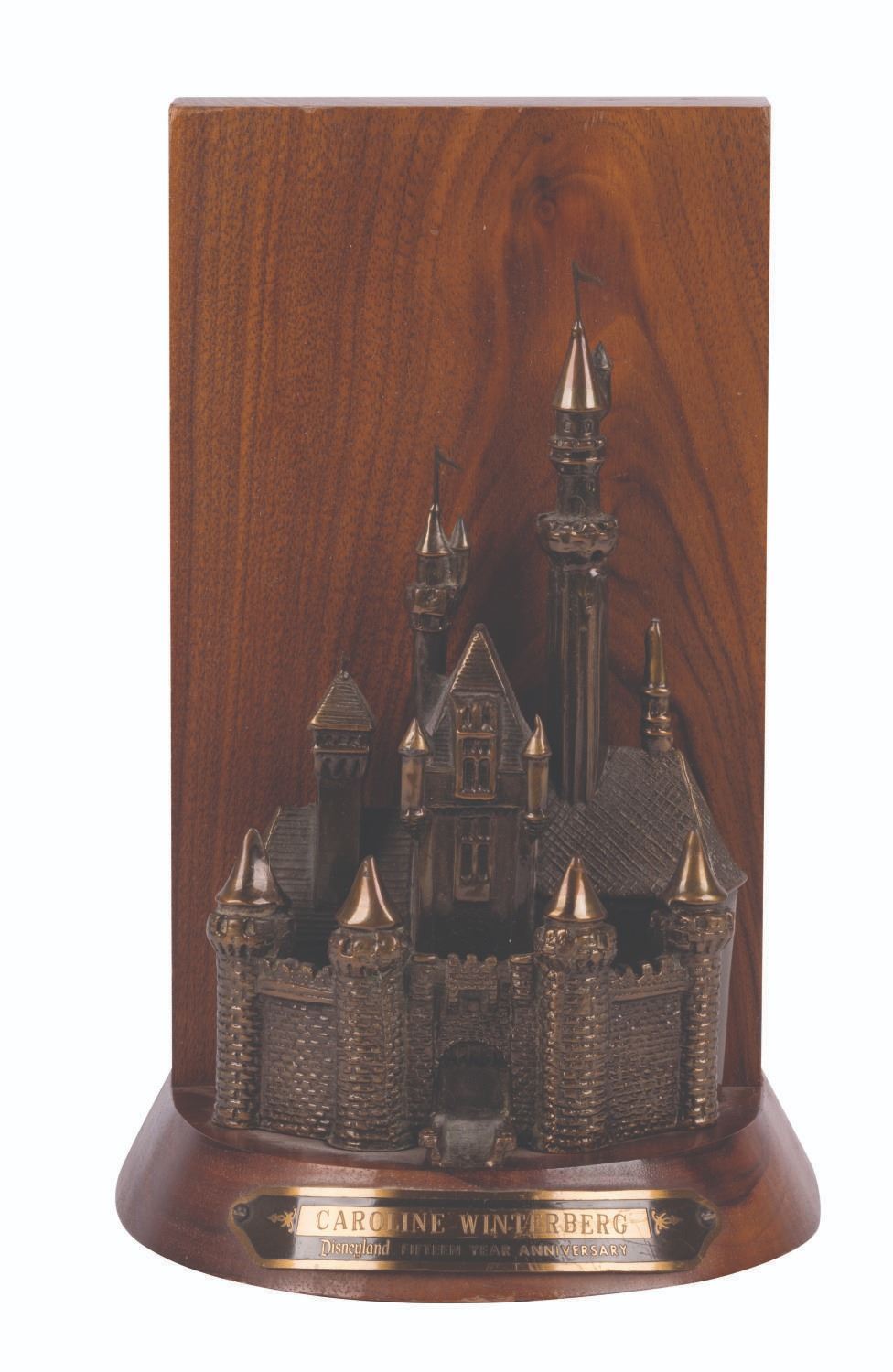 (Disneyland, 1970s) A 15-year Cast Member service award, given to Caroline Winterberg, who worked in Main Street Theme Park Operations. The award features a figure of Sleeping Beauty Castle with a wooden backing and base bearing a plaque with her name. Measuring 8" tall and 3.75" deep, the award is in very good condition with minor wear, mainly to the top edges of the back.