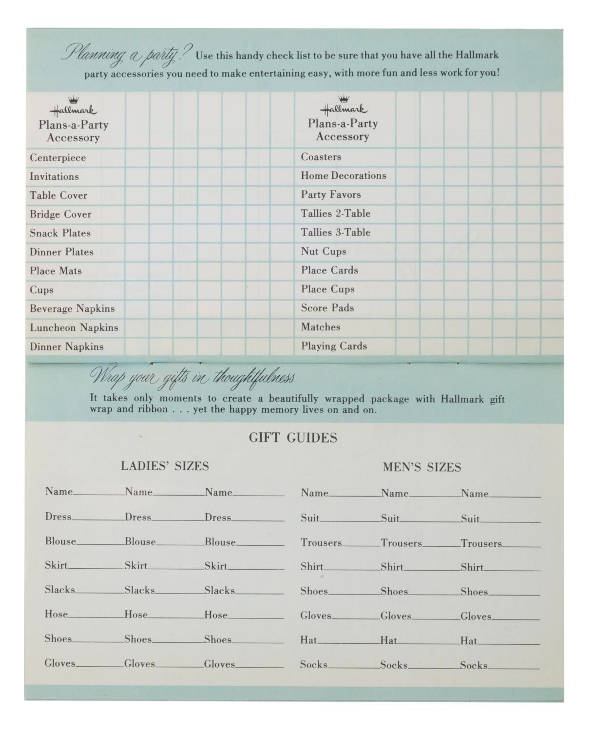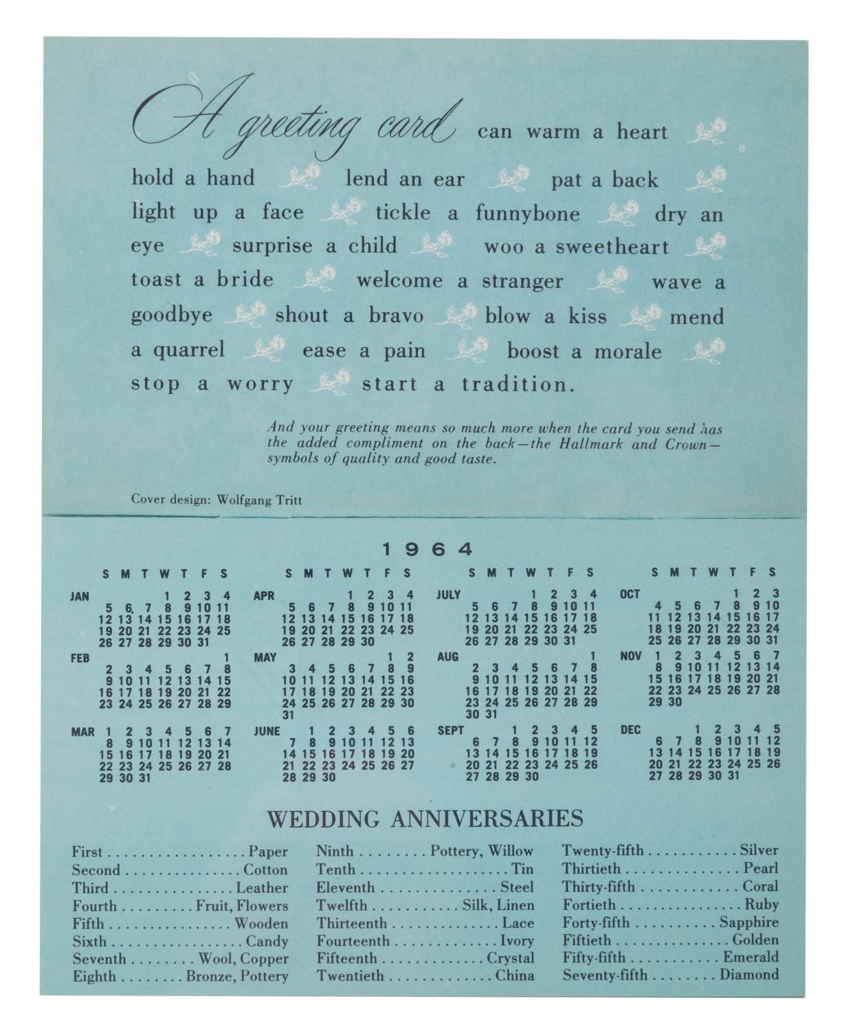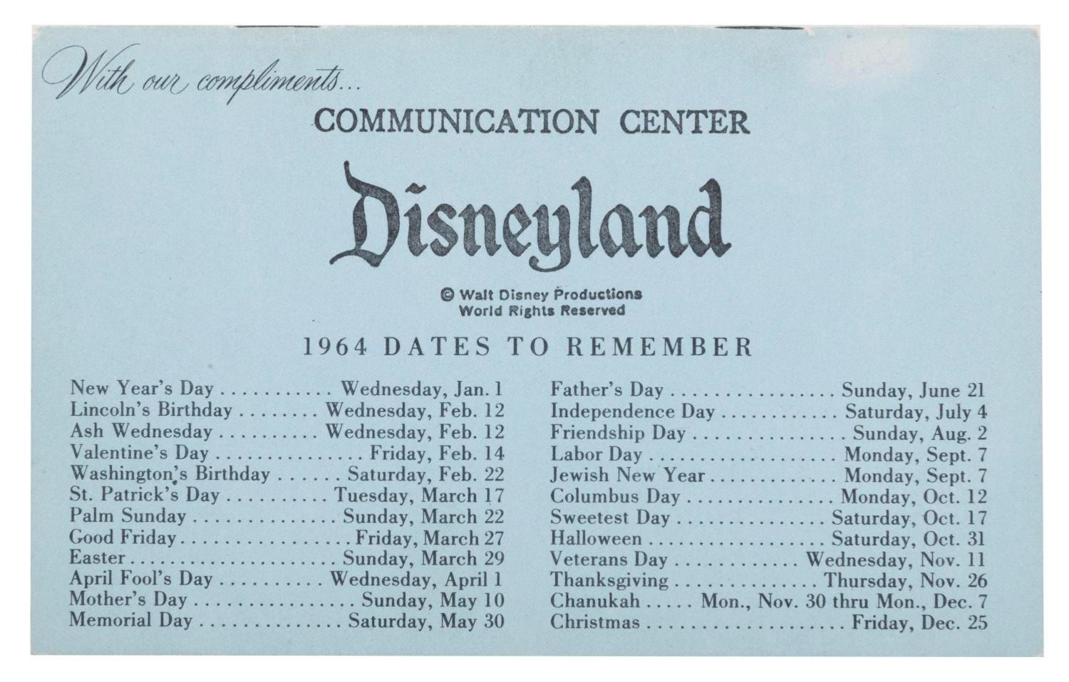 (Disneyland, 1964) A complimentary Hallmark 1964 Date Book from the Hallmark Communication Center on Main Street, U.S.A. The book contains a calendar, address book, party planning and gift guides, and a chart of postal rates. Measuring 3.5” x 5.5”, the date book is in very good condition with light edge wear and light discoloration from age.