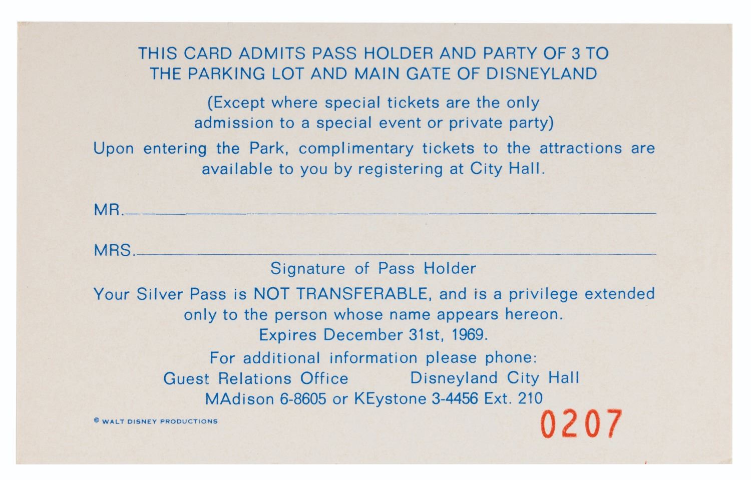 (Disneyland, 1969) A Disneyland silver pass with “Anthony G. Gerard” stamped on the front. Silver passes allowed Cast Members and three guests free parking and admission to the Park. Measuring 2.5” x 4” and numbered 0207, the pass is in very good condition with light edge wear.