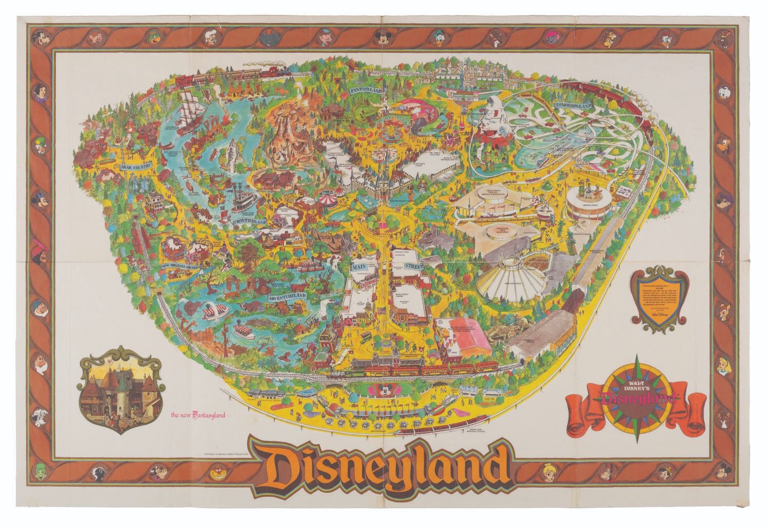 (Disneyland, 1983) A large souvenir map of Disneyland from 1983, with a graphic promoting the New Fantasyland refurbishment on the bottom left corner. Measuring 29.5" x 44", the map displays in fair condition with discoloration, tape, and tears ranging from 0.25" to 0.5" along the edges, creasing, smudges, heavy wear along the folds with separations at the cross folds, stains on the reverse, and a 1.5" x 0.75" tear to the lower center.