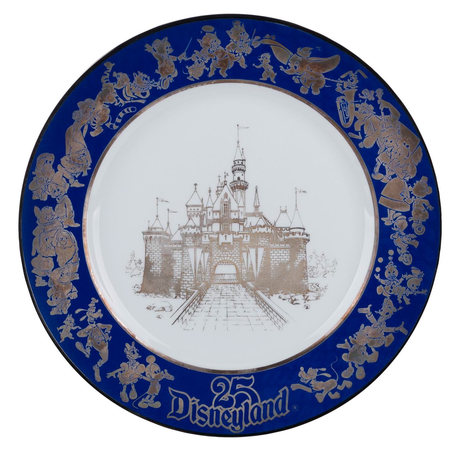 (Disneyland, 1980) A decorative plate commemorating Disneyland's 25th anniversary. The limited edition plate, numbered 2950 on the reverse, features a variety of classic Disney characters around the rim and an image of Sleeping Beauty Castle in the center. Measuring 10.5” in diameter in its original 12.5” x 12.5” box, the plate is in good condition with discoloration on the characters from age.