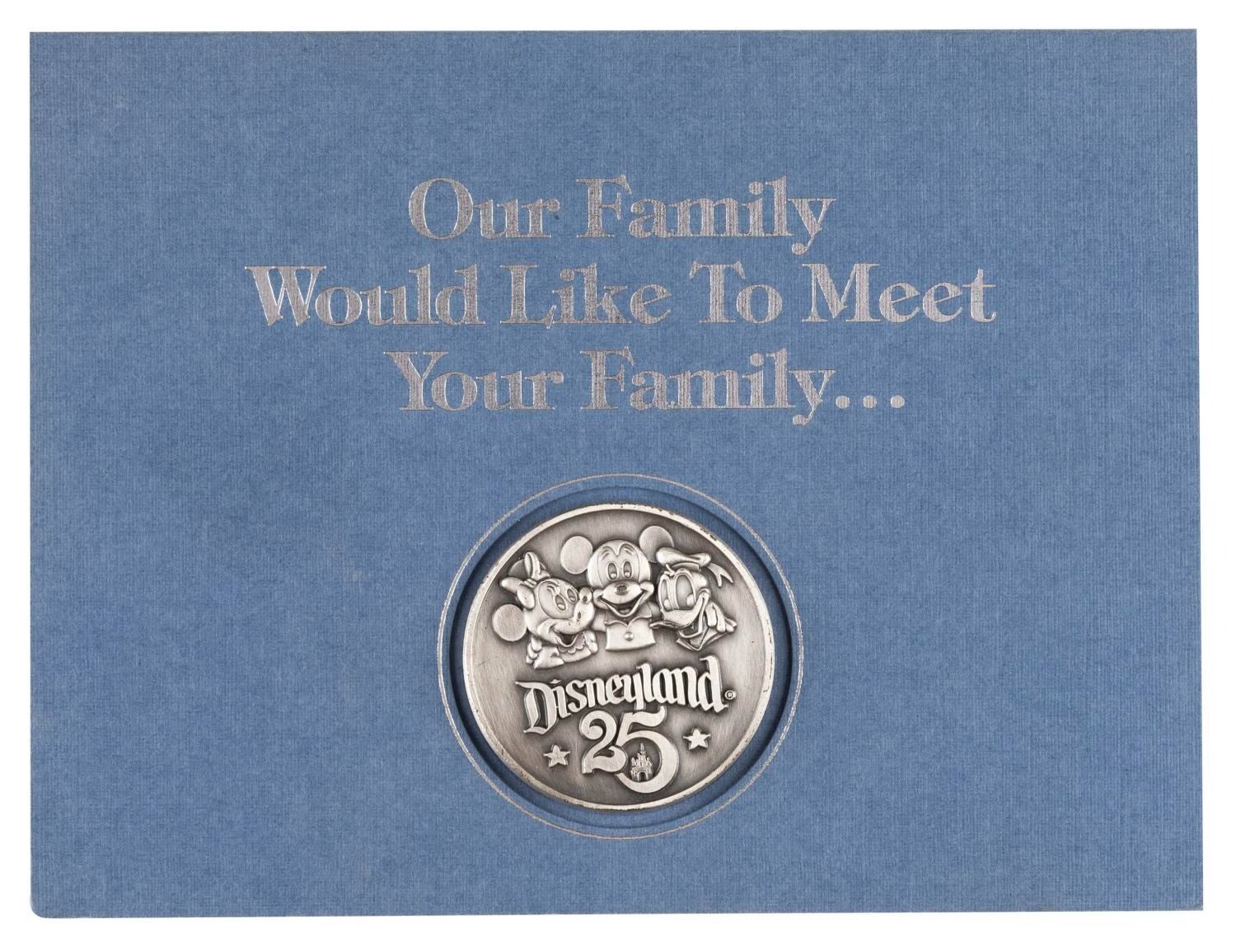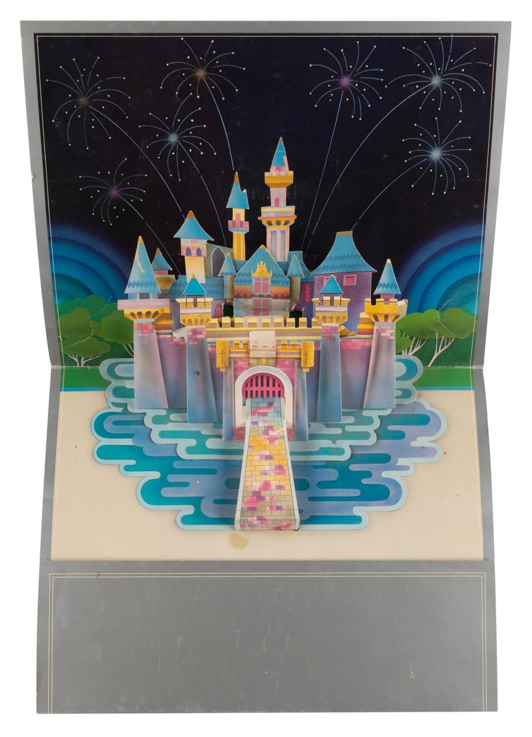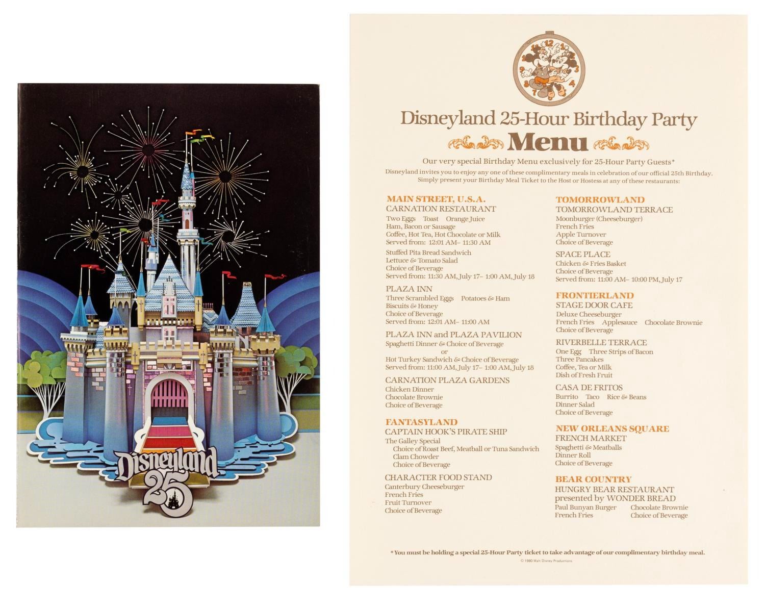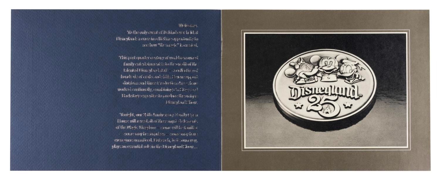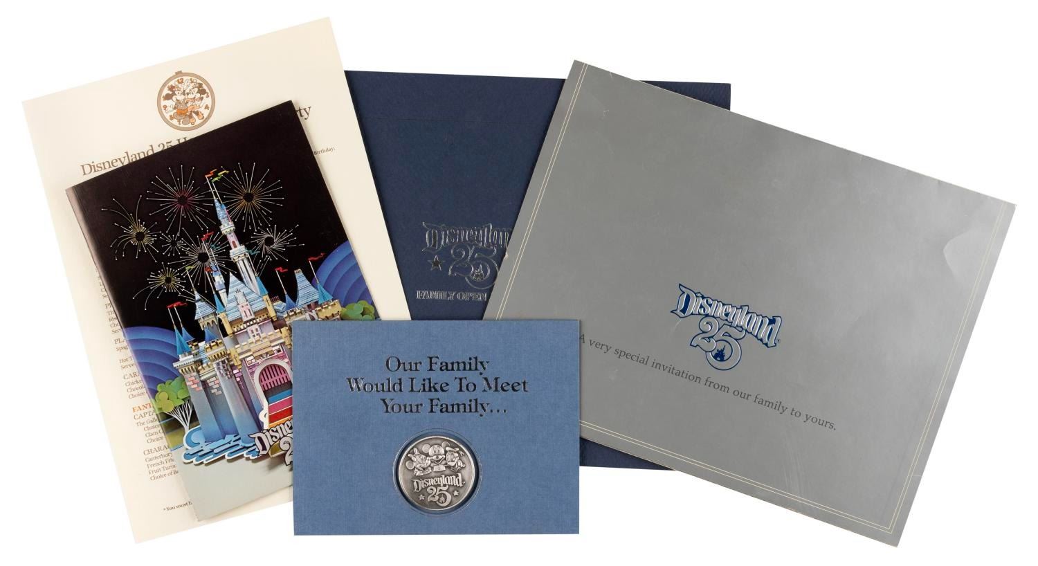 (Disneyland, 1980) A collection of Disneyland 25th anniversary Cast Member Party items including a pop-up castle invitation, menu, entertainment program, souvenir medallion on a card, and a souvenir book outlining the behind-the-scenes areas that will be open for Cast Members and their families to tour. Measuring up to the 8.5" x 11" book, the collection is in fine condition, with the pop-up invitation in good condition with some small creases, wear, and spots of discoloration.
