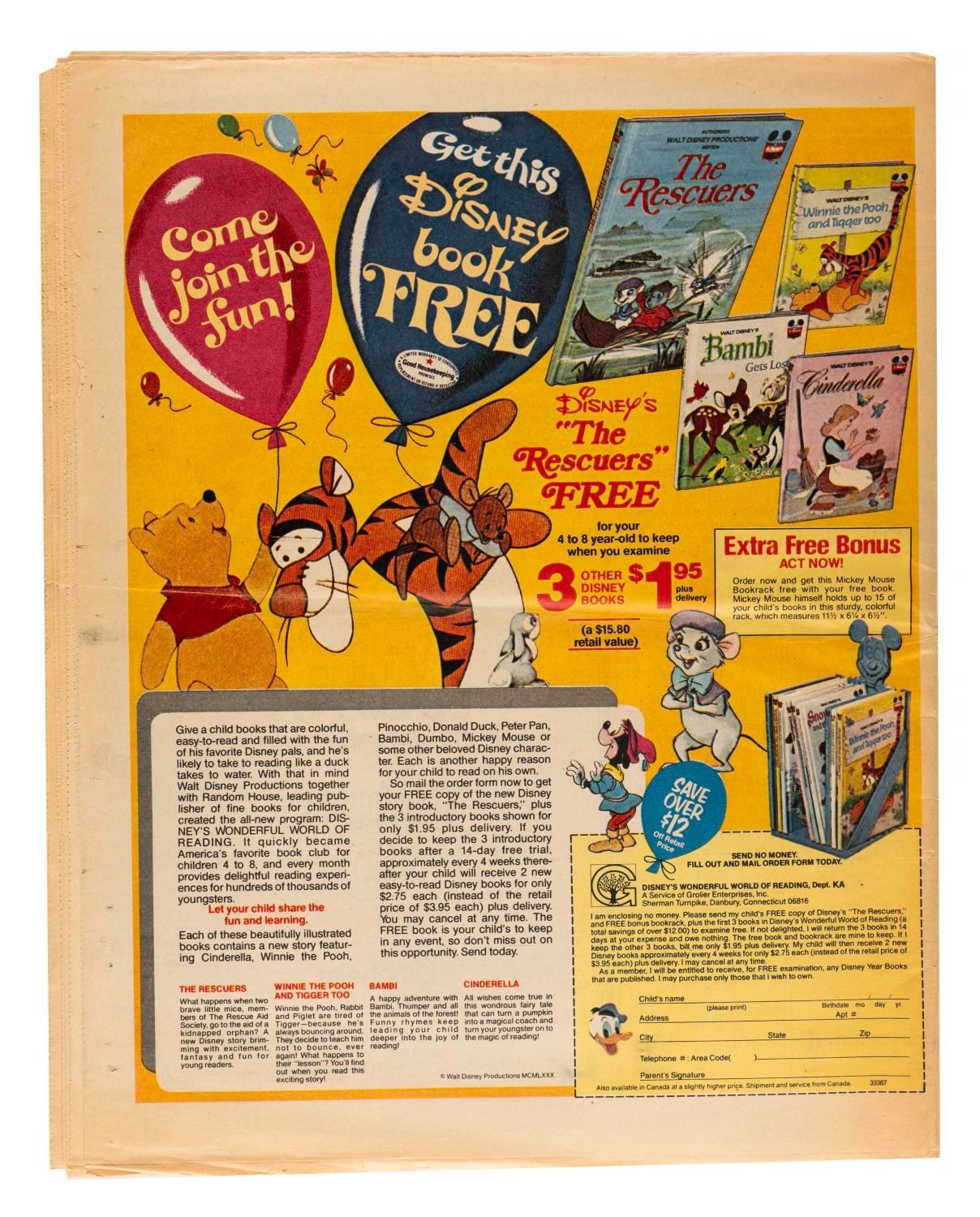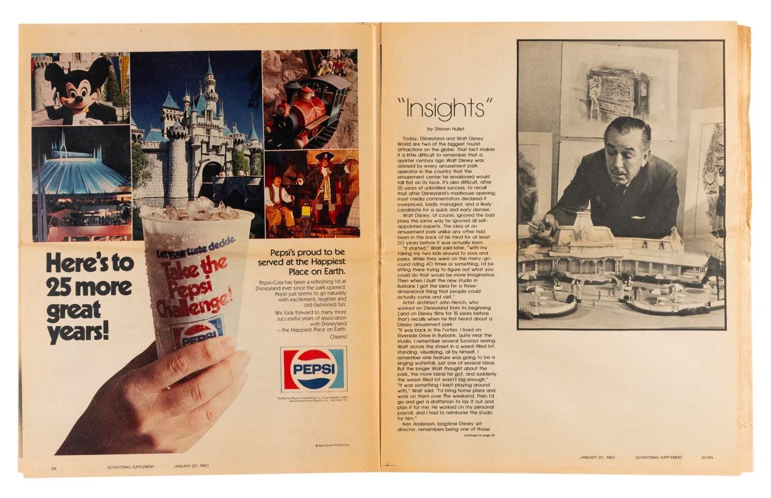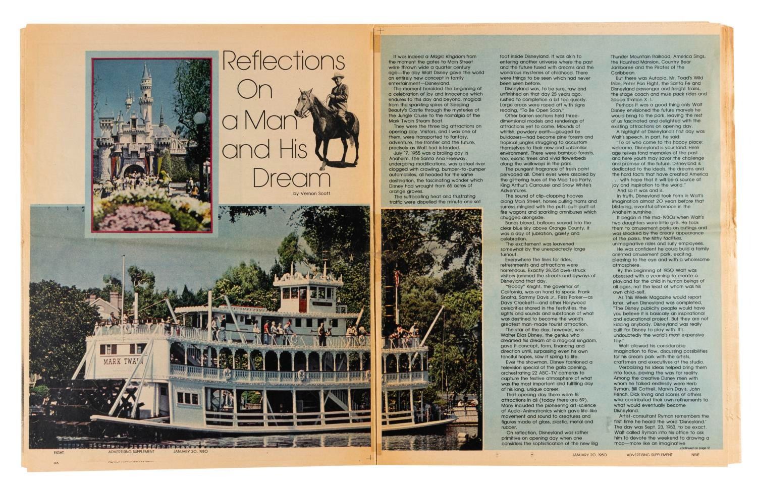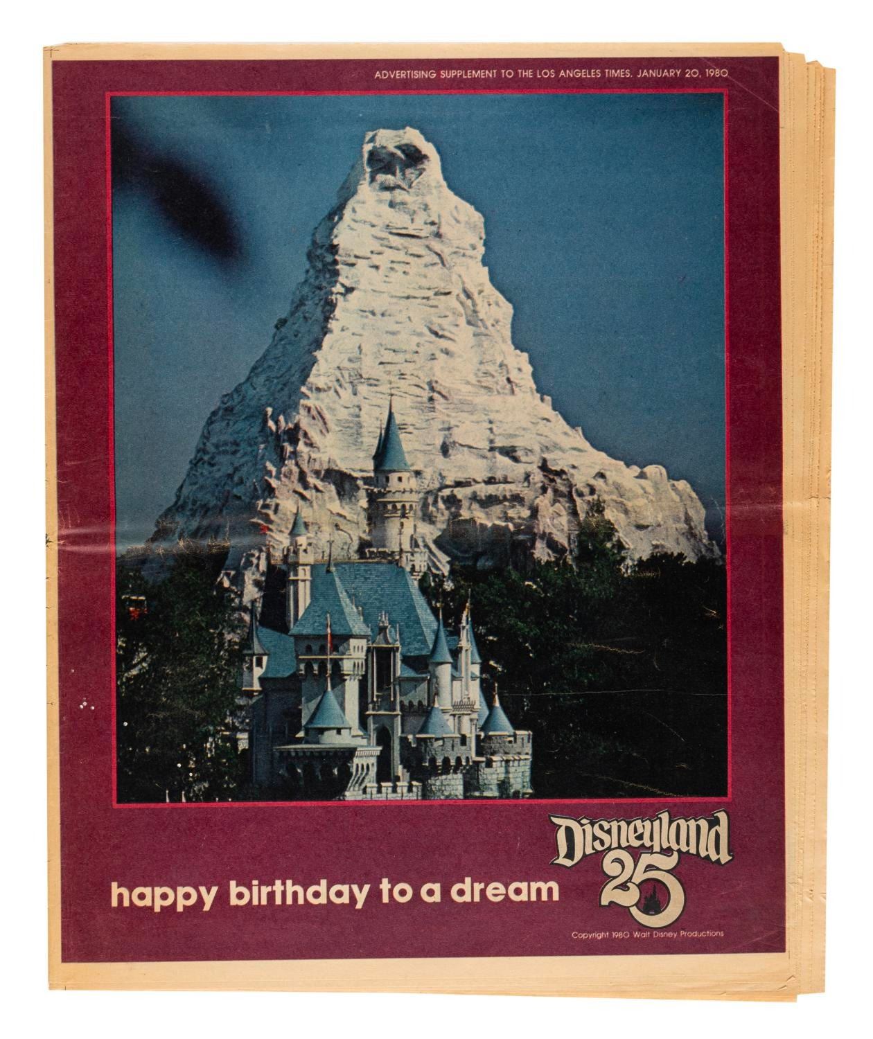 (LA Times, 1980) A supplement to the January 20, 1980 Los Angeles Times newspaper, celebrating Disneyland’s 25th anniversary year. With 32 pages of articles and photographs, the supplement measures 11” x 14” and is in good condition with an original center fold and typical discoloration from age.