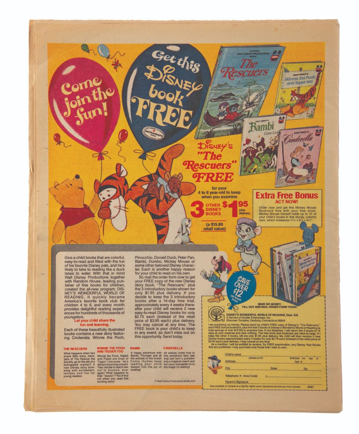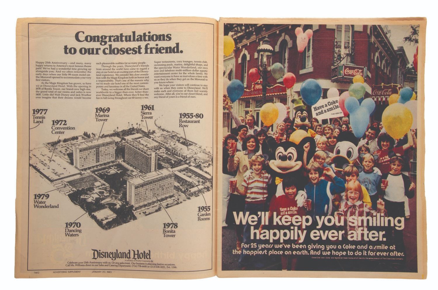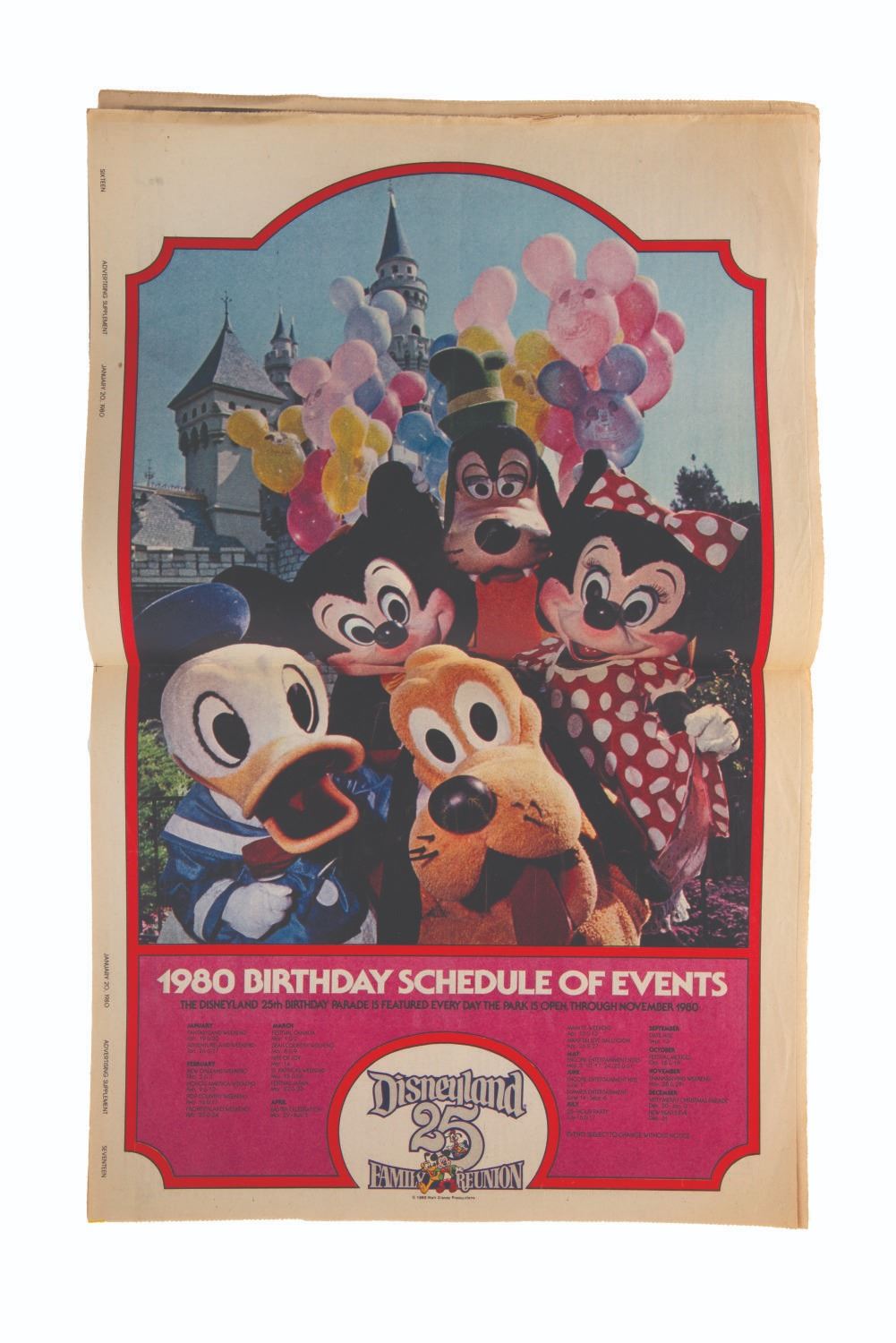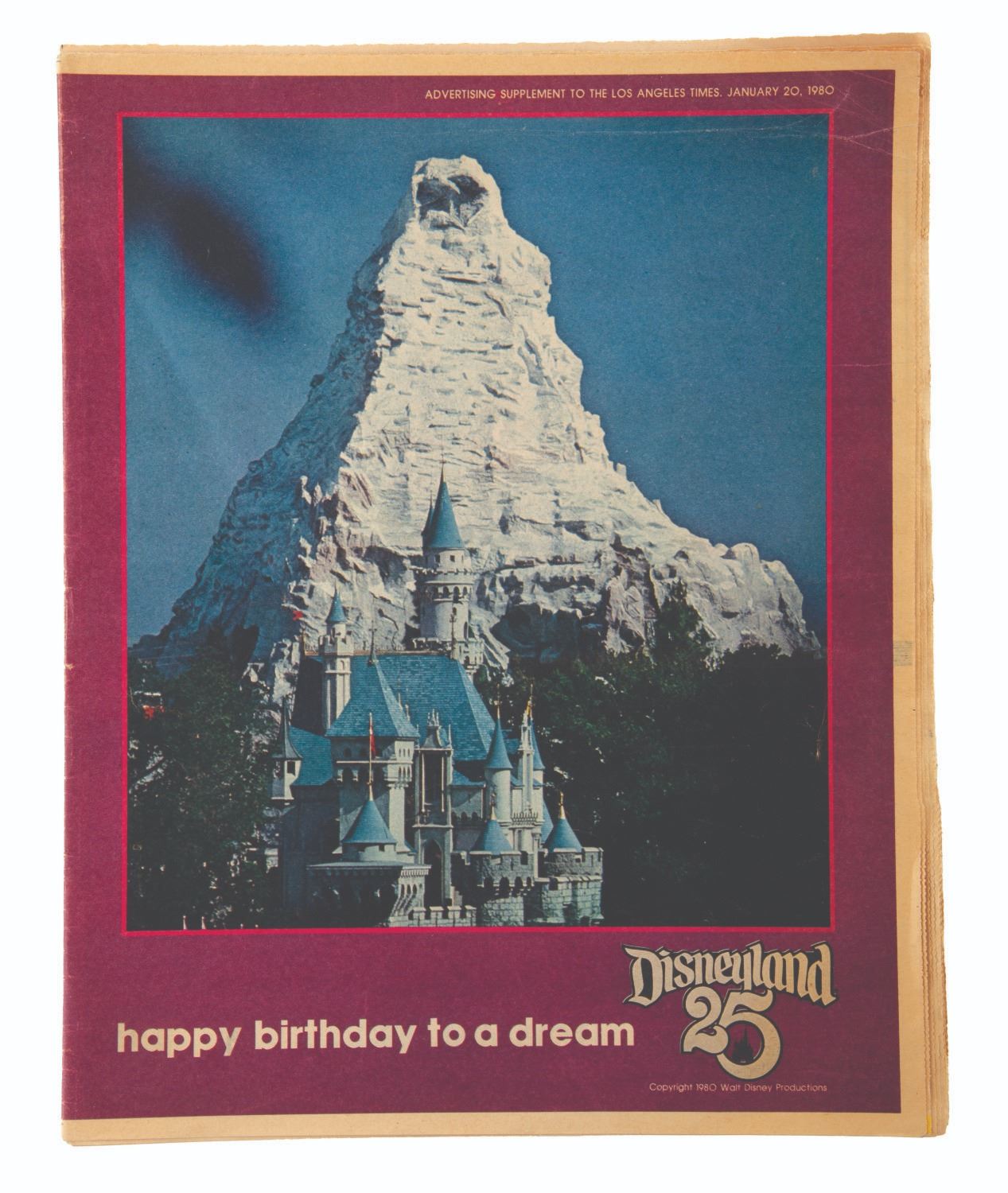 (Disneyland, 1980) A 16-page Los Angeles Times newspaper supplement celebrating Disneyland's 25th anniversary. Measuring 11” x 14” the supplement is in good condition with light edge wear, creasing, and discoloration from age.